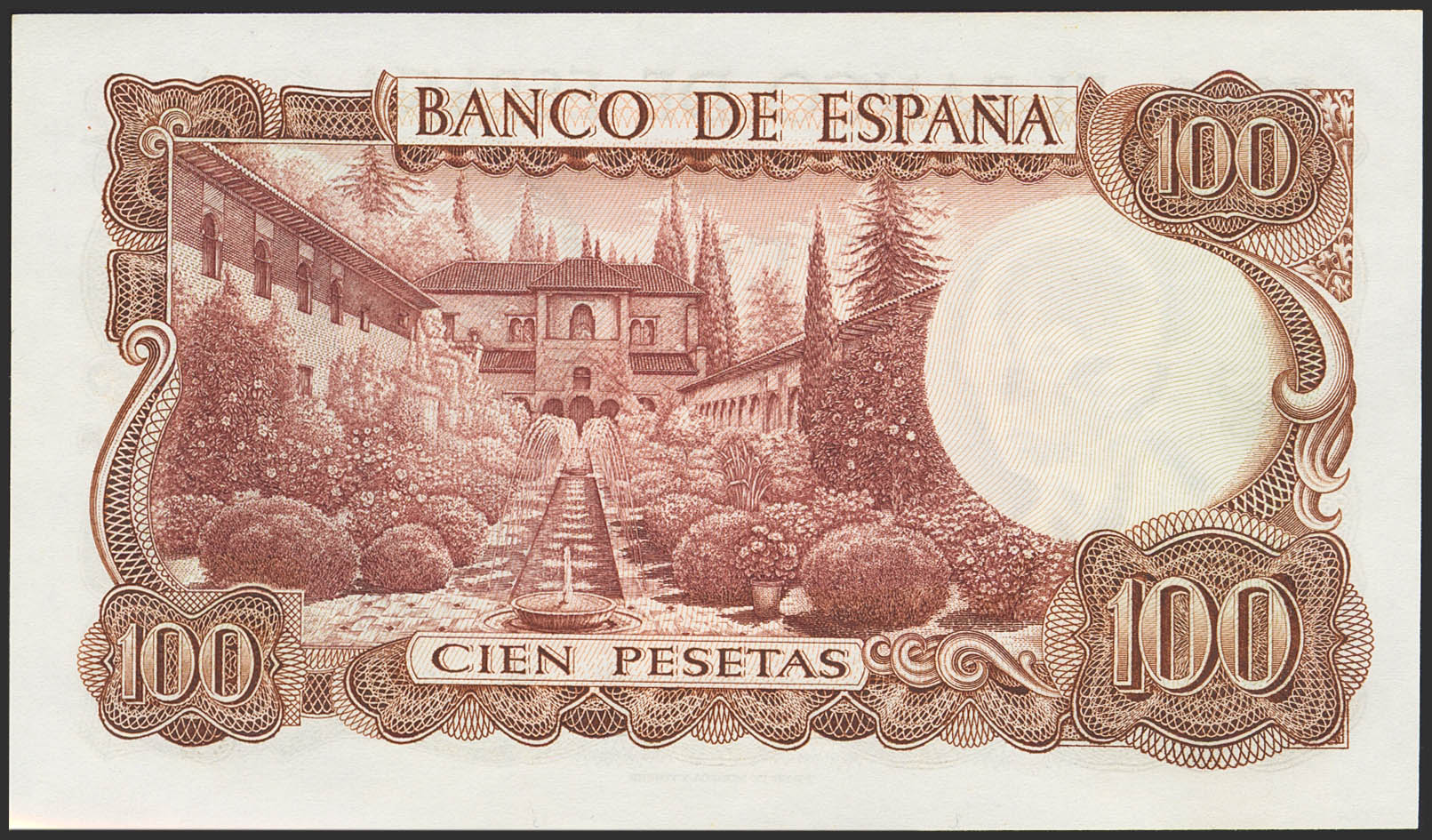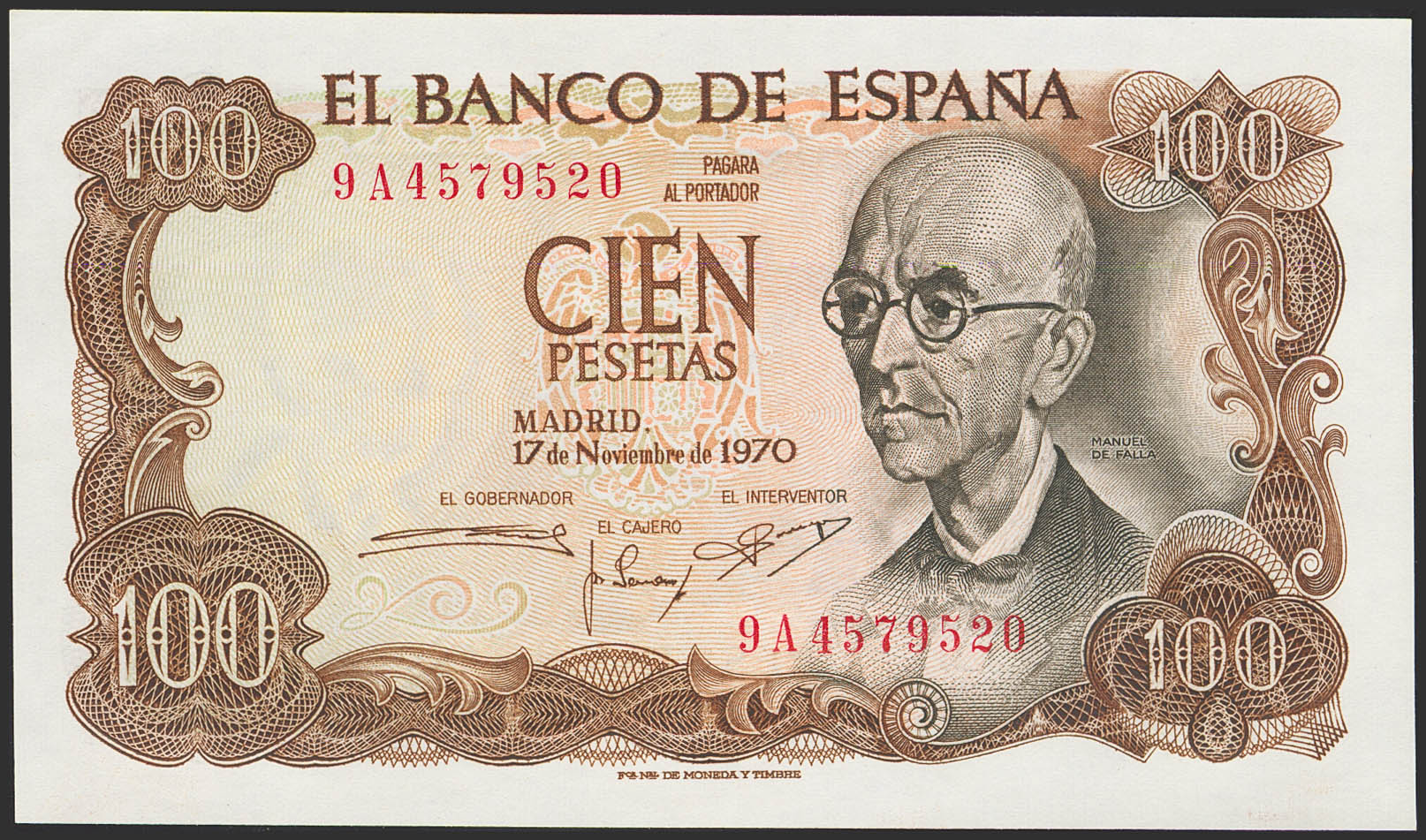 English 100 Pesetas. November 17, 1970. Special series 9A. (Edifil 2023: 472d). Original sizing. Uncirculated.