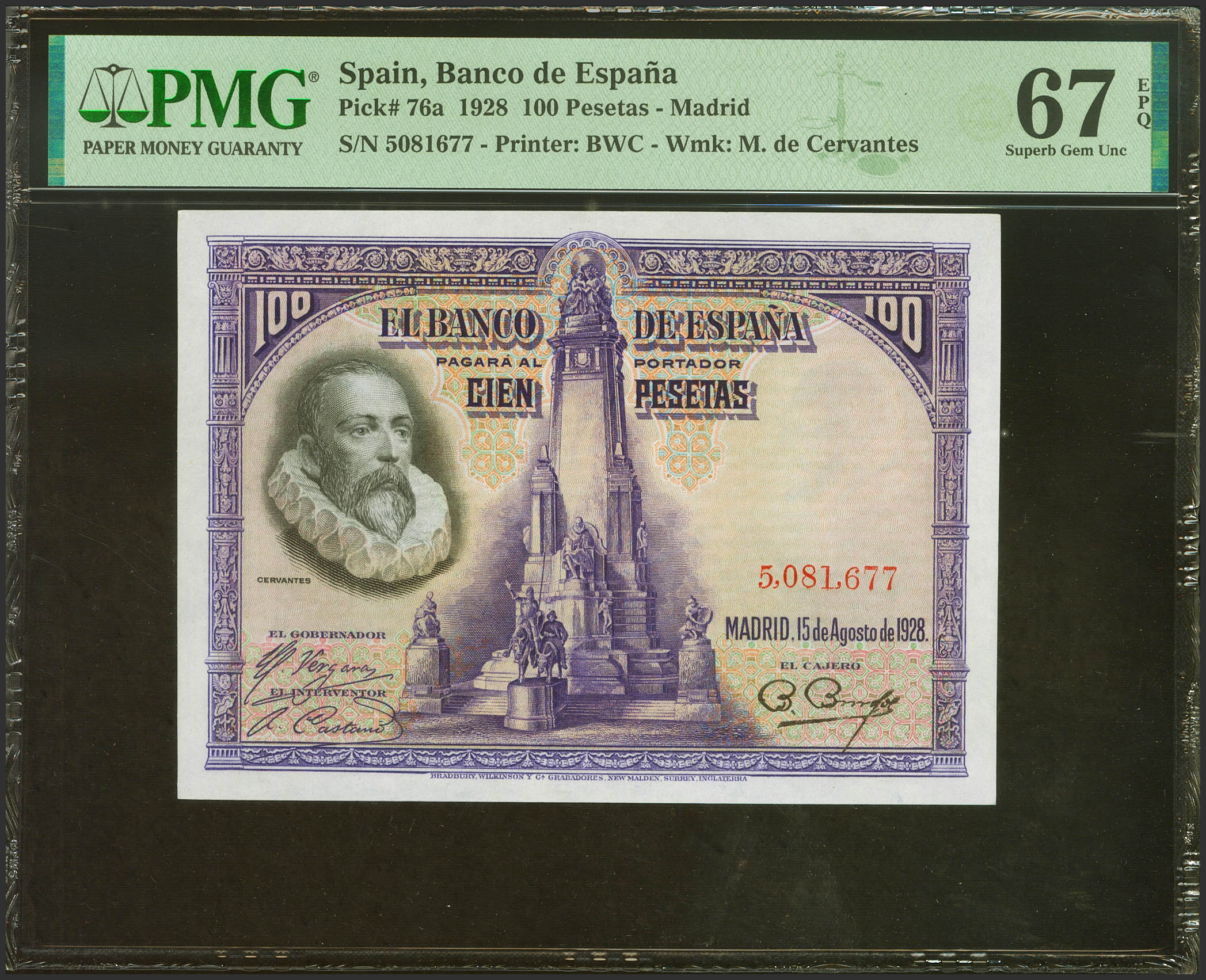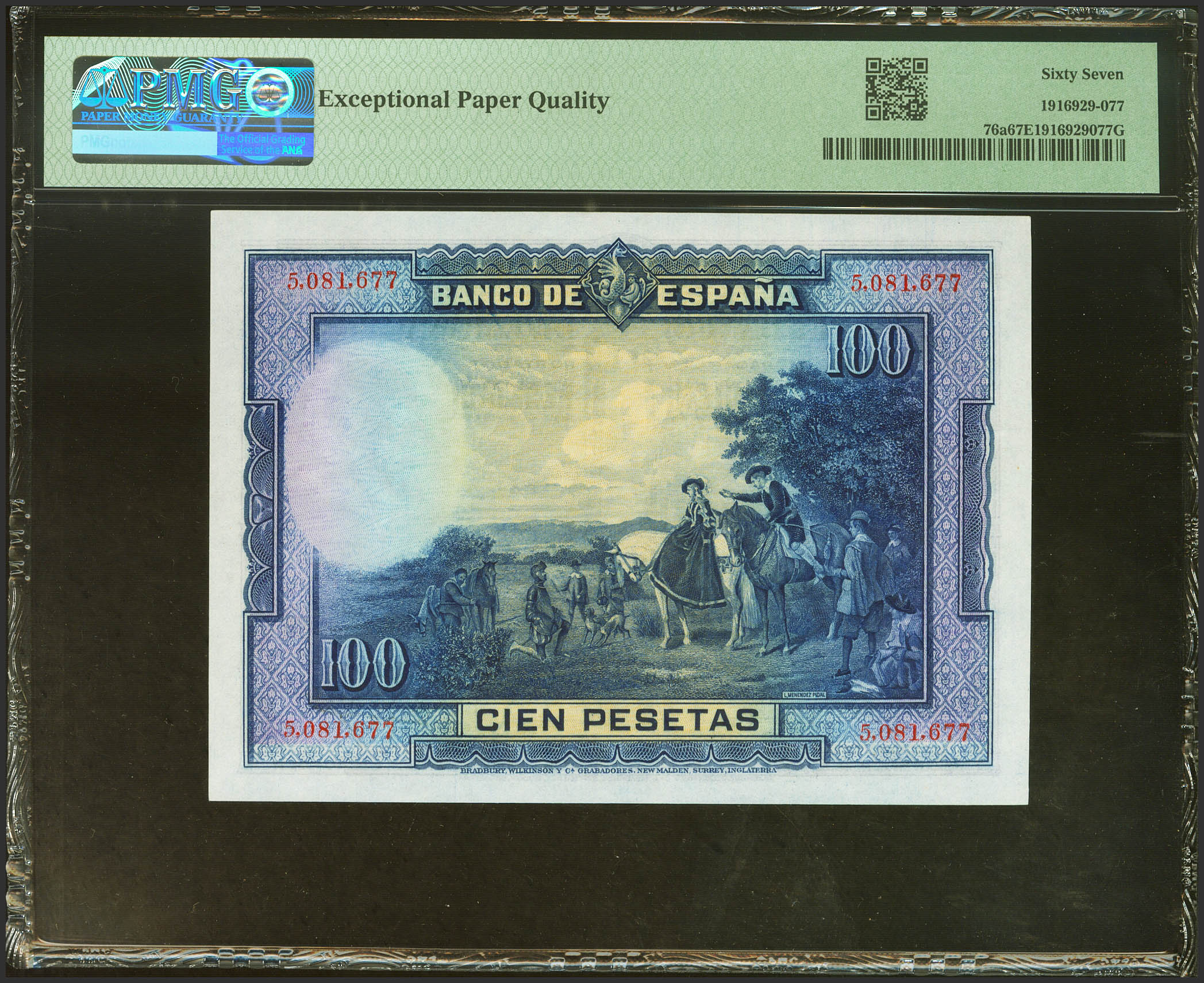 100 Pesetas. August 15, 1928. No series. (Edifil 2023: 355, Pick: 76a). Very rare in this exceptional quality, original sizing. Uncirculated. PMG67EPQ package.