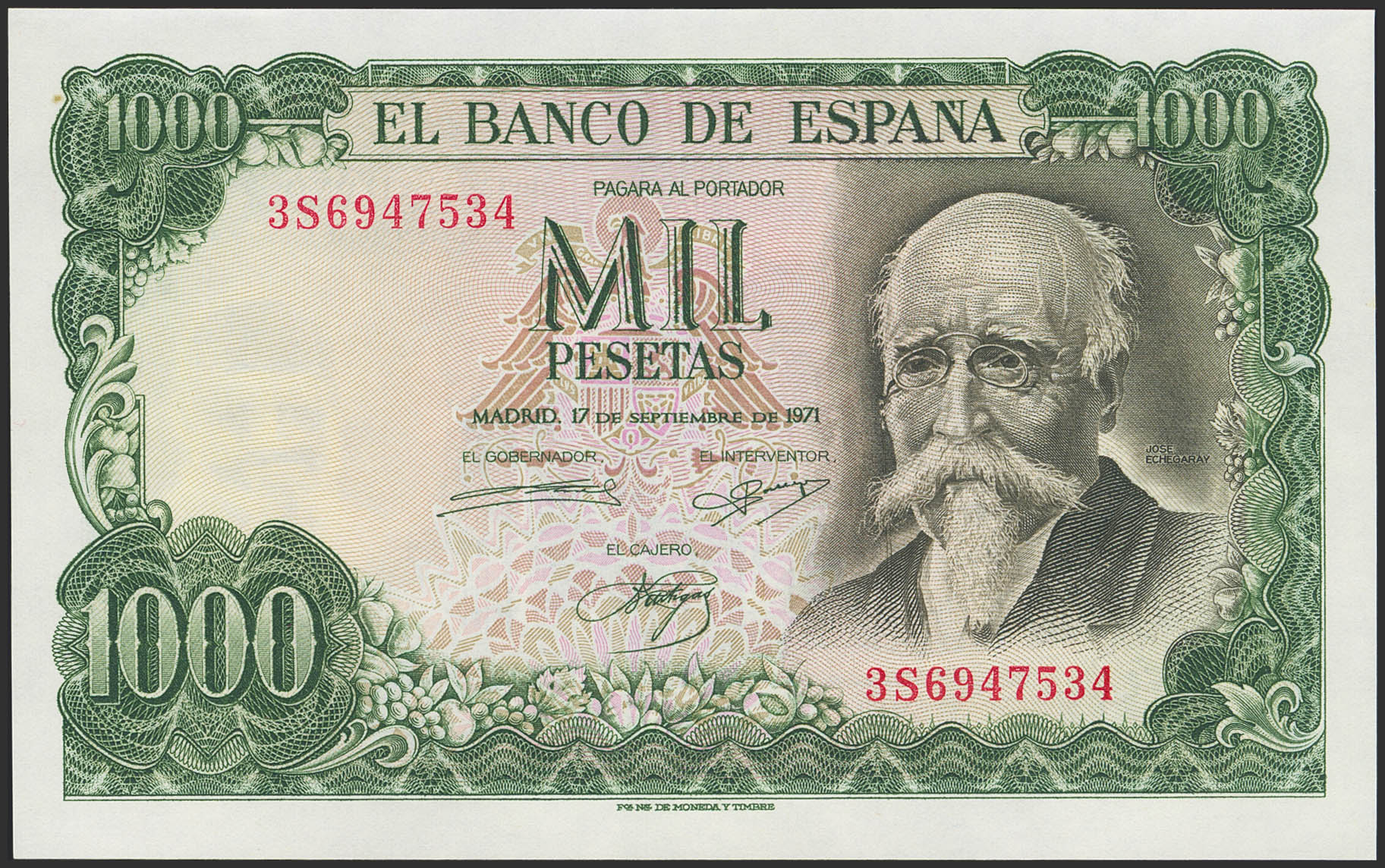 English 1000 Pesetas. September 17, 1971. Series 3S. (Edifil 2023: 474c). It retains all its original finish. Uncirculated.
