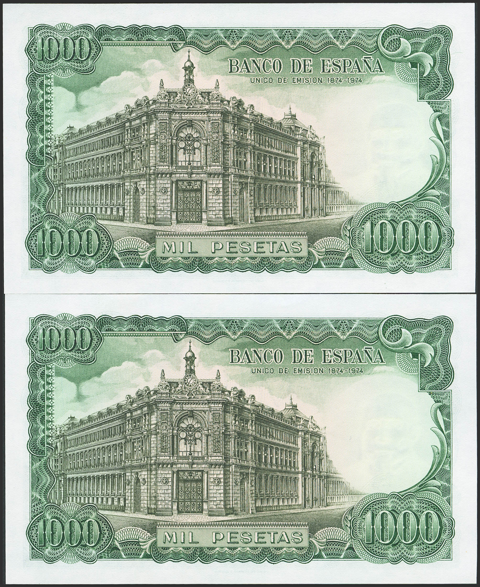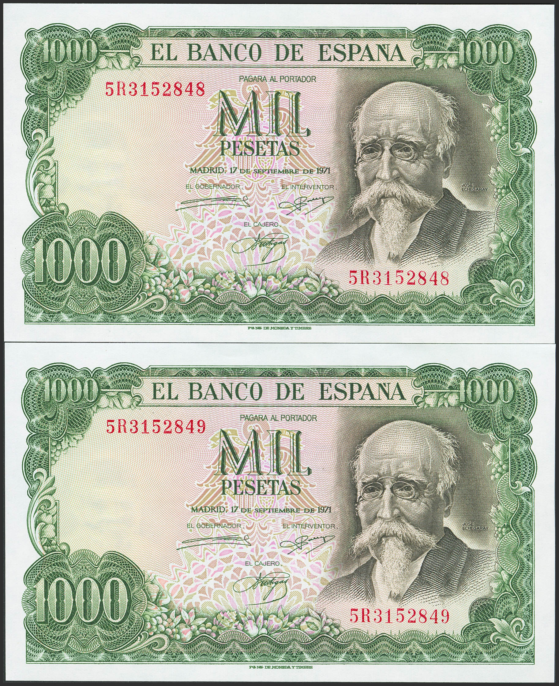1000 Pesetas. September 17, 1971. Correlative couple. 5R series. (Edifil 2021: 474c). It retains all its original finish. Uncirculated.
