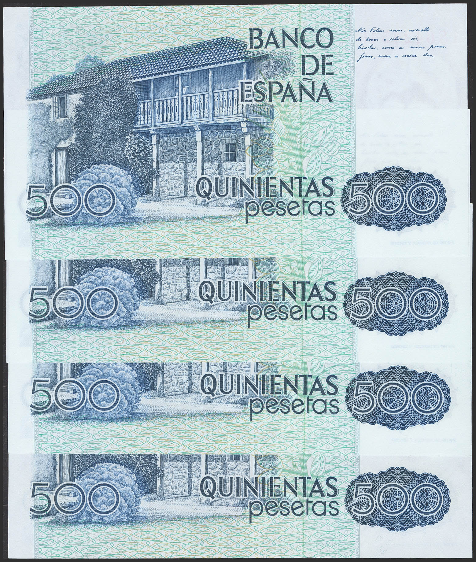 Set of 5 consecutive 500 Pesetas banknotes issued on October 23, 1979, all of them with series 1S, the last series issued (Edifil 2023: 476aa). Uncirculated.