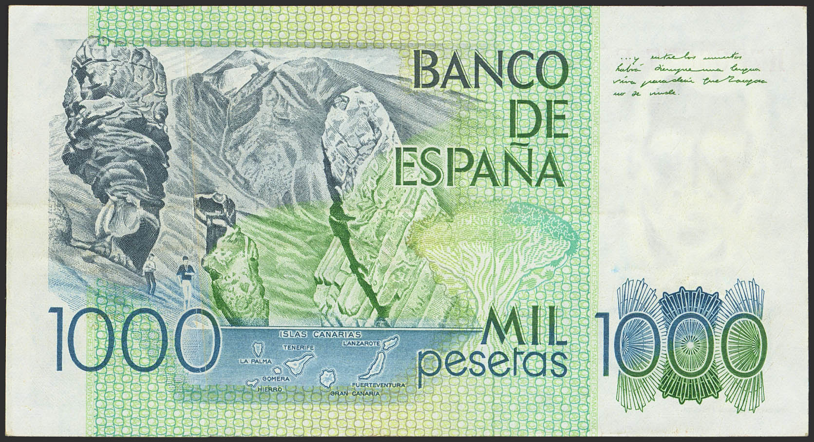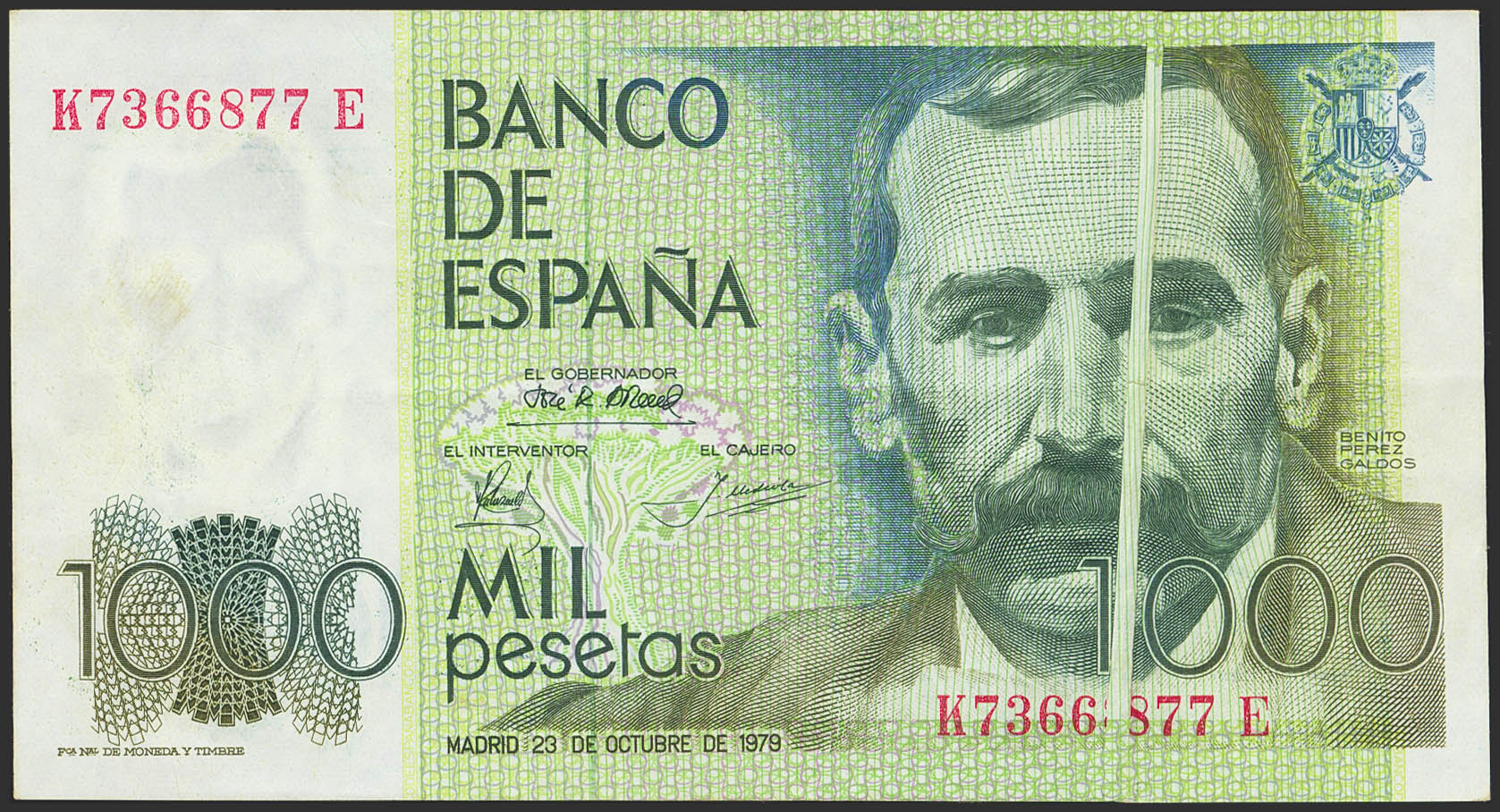 1000 Pesetas. October 23, 1979. KE series and printing error caused by a vertical fold. (Edifil 2023: 477a). Rare and spectacular, to better understand the contextualization of this banknote we recommend the work "Encyclopedia of Notafilia and Spanish Scripophilia", by Don José Antonio Castellanos. Almost Extremely Fine.