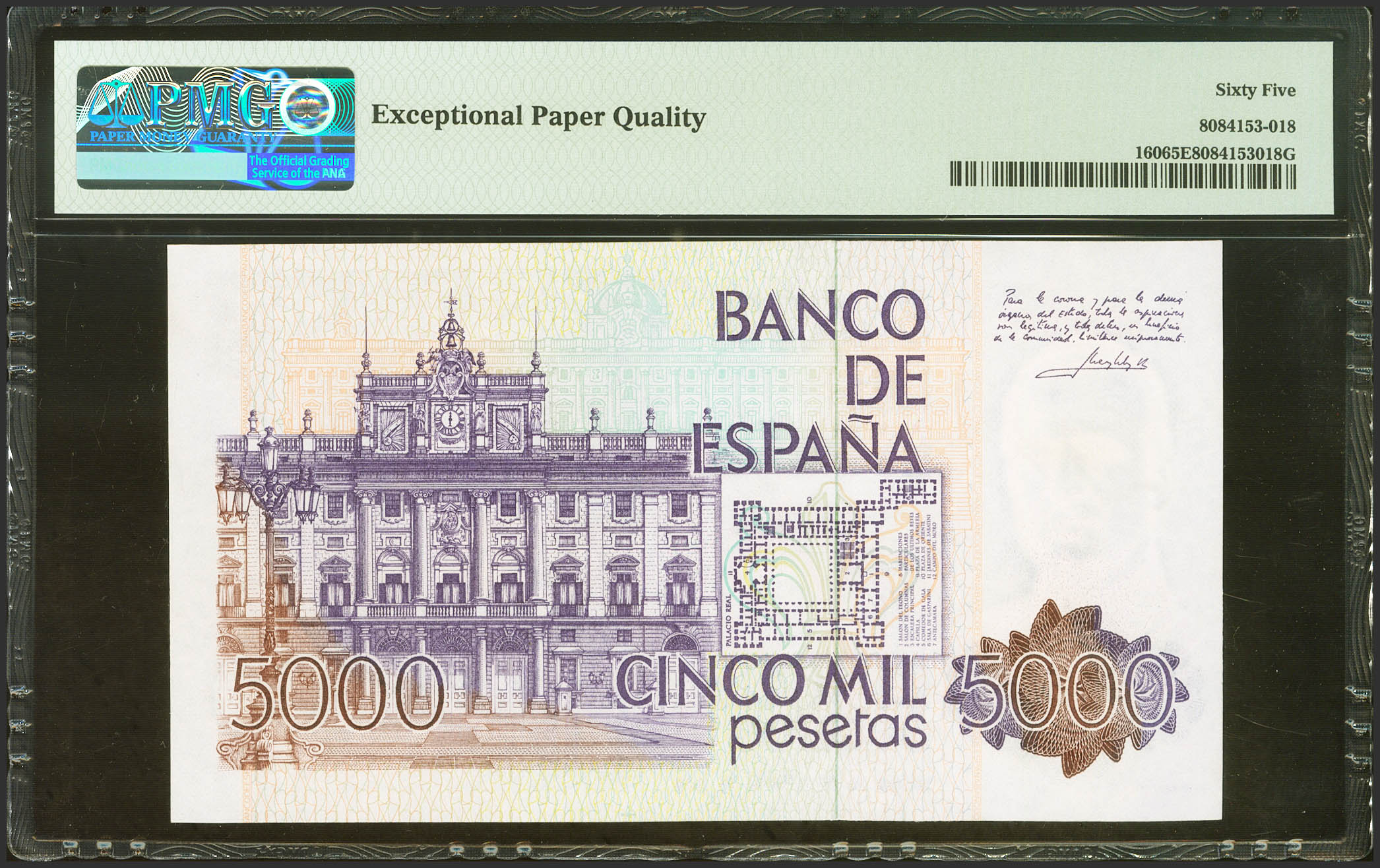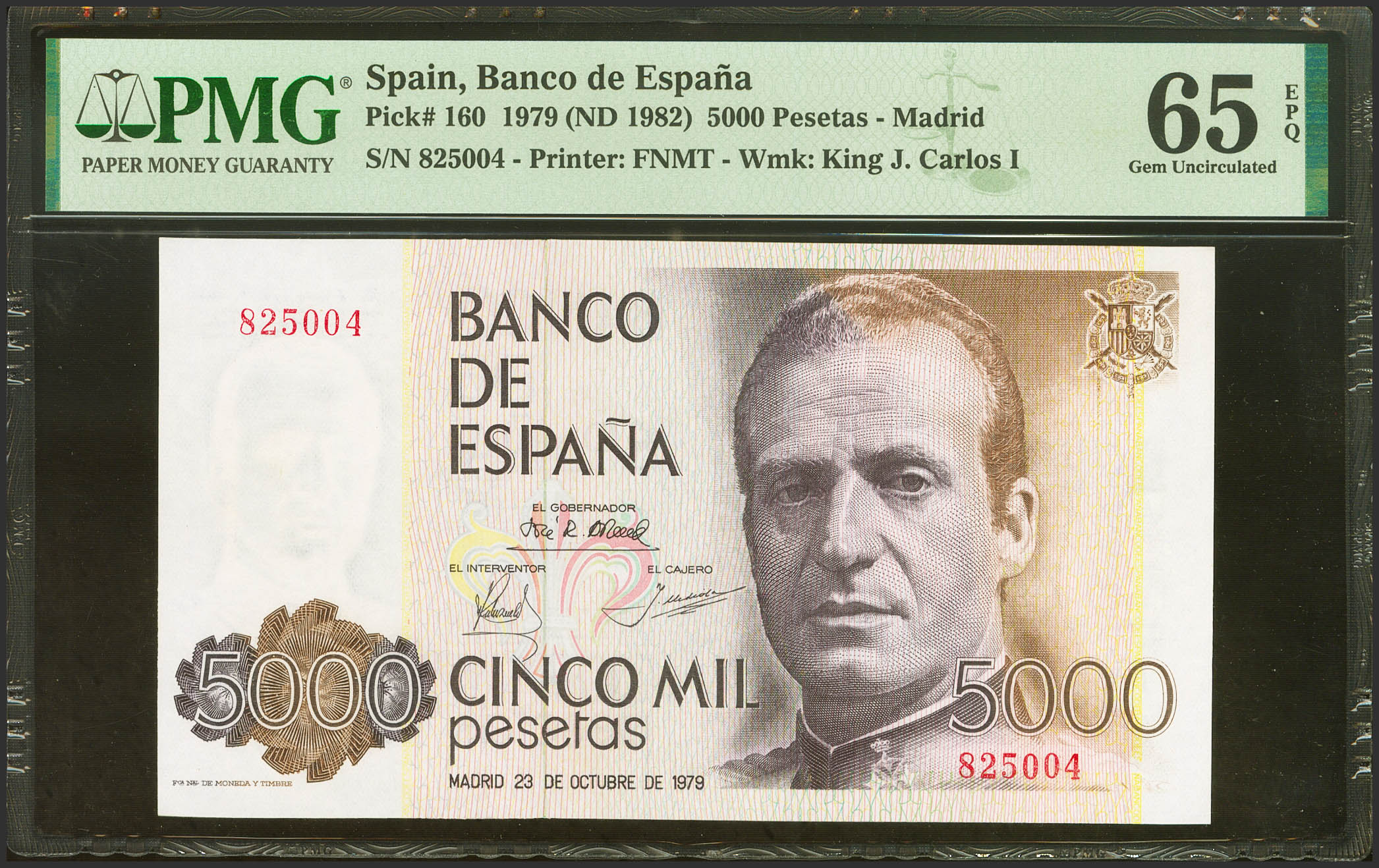 5000 Pesetas. October 23, 1979. No series. (Edifil 2023: 478, Pick: 160). Unusual in this exceptional quality, original sizing. Uncirculated. PMG65EPQ package.