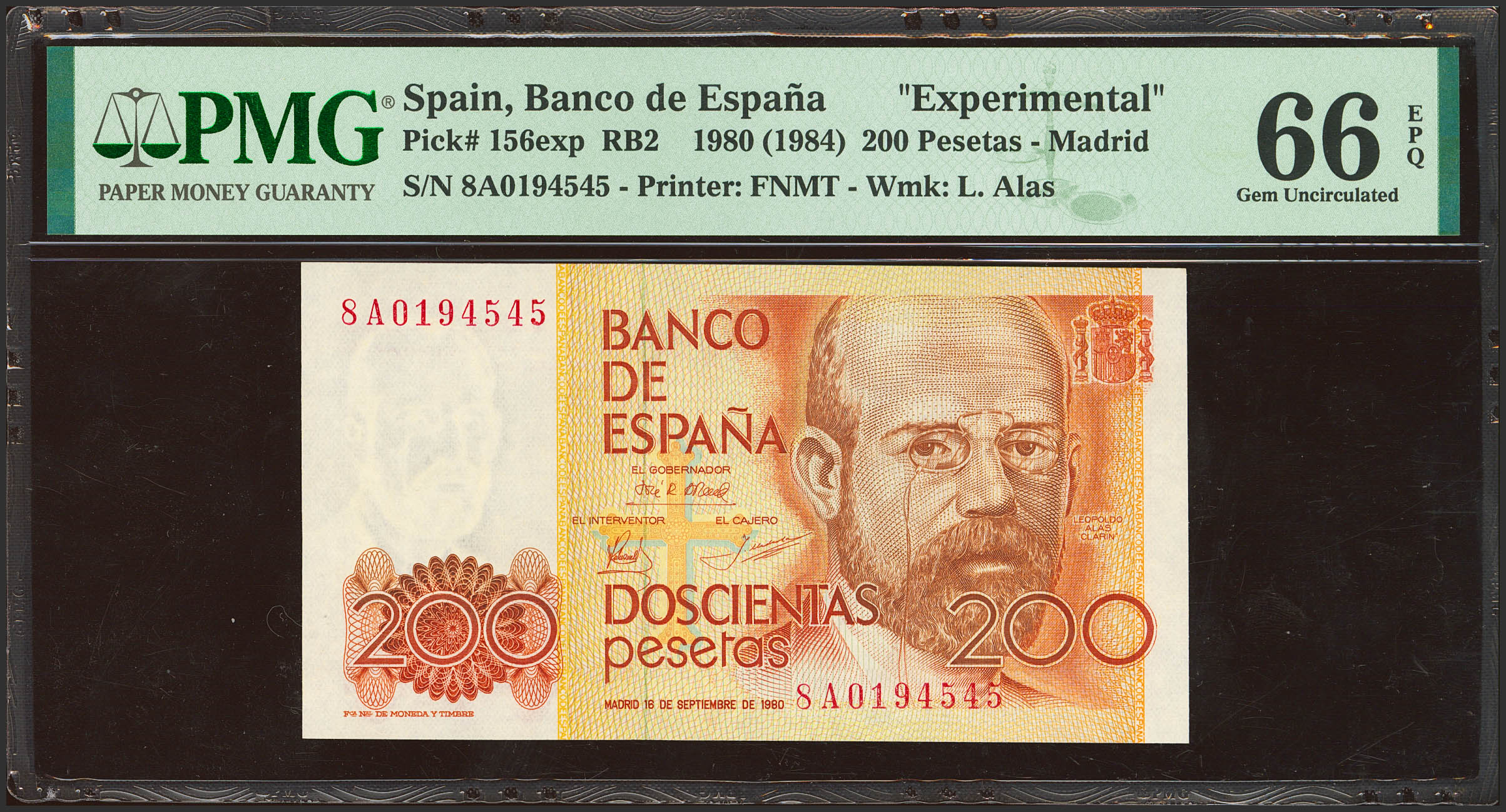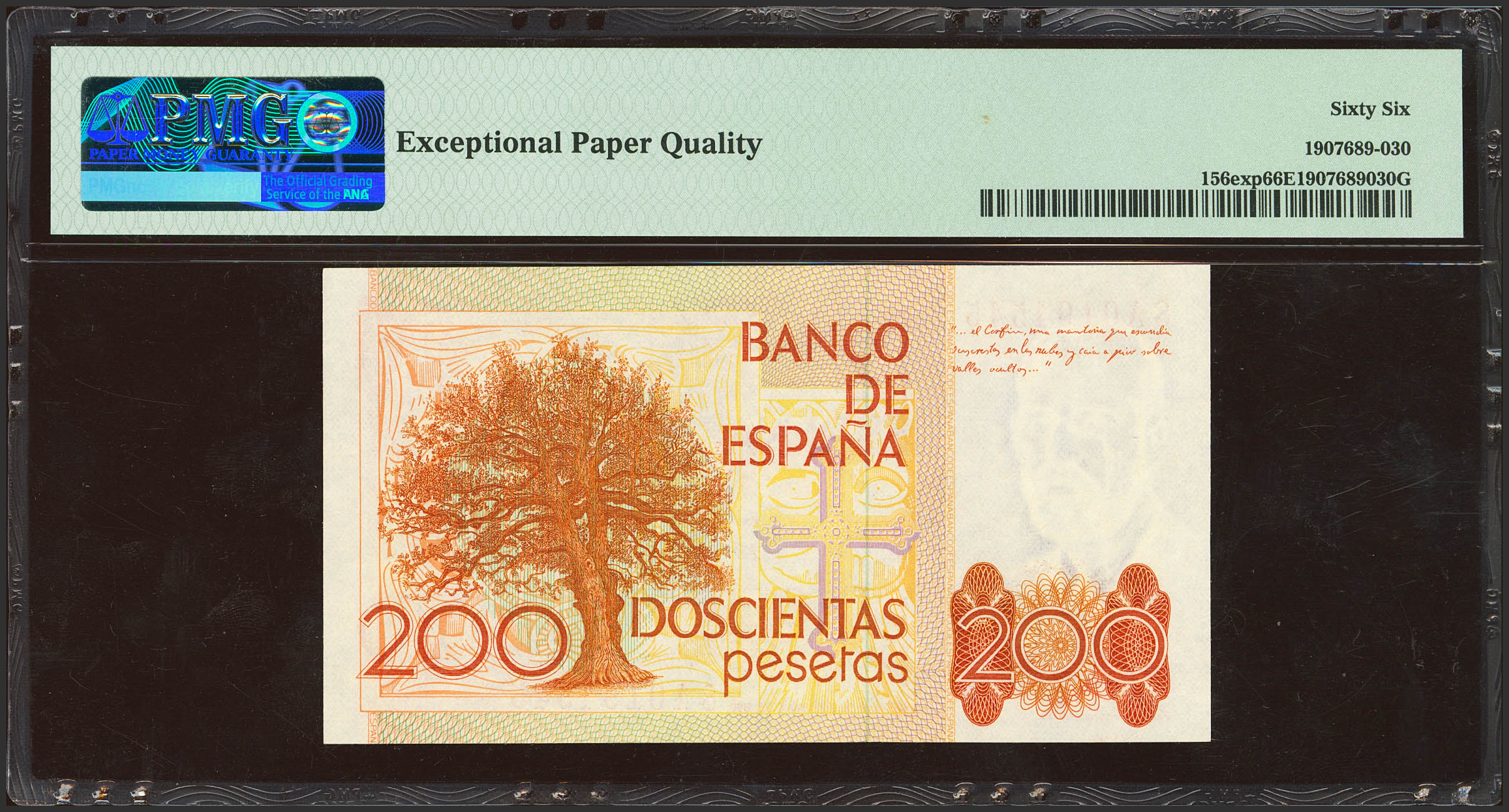 200 Pesetas. September 16, 1980. Special series 8A. (Edifil 2021: 480c, Pick: 156exp). Very rare in this exceptional quality. Uncirculated. PMG66EPQ package.