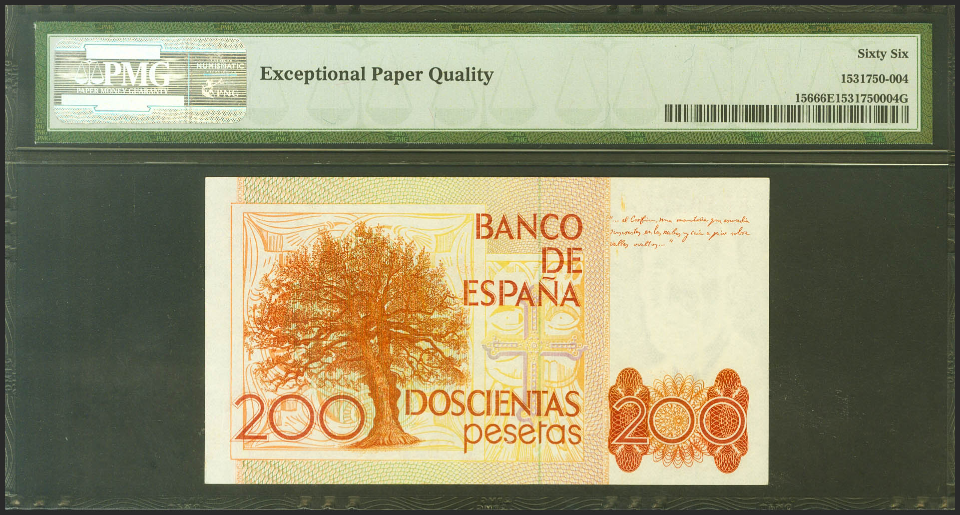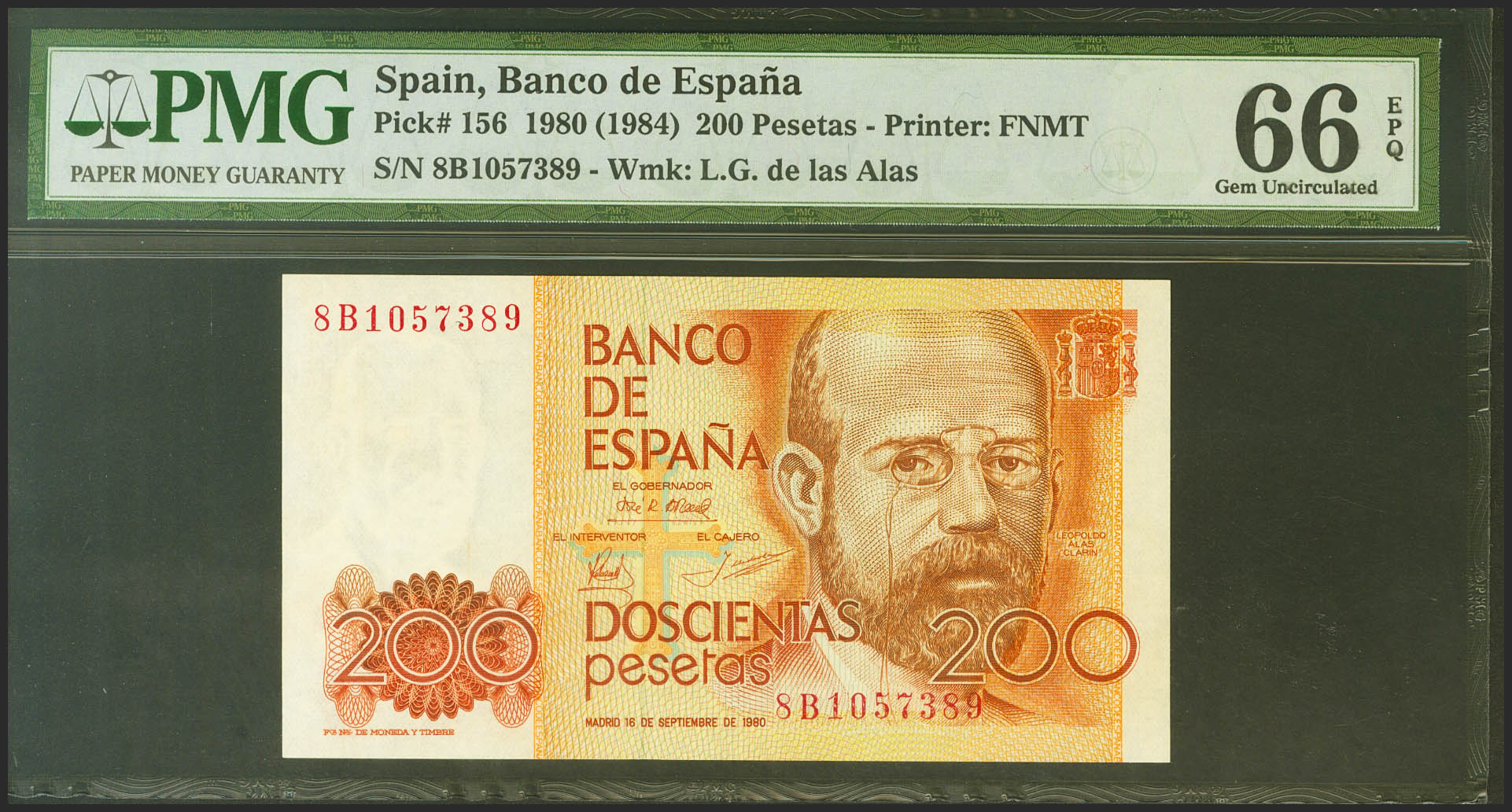 200 Pesetas. September 16, 1980. Special series 8B. (Edifil 2021: 480c, Pick: 156exp). Rare in this exceptional quality, original sizing. Uncirculated. PMG66EPQ package.