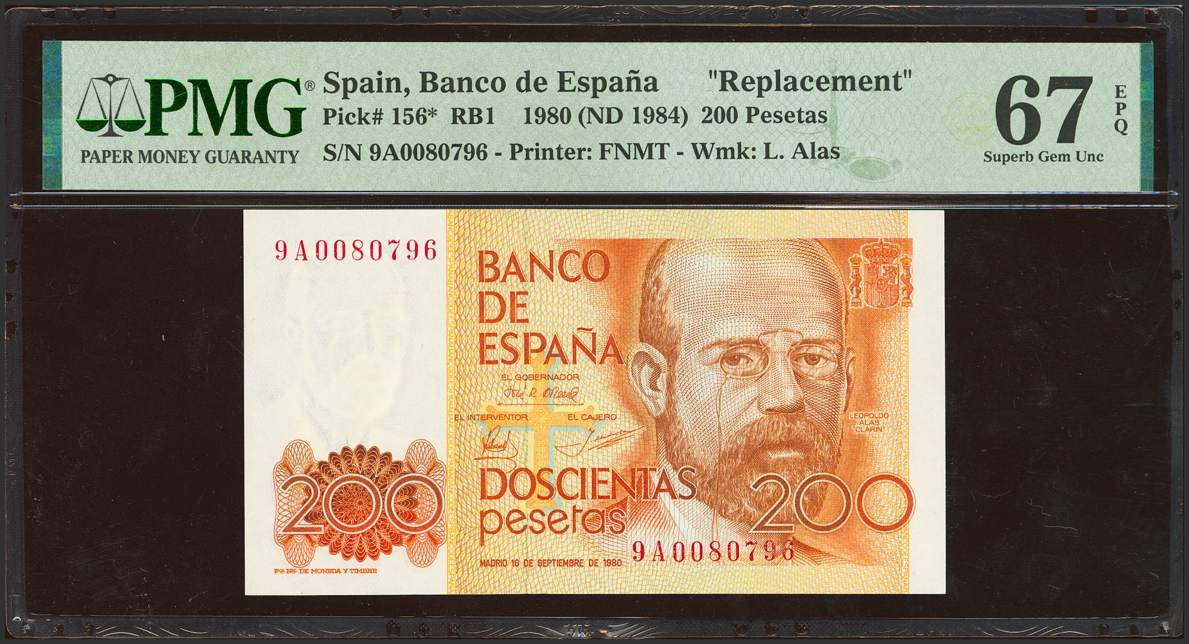 200 Pesetas. September 16, 1980. Special series 9A. (Edifil 2023: 480b, Pick: 156*). Unusual in this exceptional quality. Uncirculated. PMG67EPQ package.