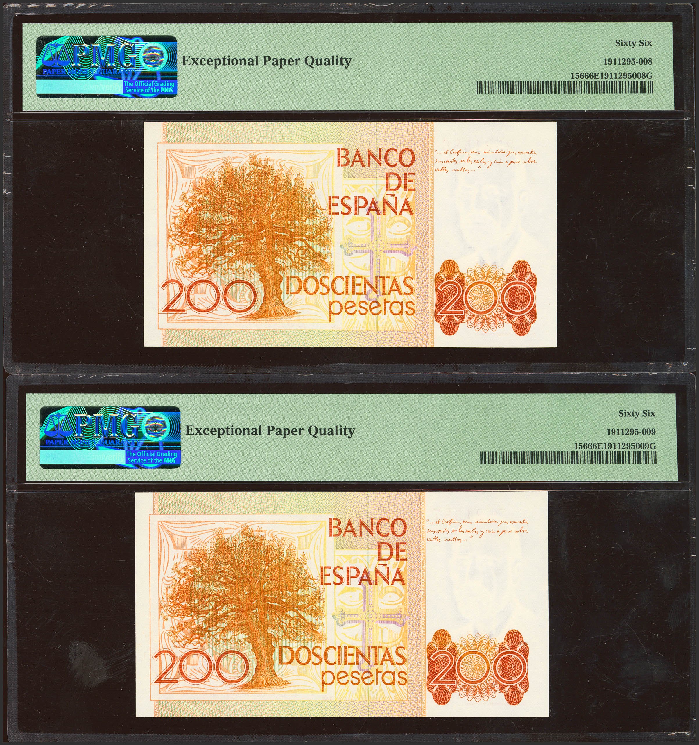200 Pesetas. September 16, 1980. Correlative couple. No serie. (Edifil 2023: 480, Pick: 156). Unusual in this exceptional quality. Uncirculated. PMG66EPQ packages, both.