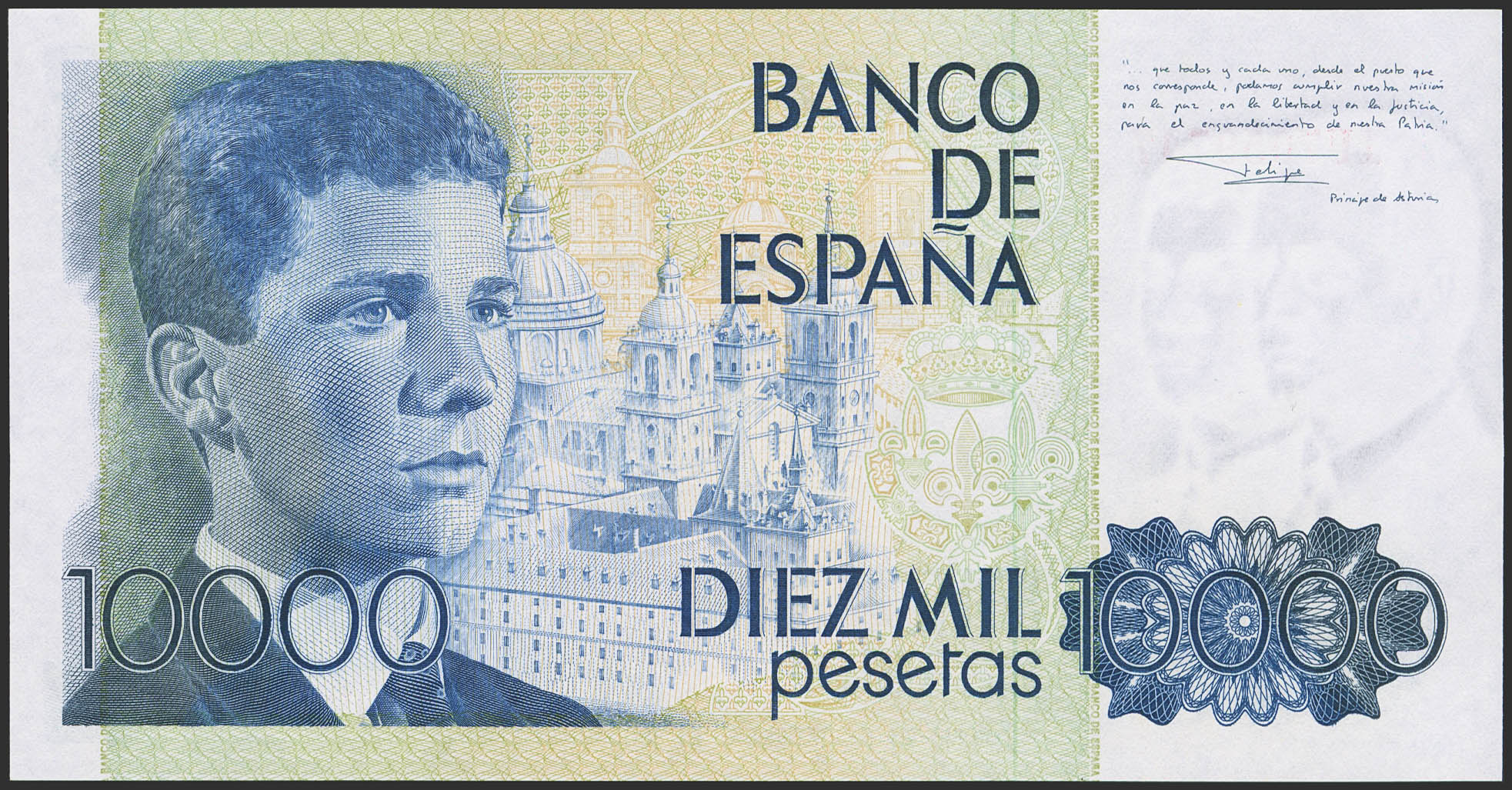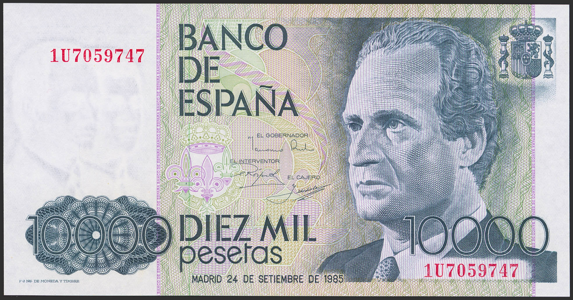 English 10,000 Pesetas. September 24, 1985. Series 1U. (Edifil 2023: 481a). Uncirculated.