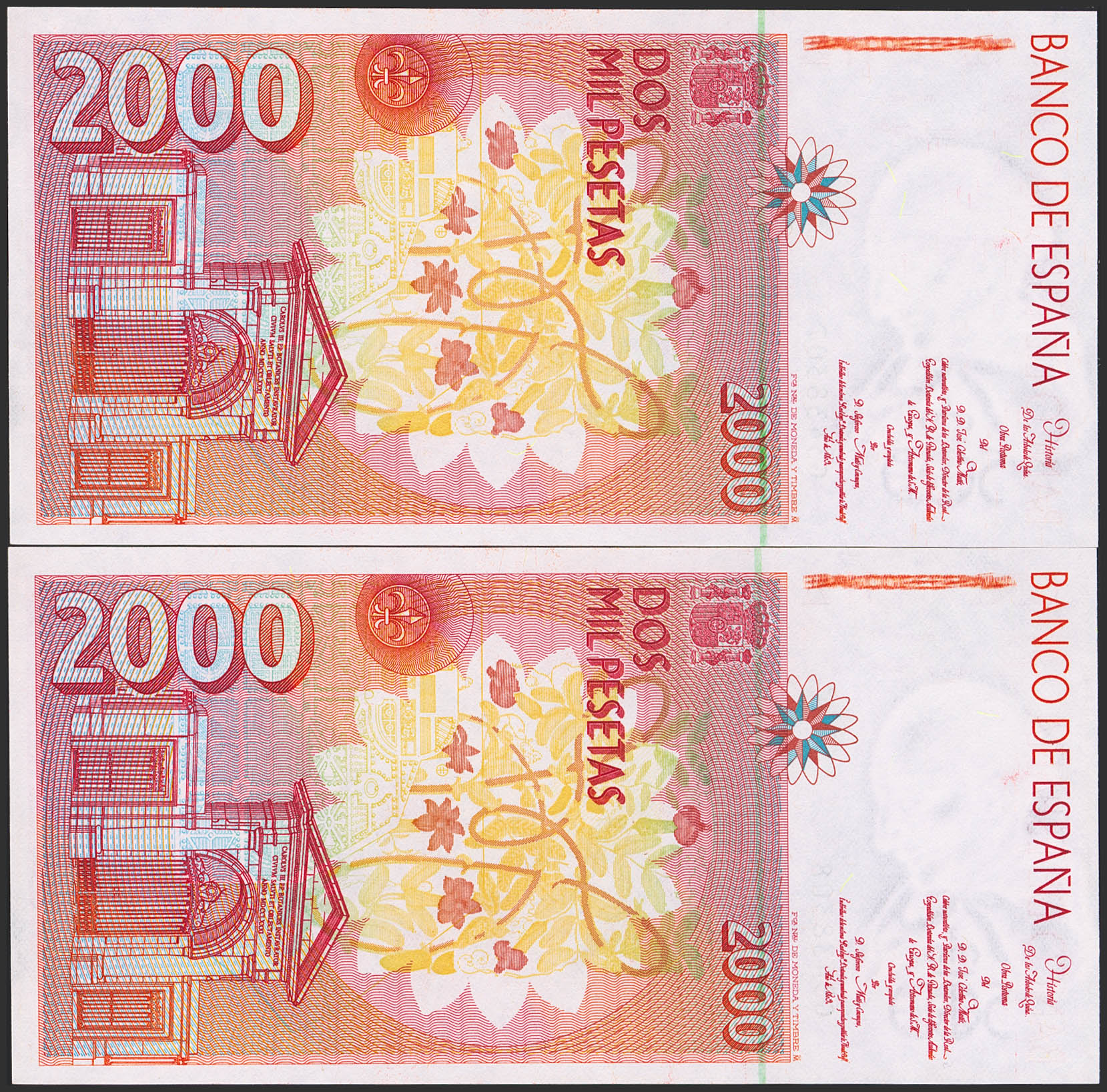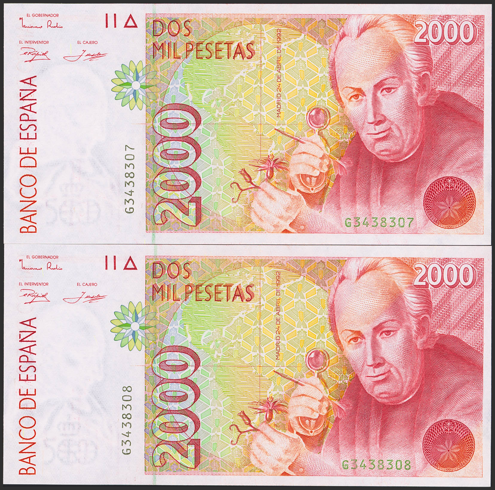 2000 Pesetas. April 24, 1992. Correlative couple. Series G. (Edifil 2023: 482a). Uncirculated.