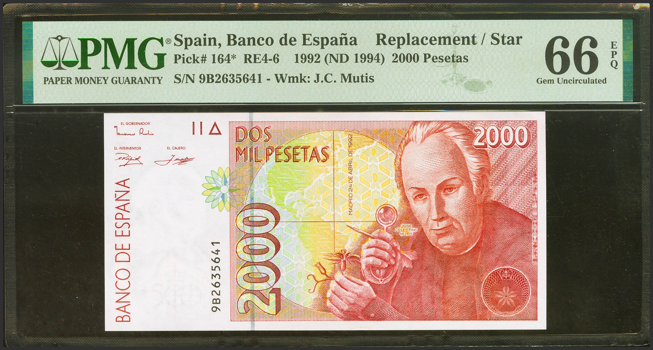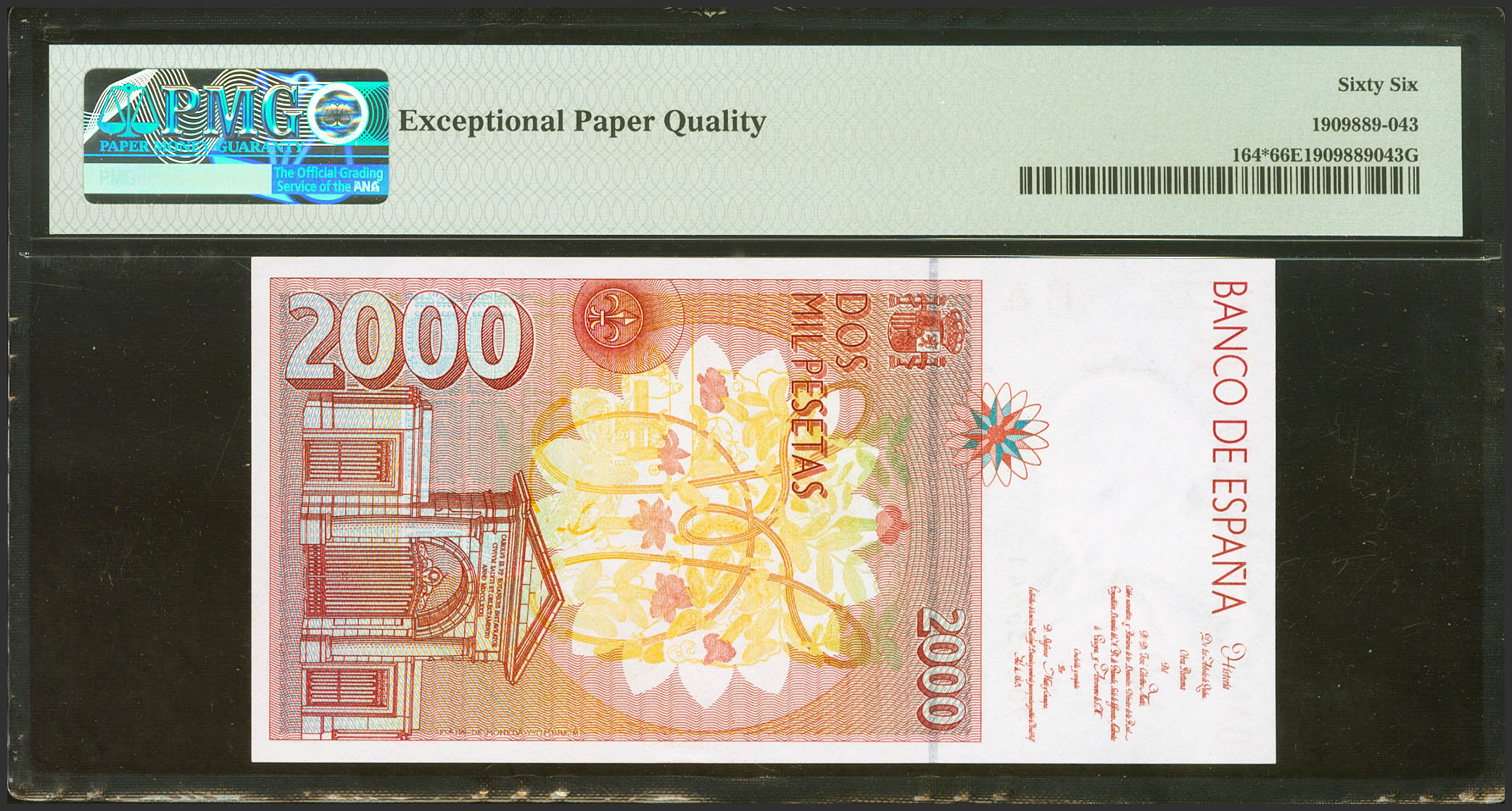 2000 Pesetas. April 24, 1992. Special series 9B. (Edifil 2021: 482Ab, Pick: 164*). Rare in this quality. Uncirculated. PMG66EPQ package.
