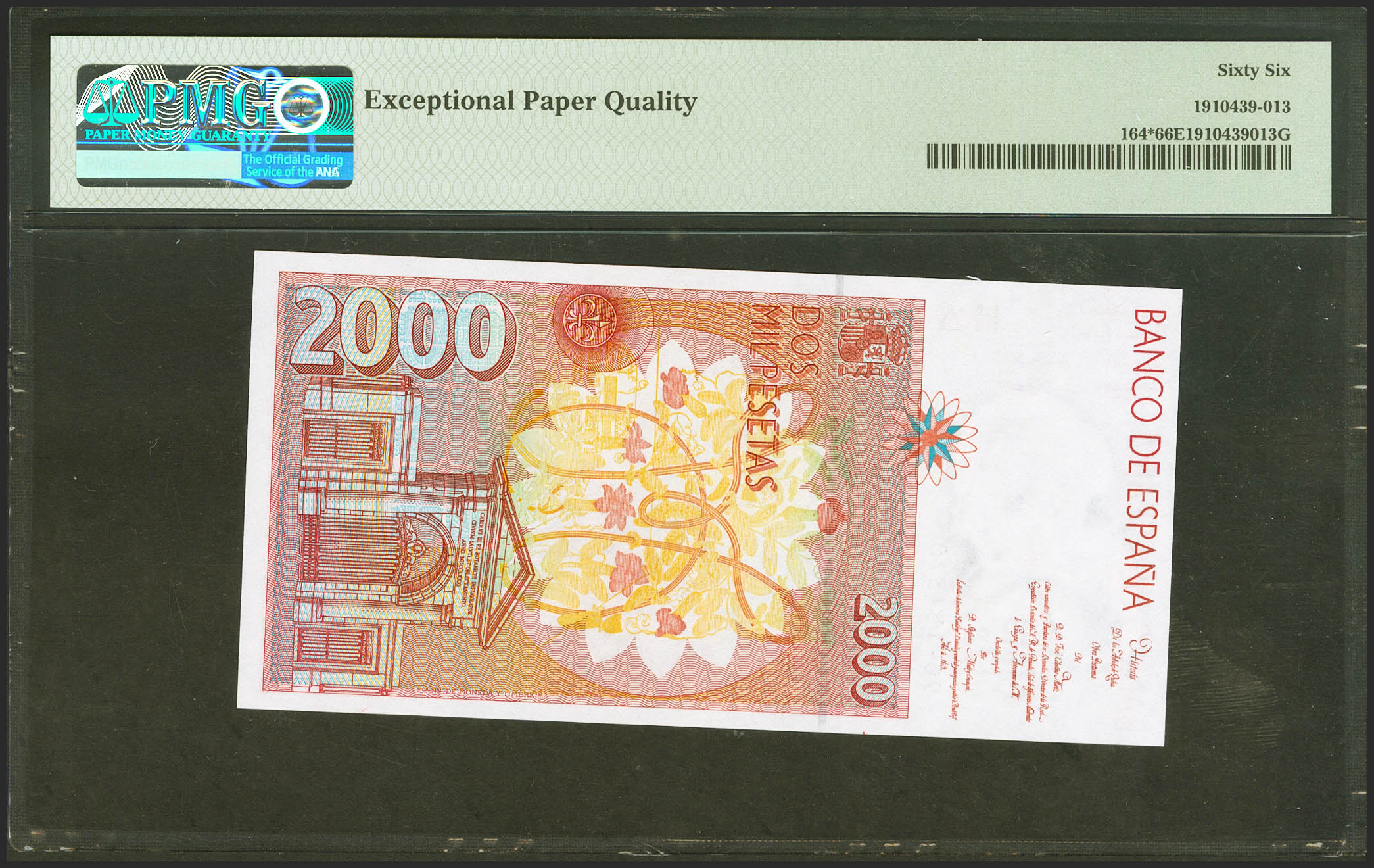 2000 Pesetas. April 24, 1992. Special series 9C. (Edifil 2021: 482Ab, Pick: 164*). Rare in this quality. Uncirculated. PMG66EPQ package.