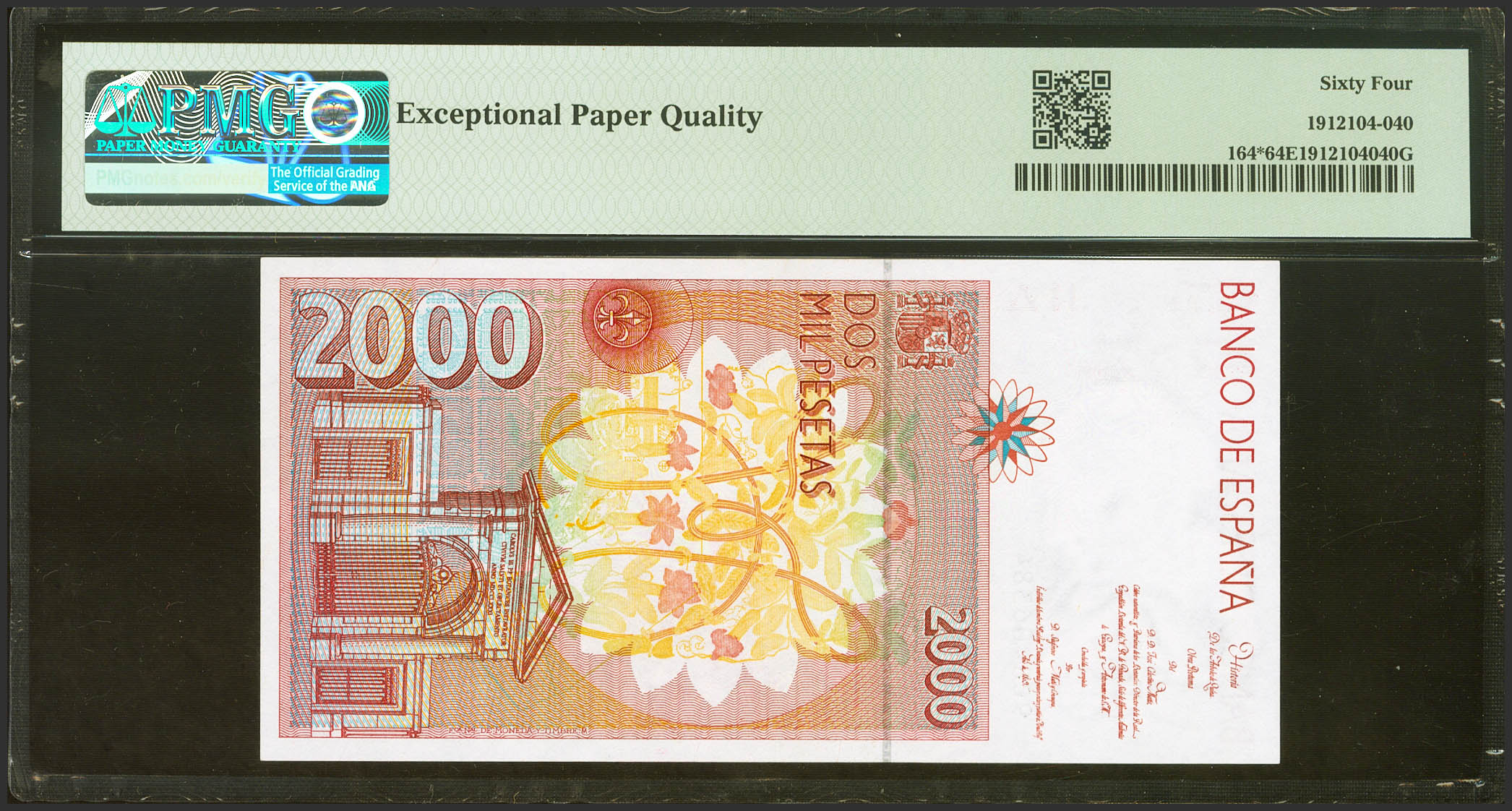2000 Pesetas. April 24, 1992. Special series 9C. (Edifil 2021: 482Ab, Pick: 164*). Original sizing. Uncirculated. PMG64EPQ package.