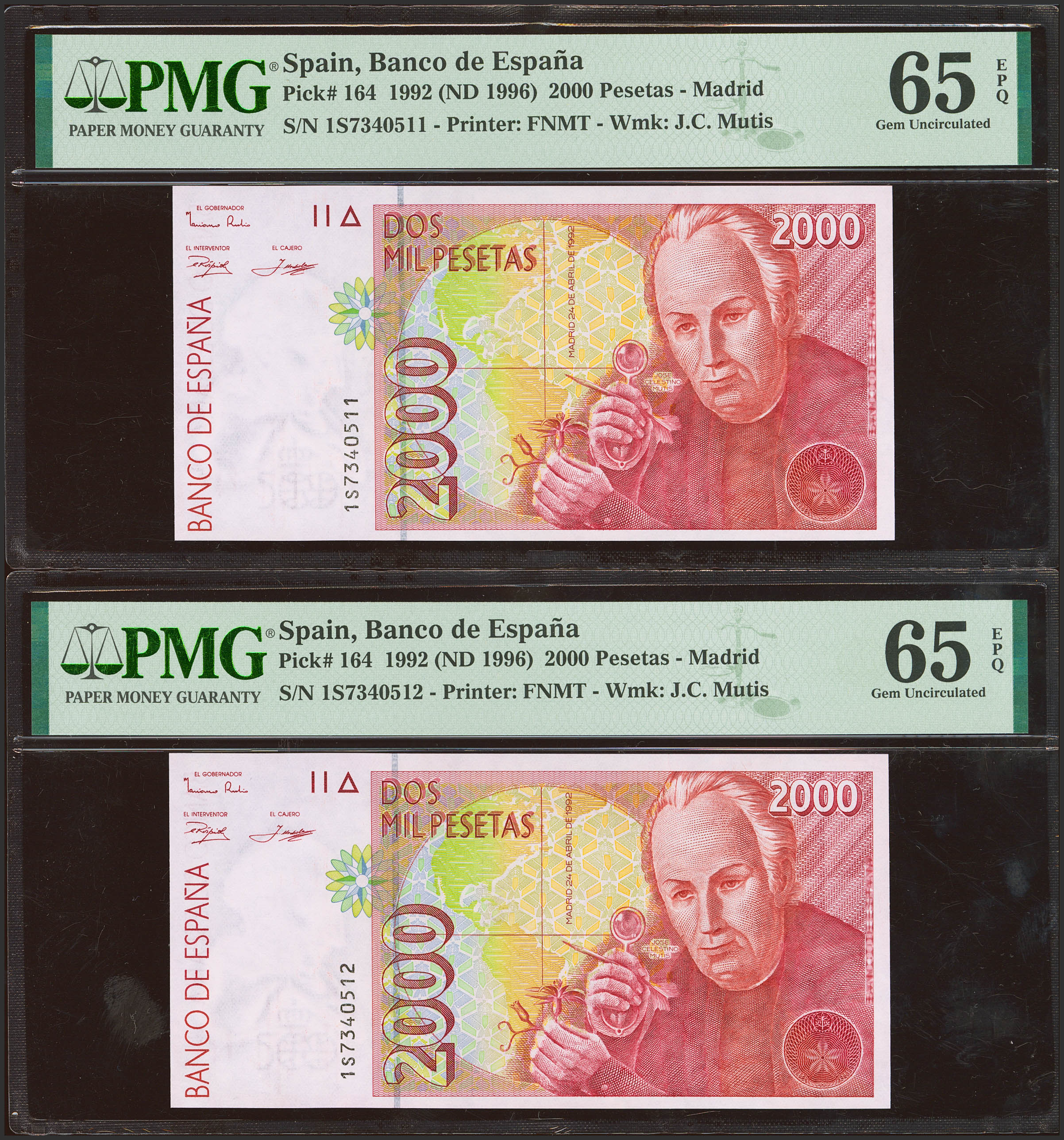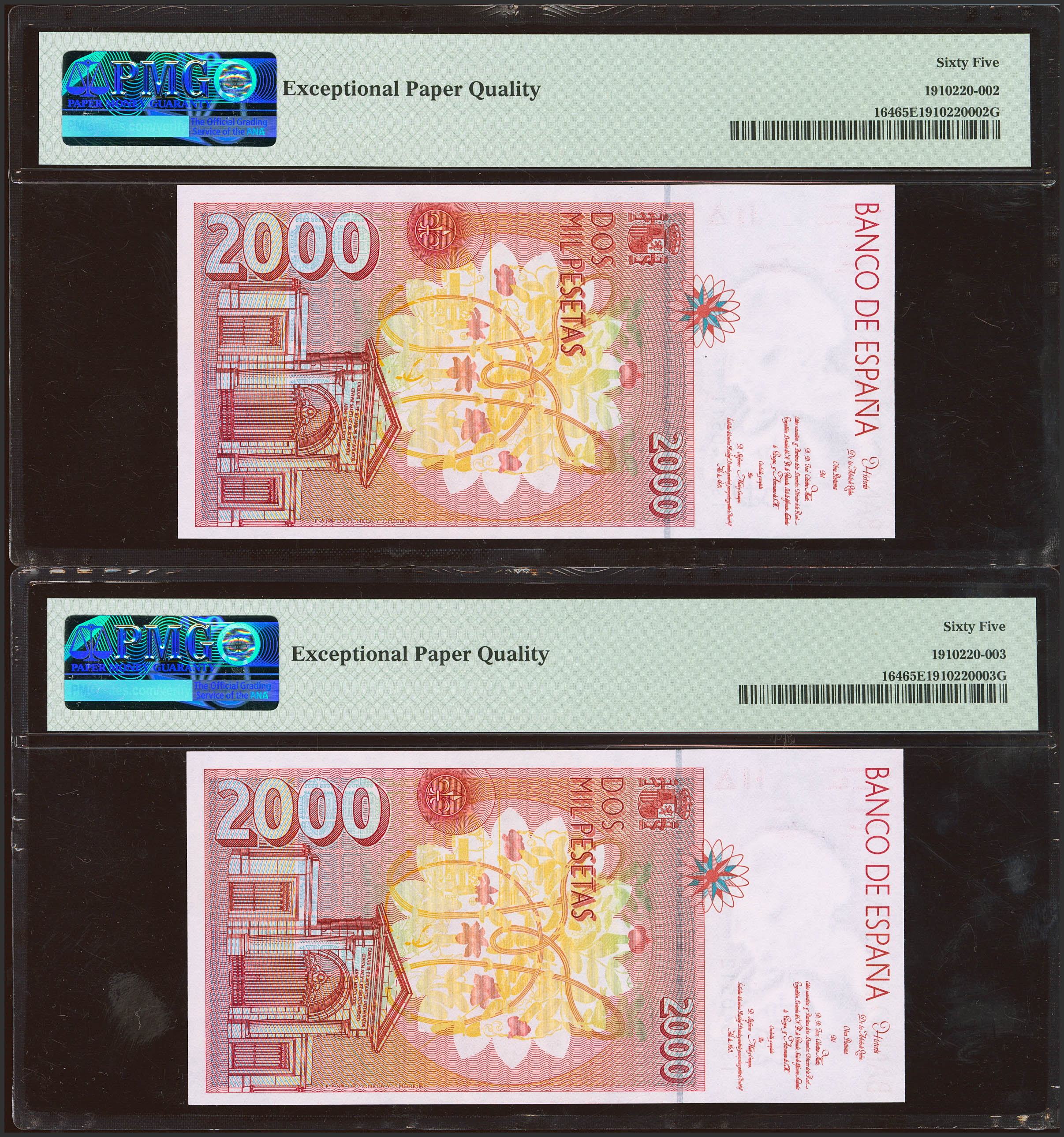 2000 Pesetas. April 24, 1992 (design modified in 1995). Correlative couple. 1S series. (Edifil 2023: 482A, Pick: 164). Uncirculated. PMG65EPQ encapsulated, both.