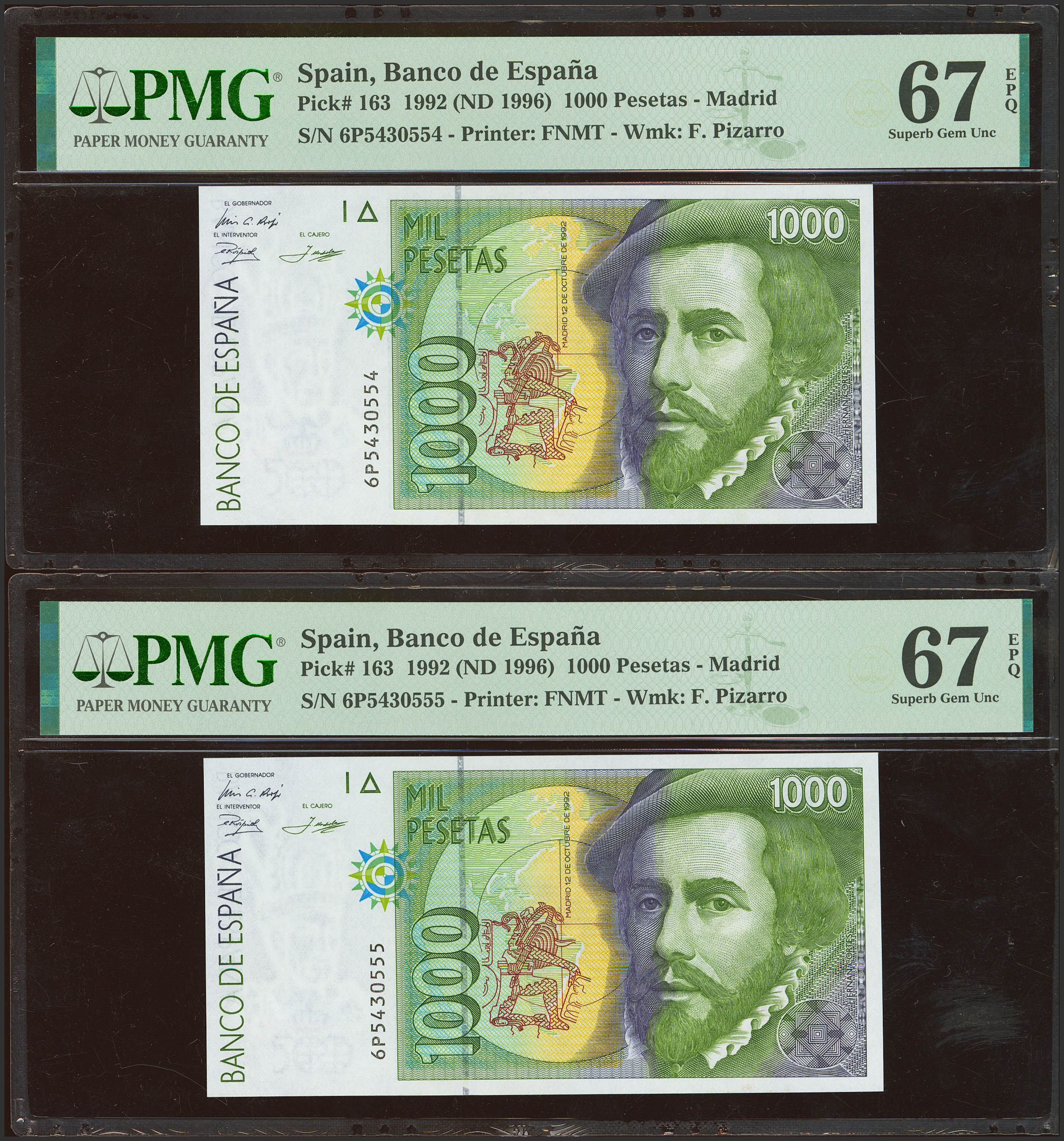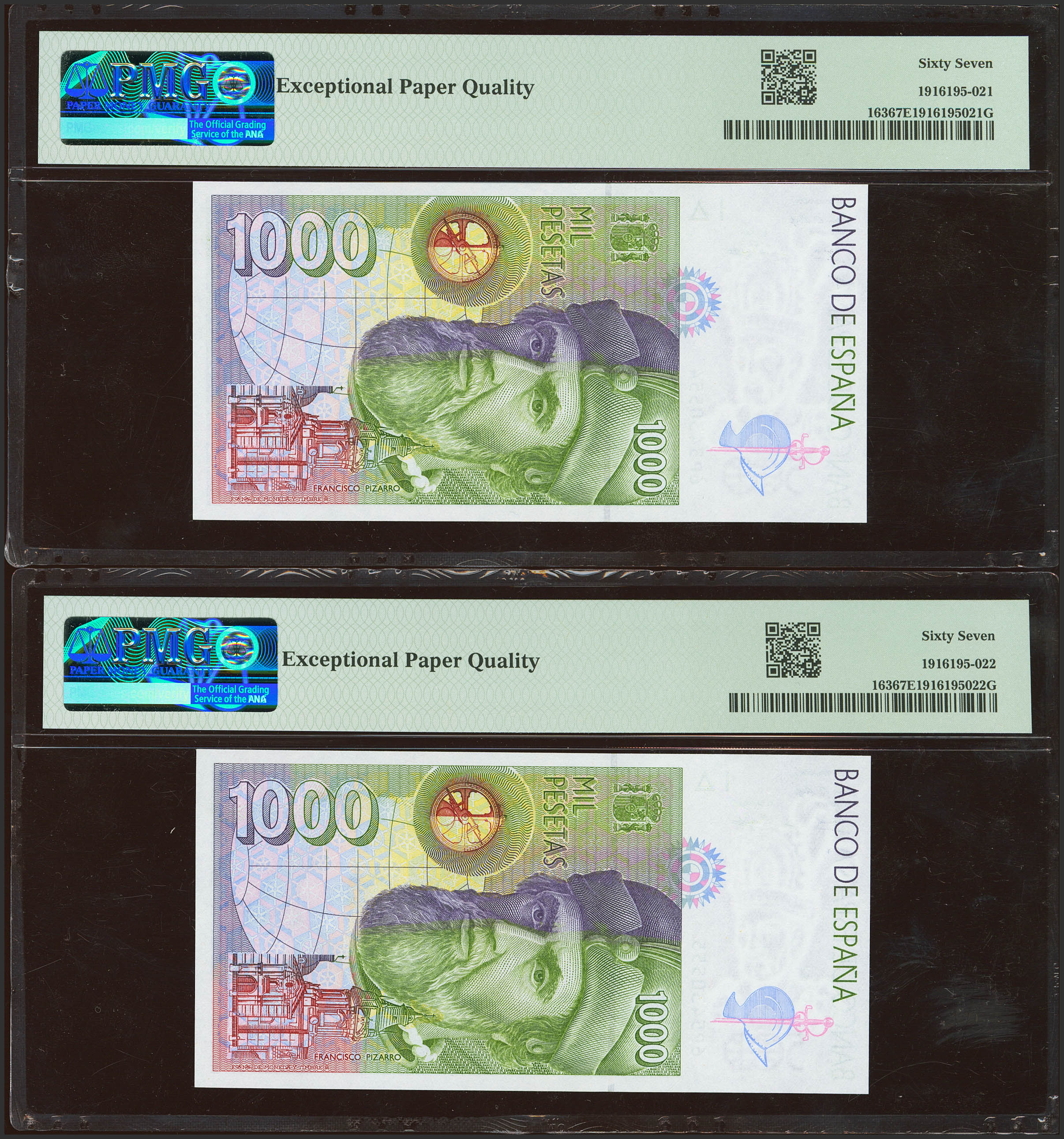 1000 Pesetas. October 12, 1992. Correlative couple. 6P series. (Edifil 2023: 483b, Pick: 163). Uncirculated. PMG67EPQ encapsulated, both.