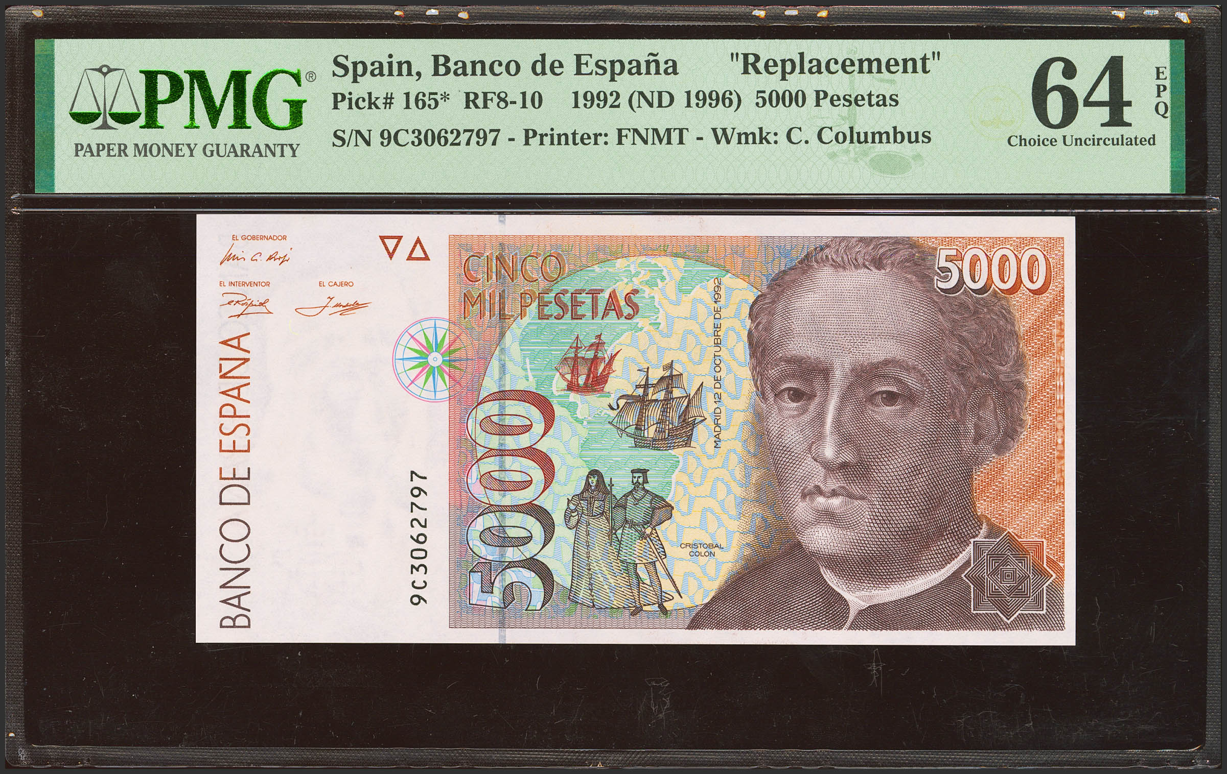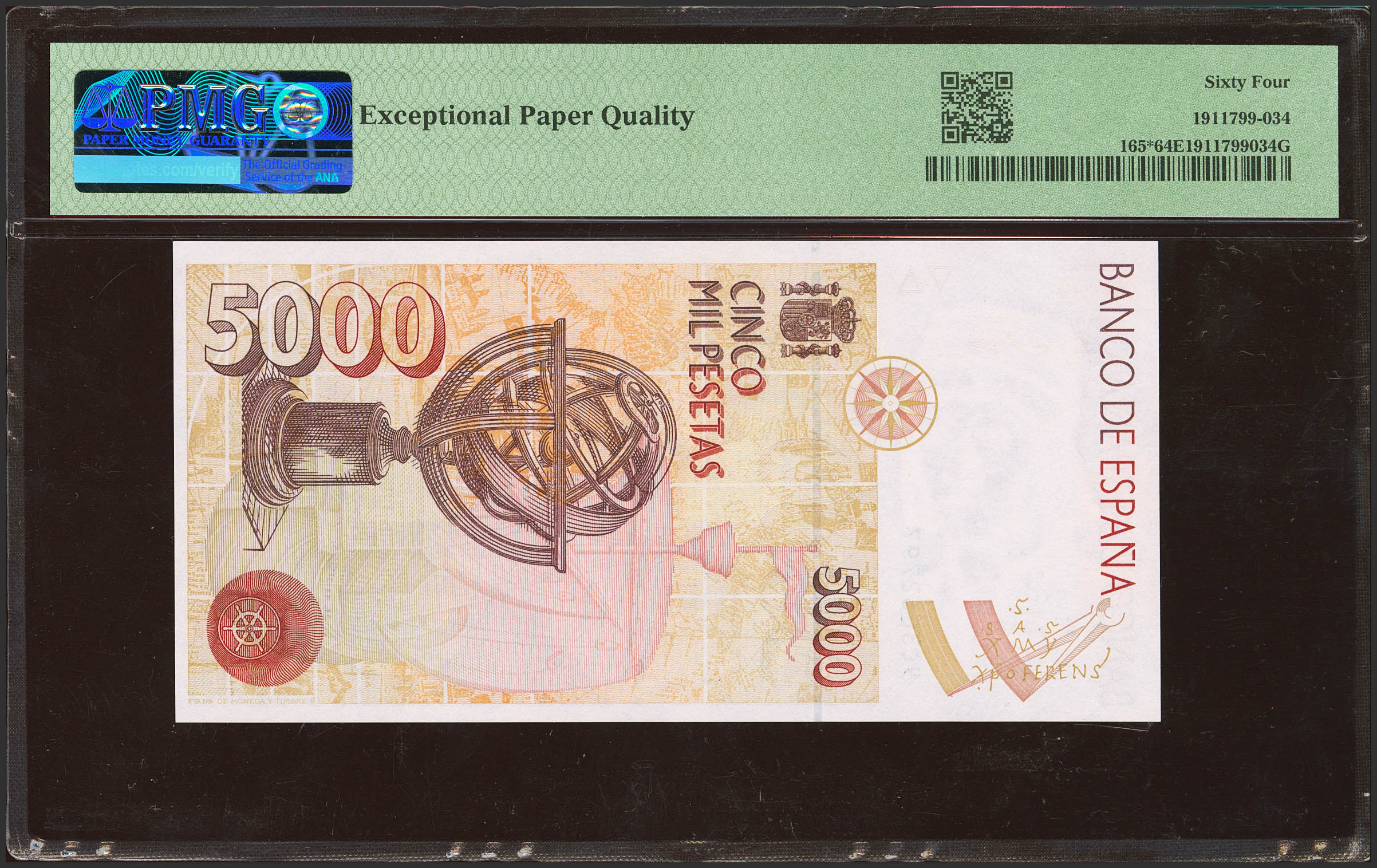5000 Pesetas. October 12, 1992. Special series 9C. (Edifil 2023: 484b, Pick: 165*). Unusual in this exceptional quality. Uncirculated. PMG64EPQ package.