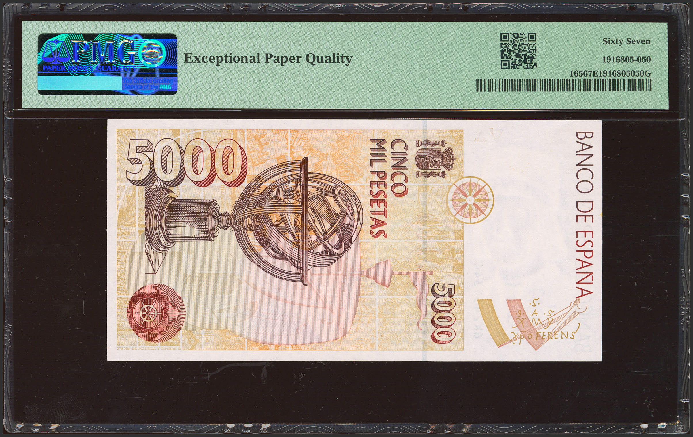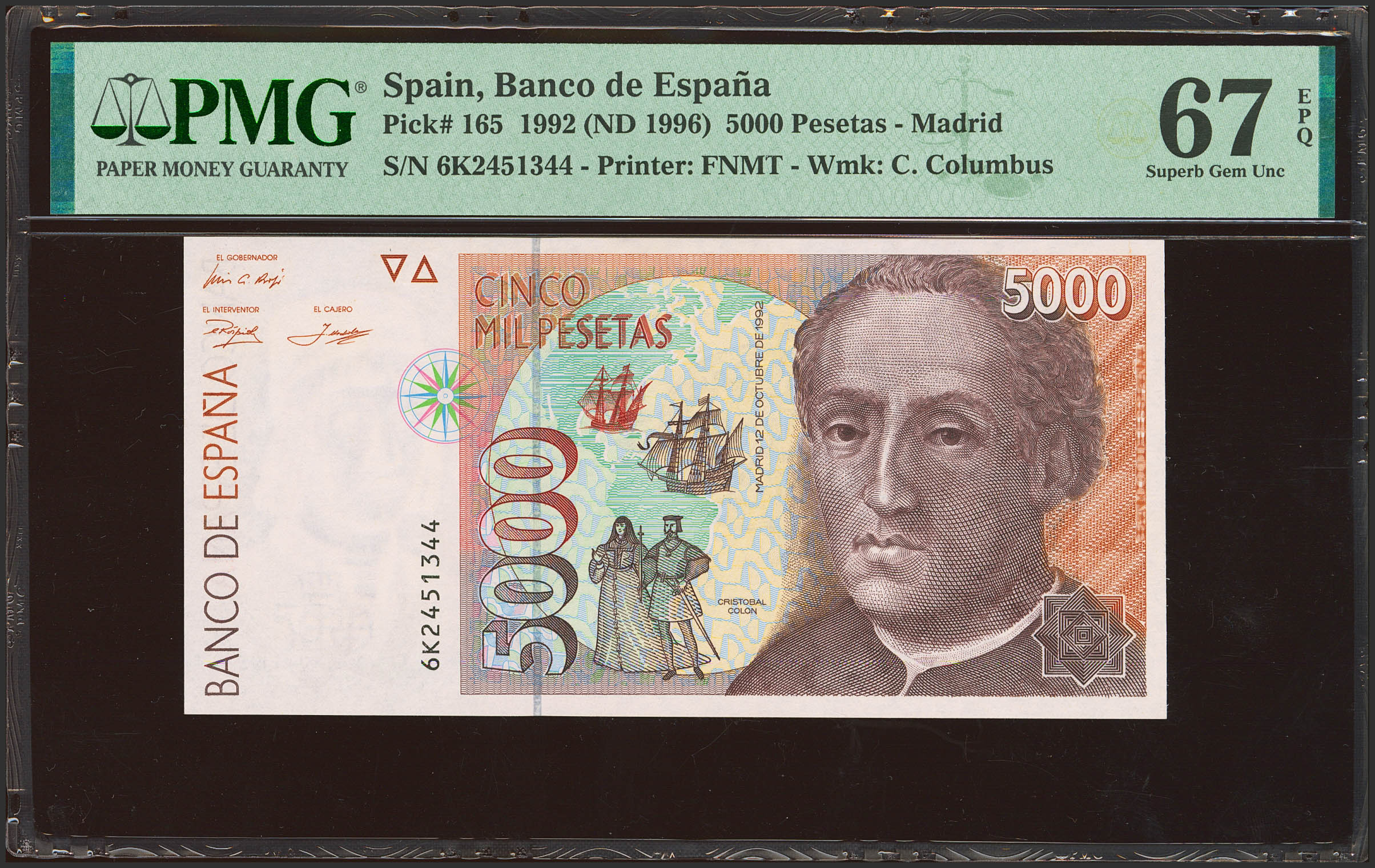 5000 Pesetas. October 12, 1992. Series 6K, last series broadcast. (Edifil 2023: 484aa, Pick: 165). Very rare series. Uncirculated. PMG67EPQ package.