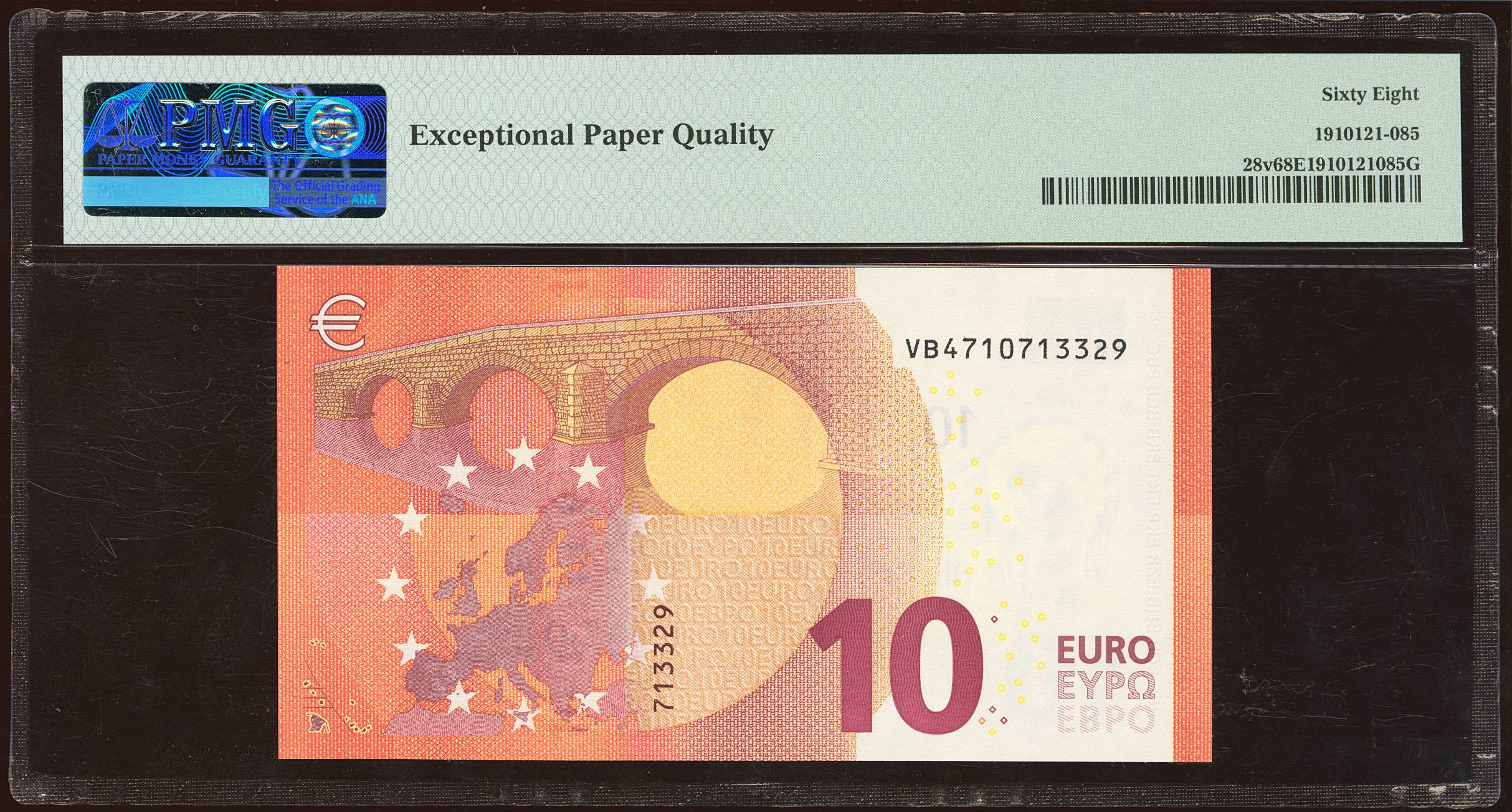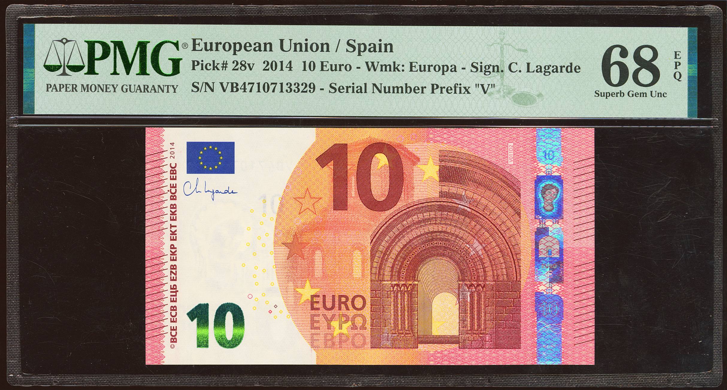 English 10 euros. September 23, 2014. Signature Lagarde. Series V (Spain). (Edifil 2021: 494A, Pick: 28v). Uncirculated. PMG68EPQ package.