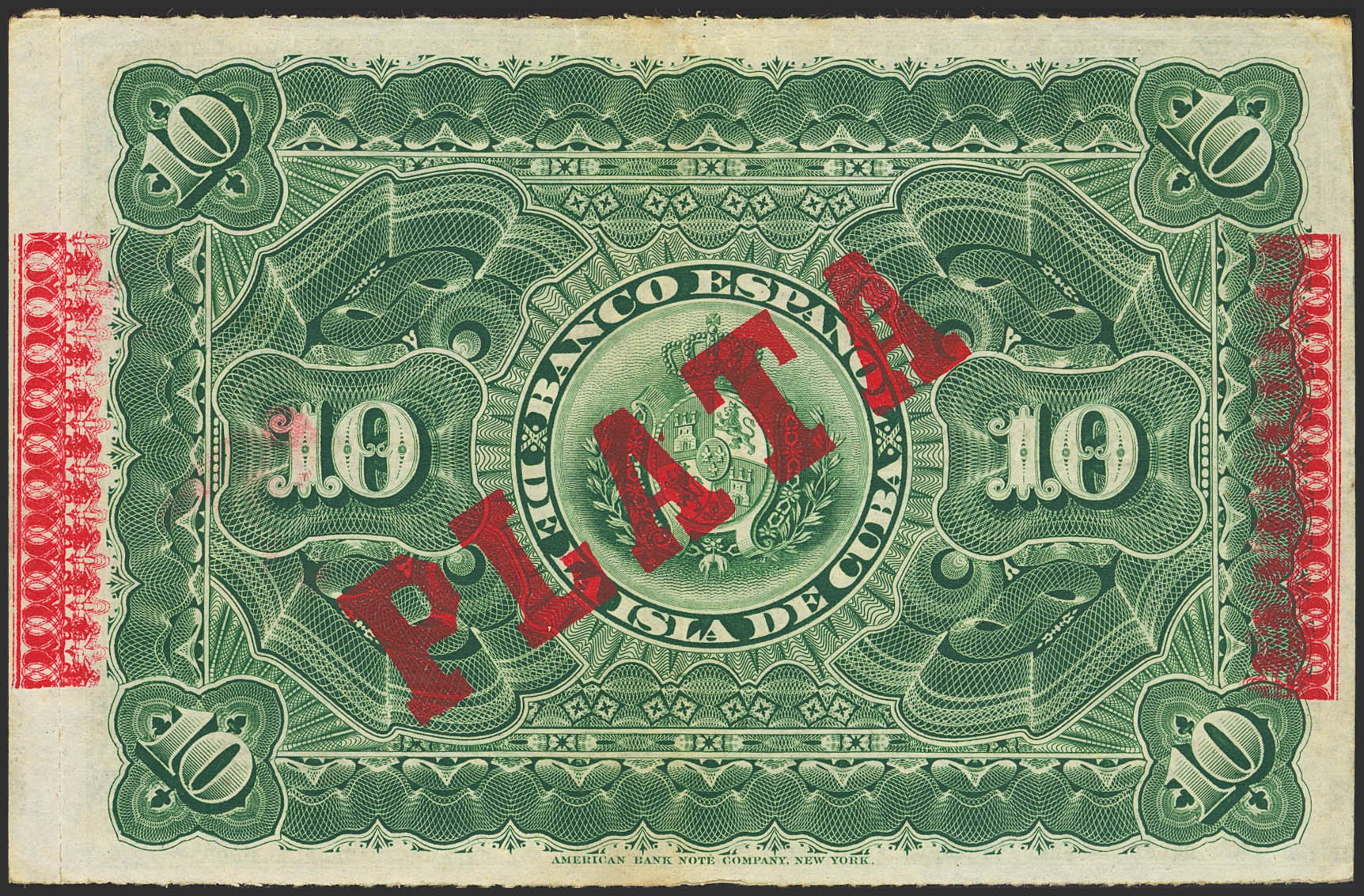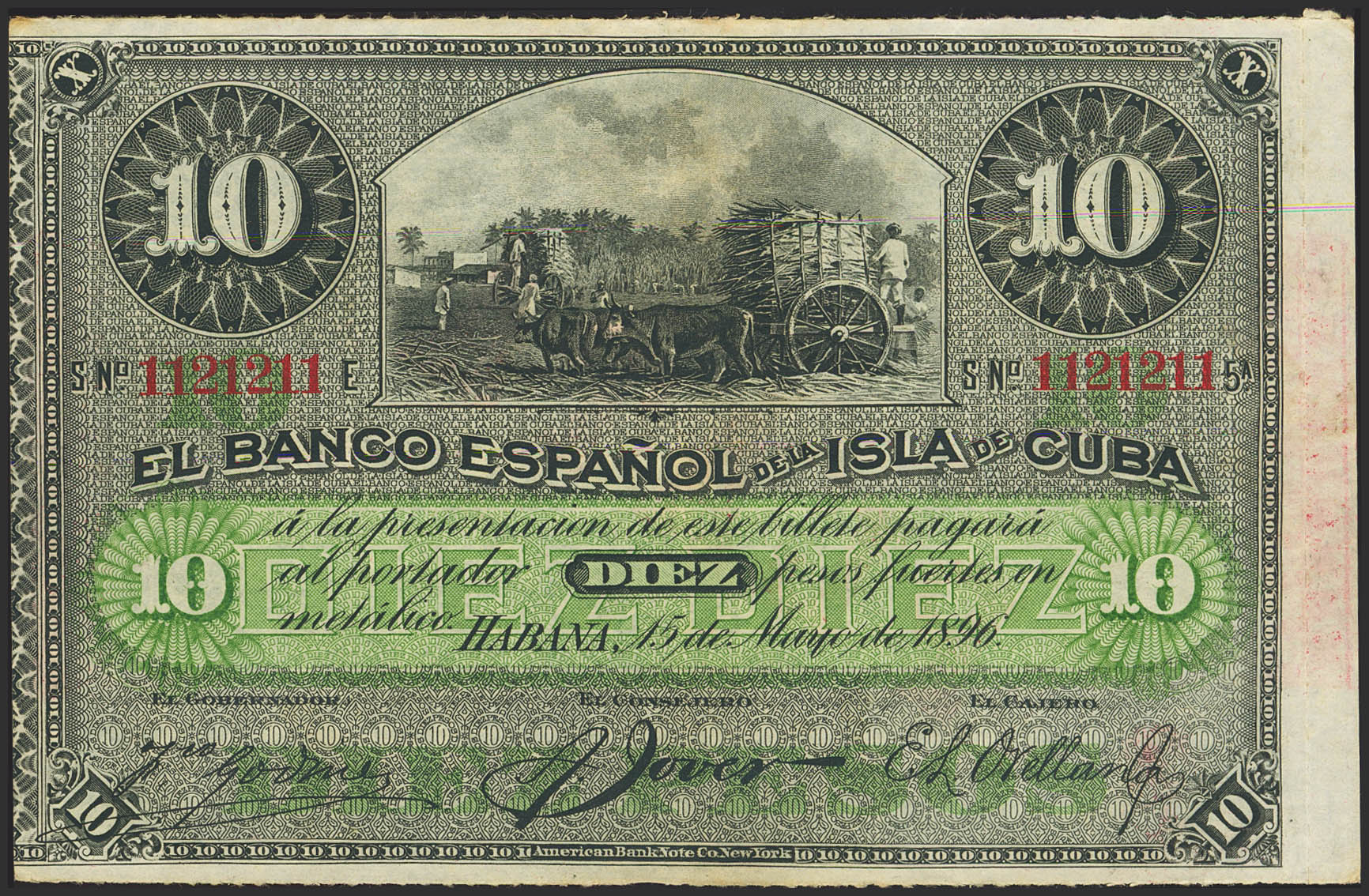 SPANISH BANK OF THE ISLAND OF CUBA. 10 pesos. May 15, 1896. Series E and with SILVER overlay, on the back and capicua numbering. (Edifil 2023: 82). Very rare with capicúa numbering. Good Extremely Fine.