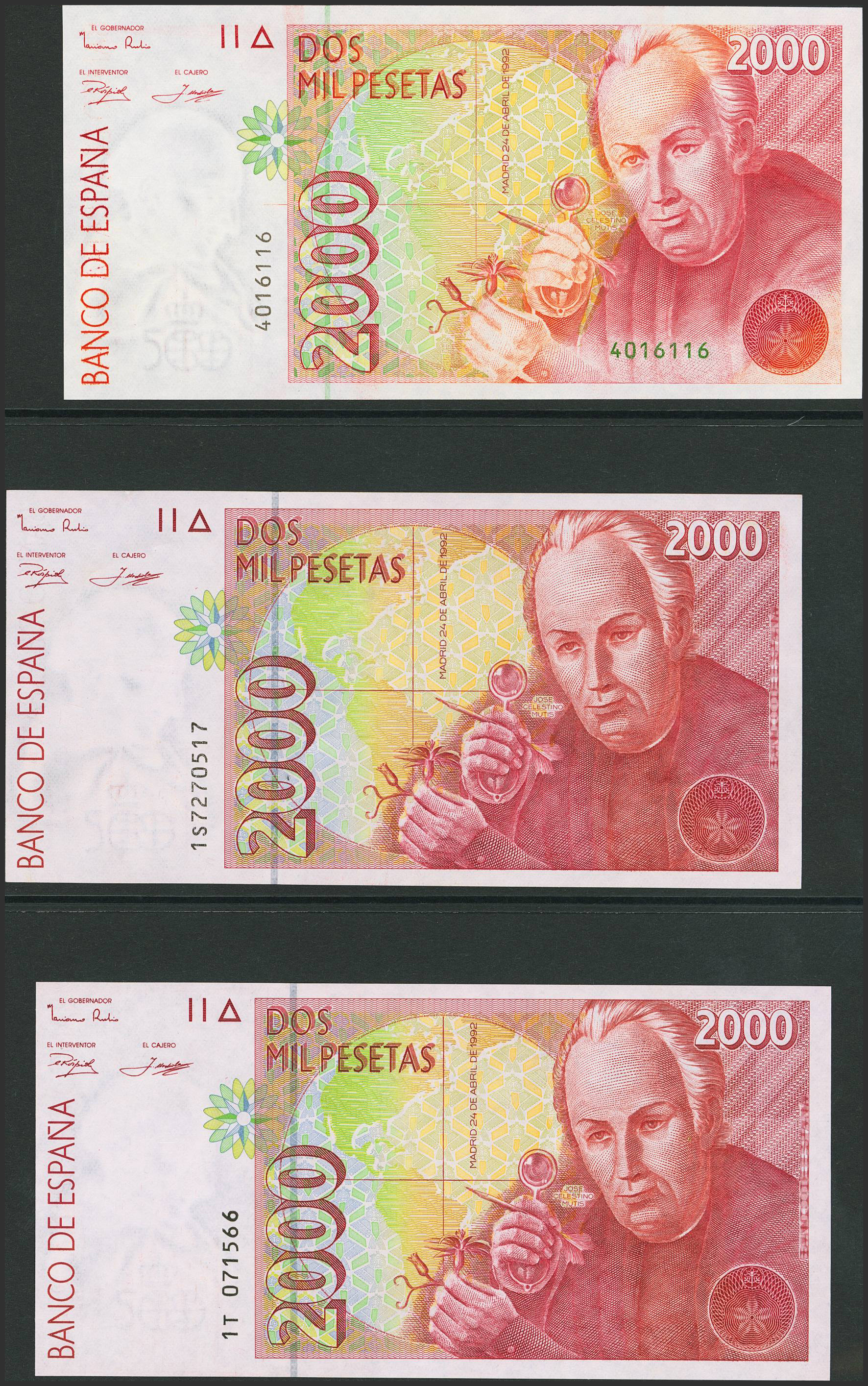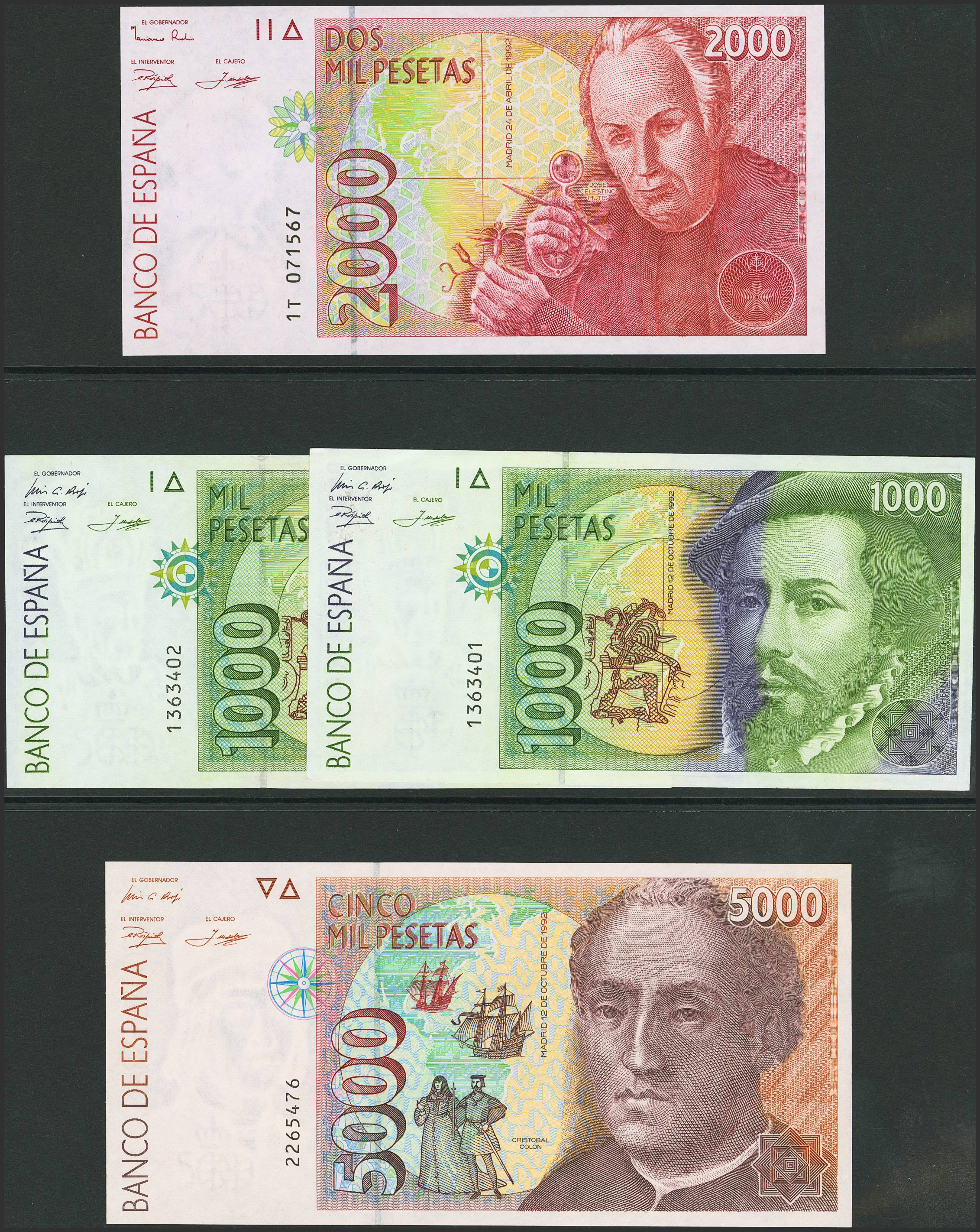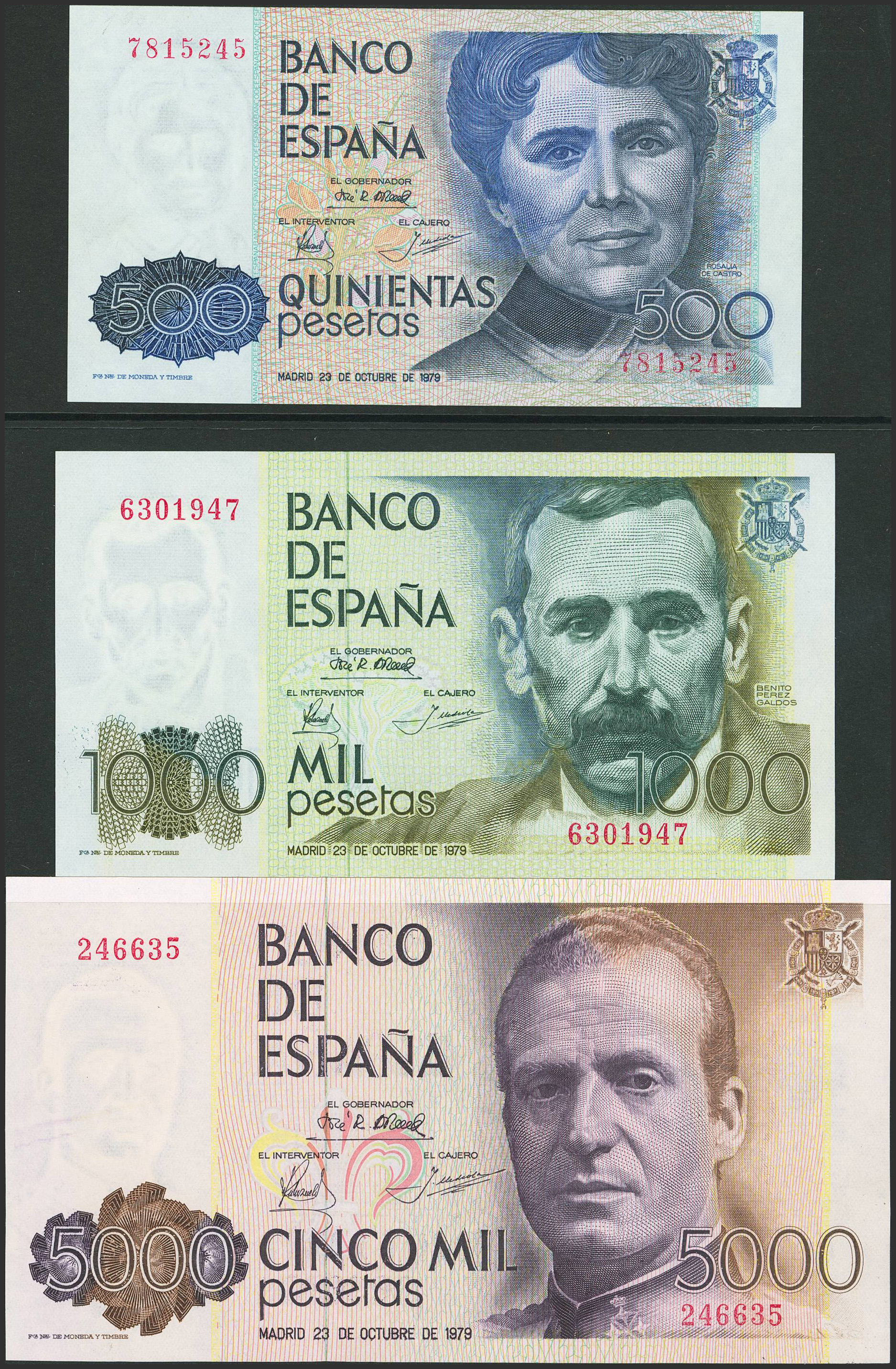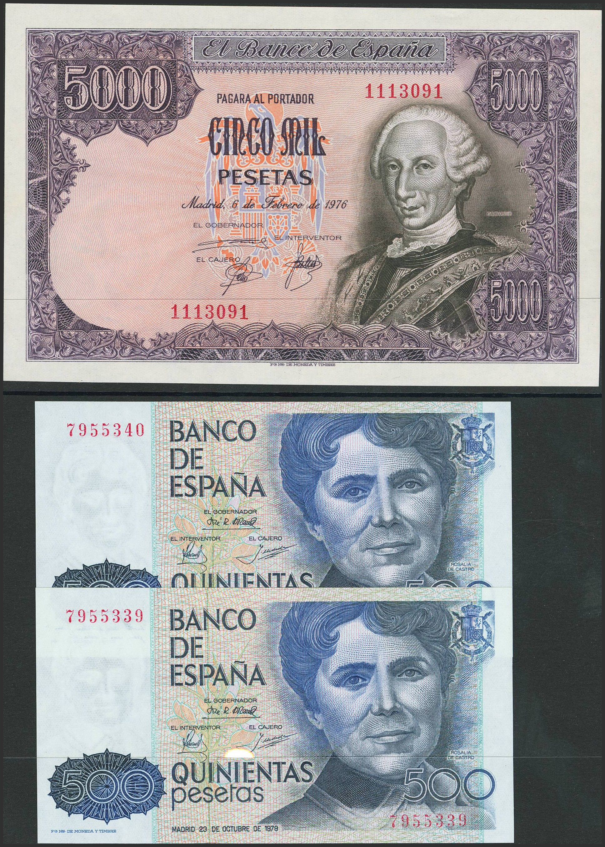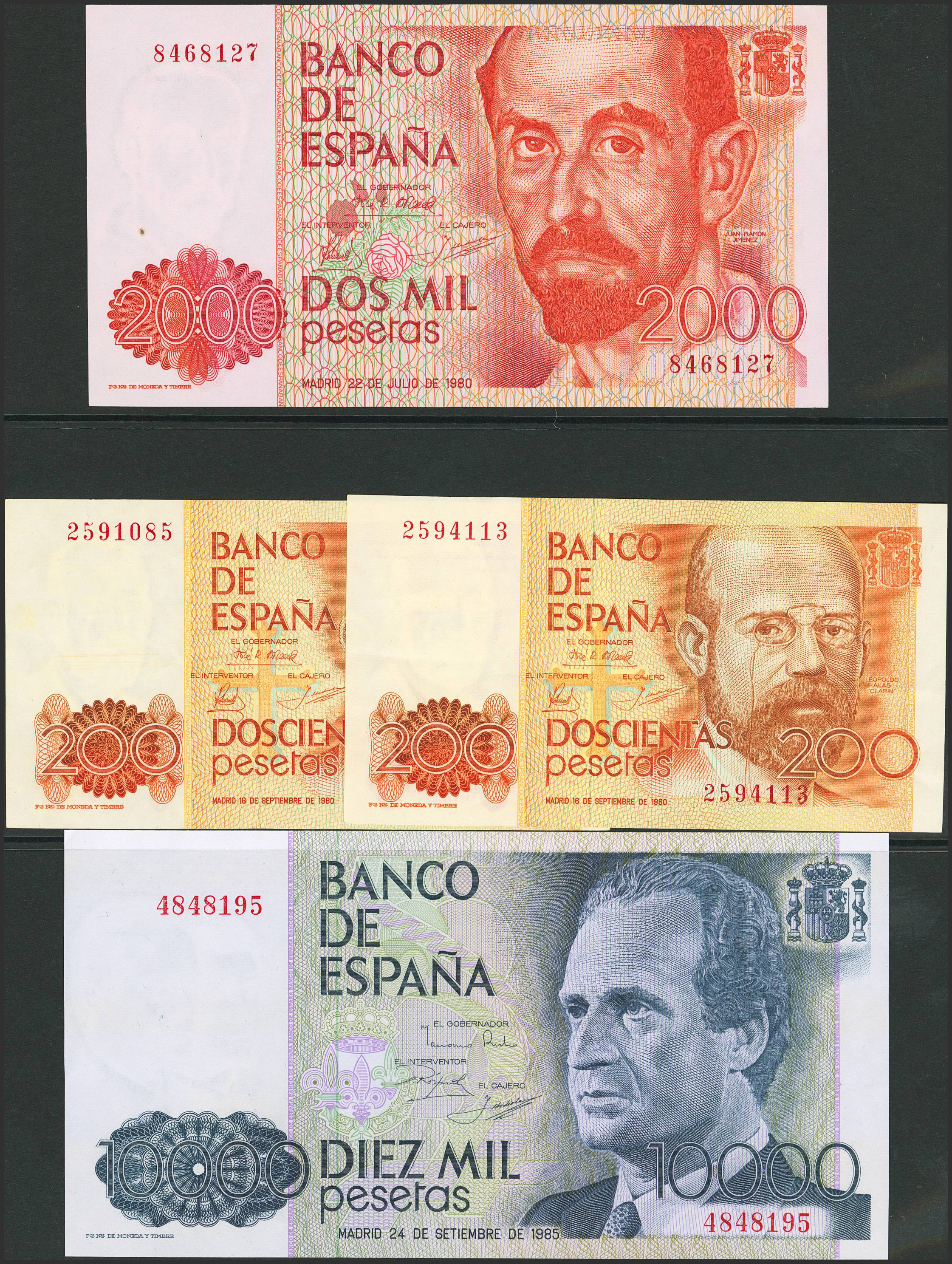 Beautiful and complete collection of 17 banknotes issued in the period of Juan Carlos I only missing the 10,000 Pesetas of 1992, the vast majority Uncirculated/ Almost Uncirculated except for the two 200 peseta banknotes of September 16, 1980 (Almost Extremely Fine/ Good Very Fine) and the 500 pesetas of October 23, 1979 (Nº7955340)(Good Extremely Fine). MAGNIFICENT SET.