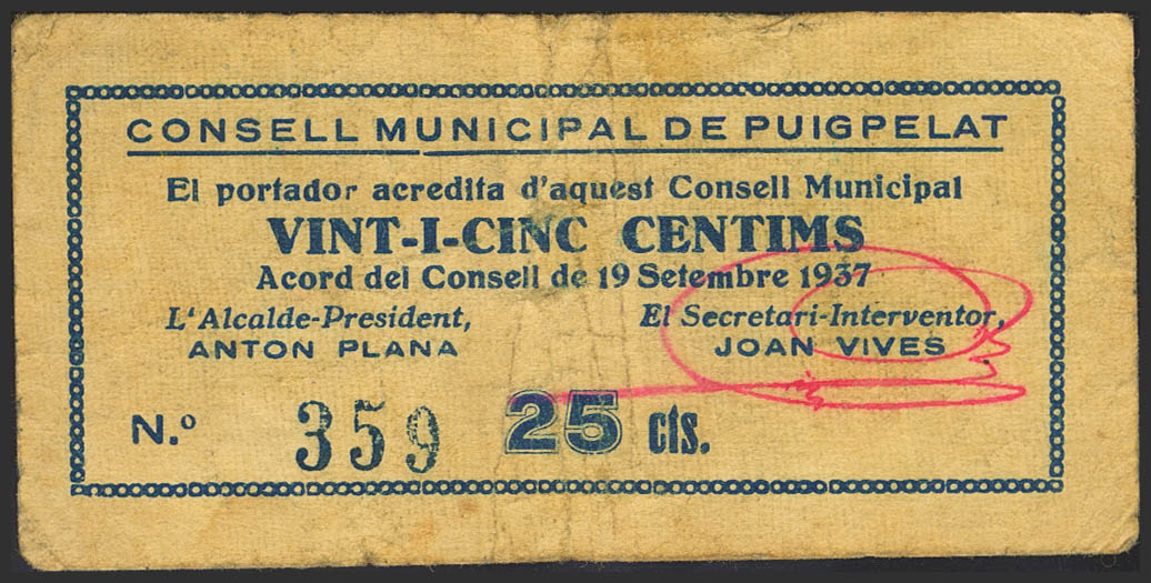 PUIGPELAT (TARRAGONA). 25 Cents. September 1937. (González: 9497). Very rare. Very Fine.