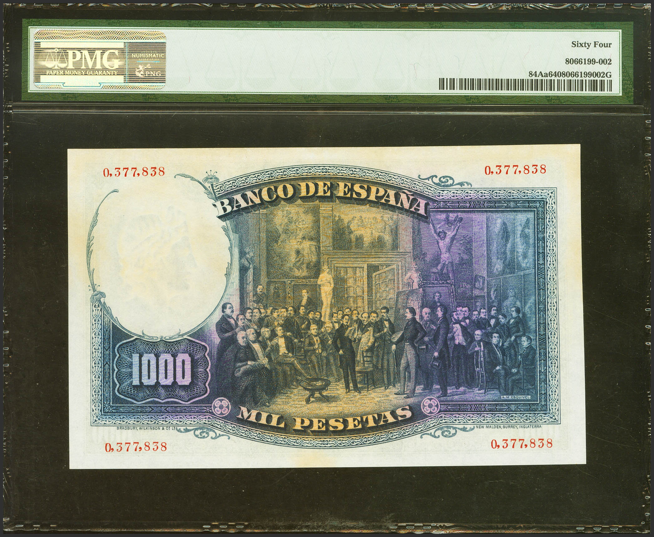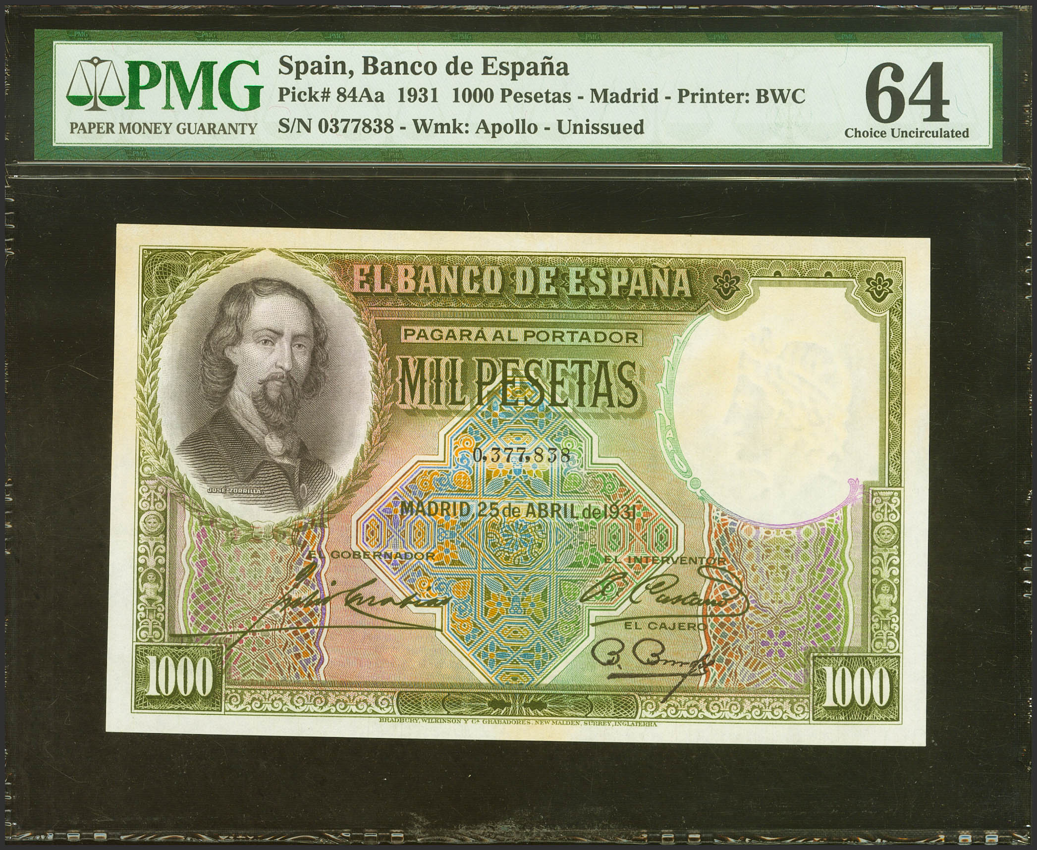 1000 Pesetas. April 25, 1931. No series. (Edifil 2023: 362, Pick: 84Aa). Appreciable stain of time. Almost Uncirculated. PMG64 encapsulation.