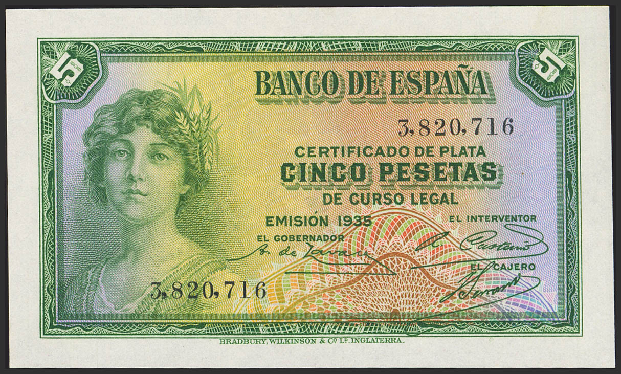 5 Pesetas. 1935. Silver Certificate. No serie. (Edifil 2023: 363). It retains all its original finish. Uncirculated.