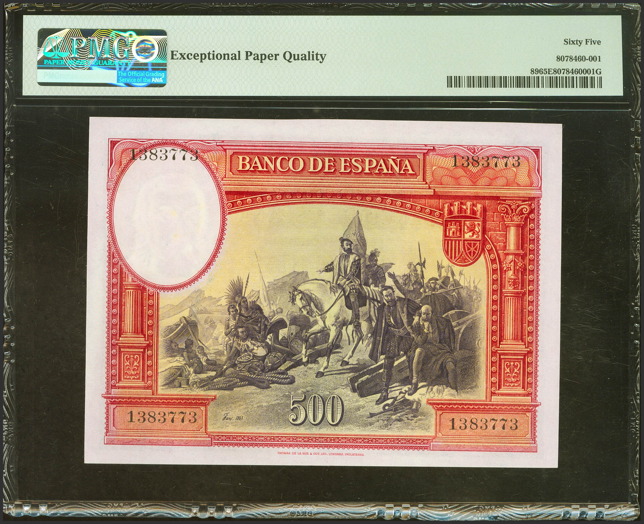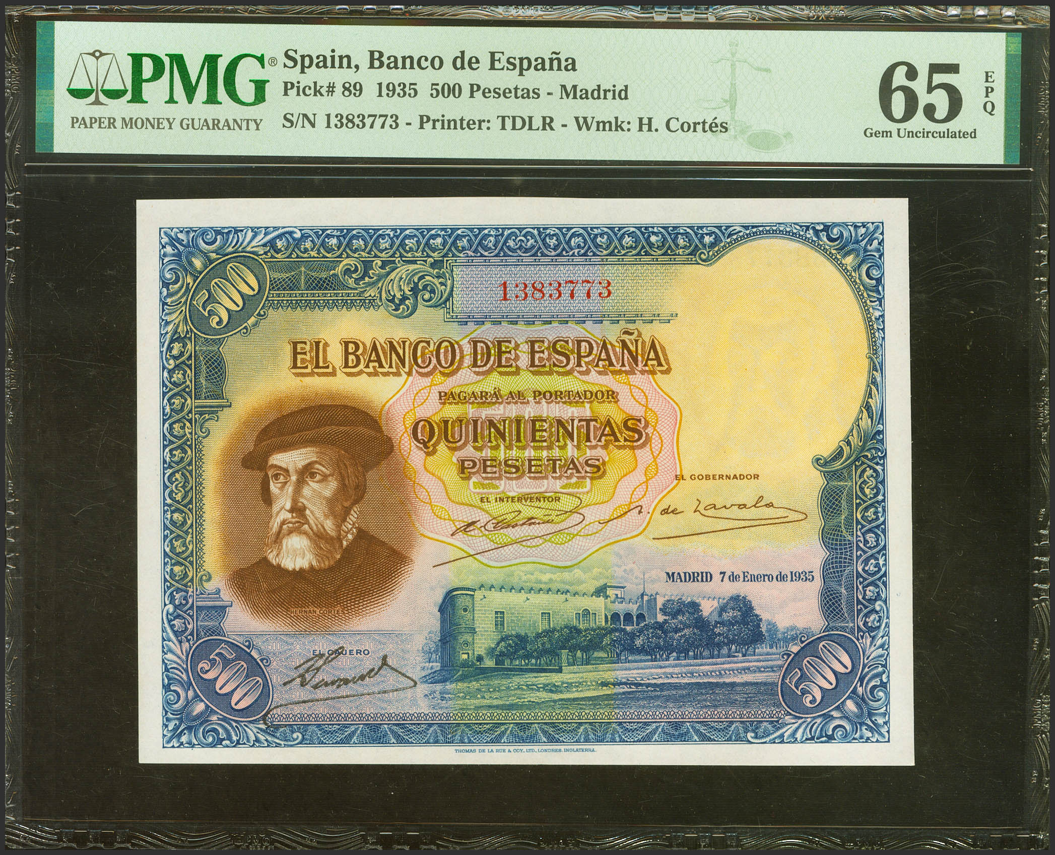 500 Pesetas. January 7, 1935. No series. (Edifil 2023: 365, Pick: 89). Original sizing. Uncirculated. PMG65EPQ package.