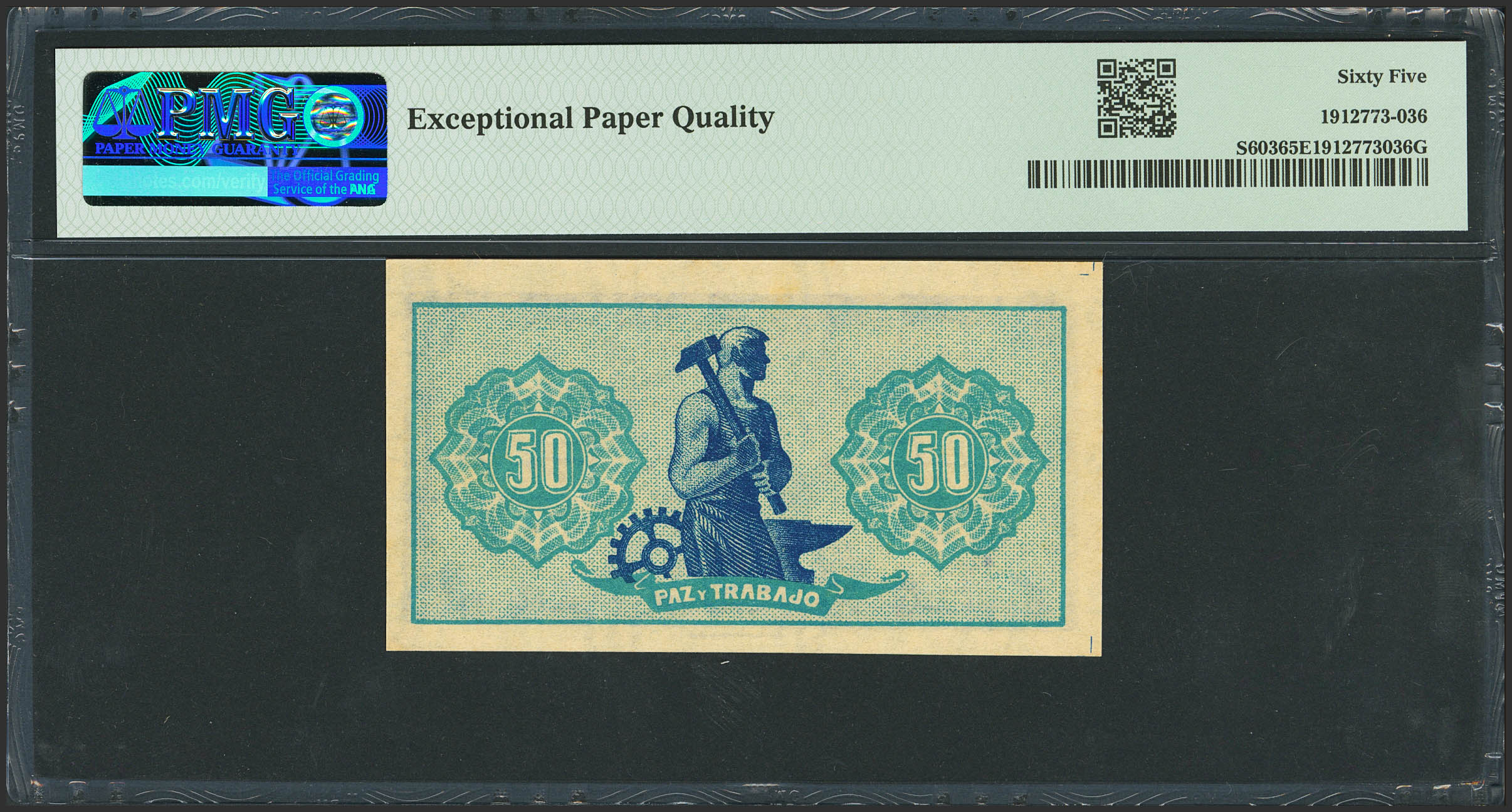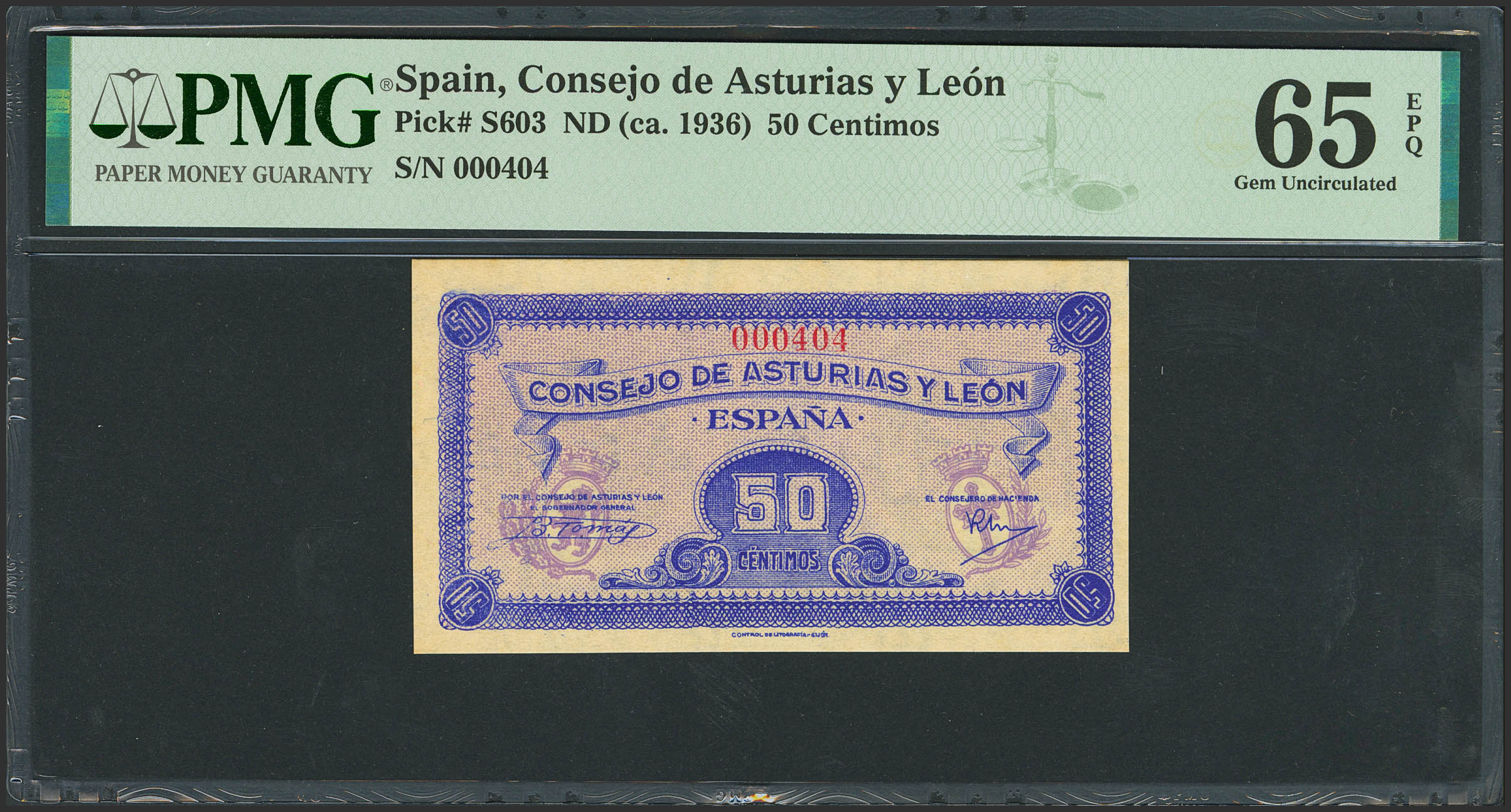 50 Cents. 1937. Asturias and León. Without series and very low numbering. (Edifil 2021: 396, Pick: S603). Very rare, especially in this exceptional quality, original sizing. Uncirculated. PMG65EPQ package.