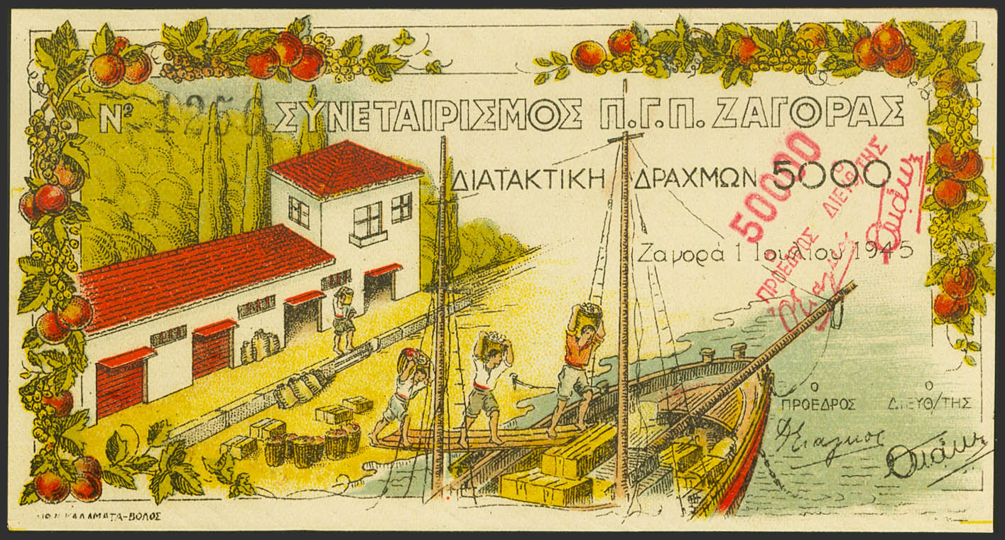 GREECE. Zagora. 50000 Drachmai overprint on 5000 Drachmai. 1945. (Pick unlisted, Hellas 298a). About uncirculated.