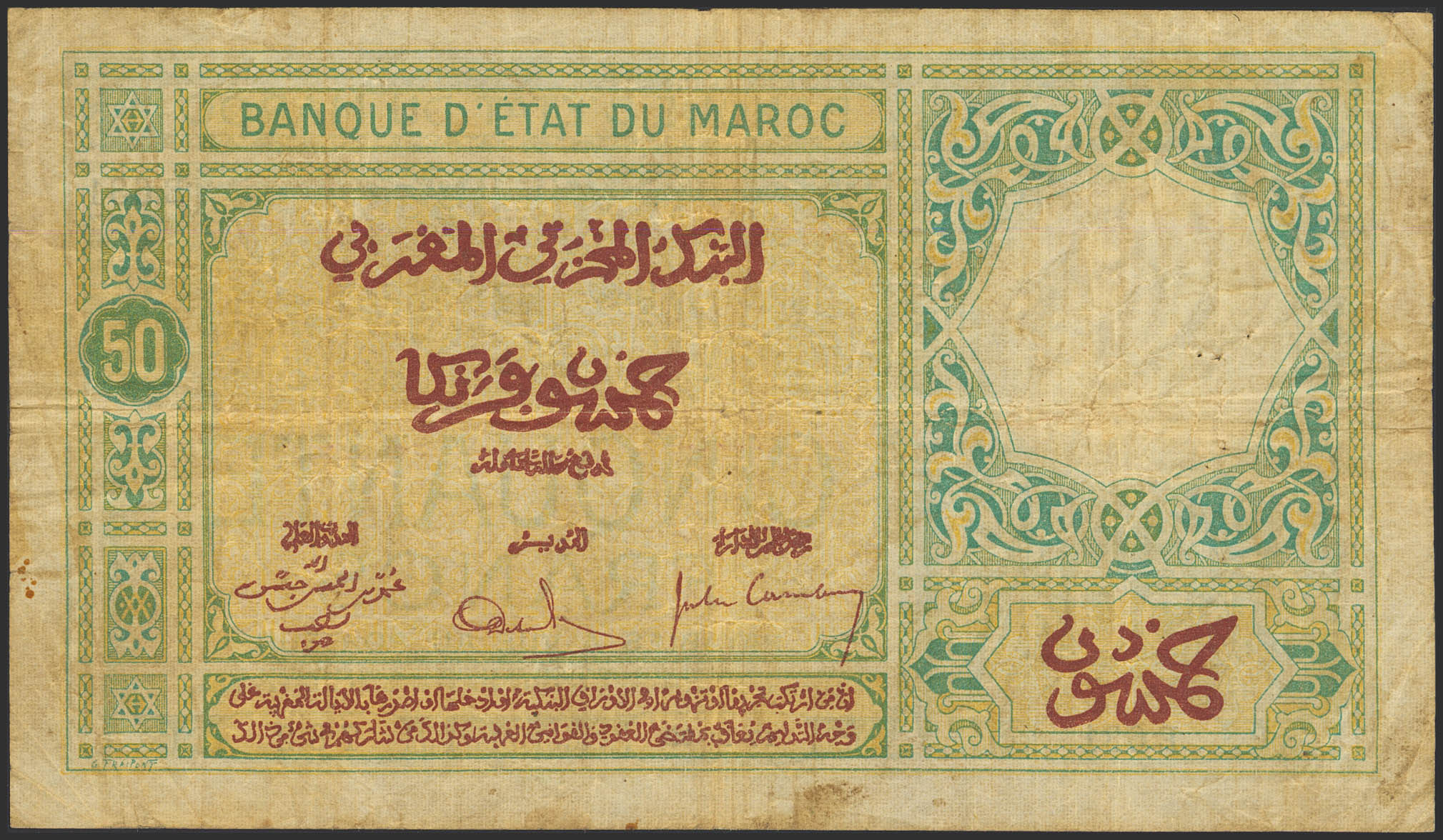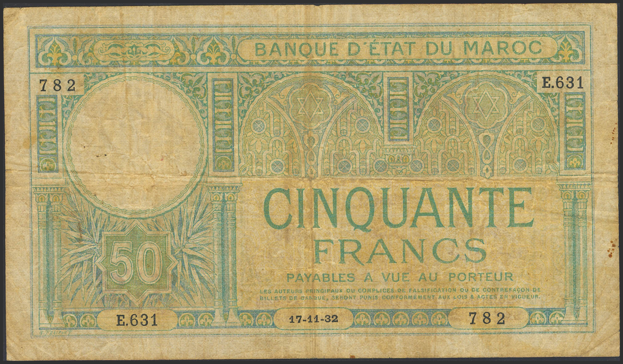 MOROCCO. 50 Francs. 17 November 1932. (Pick: 19). Very rare. Very Good.