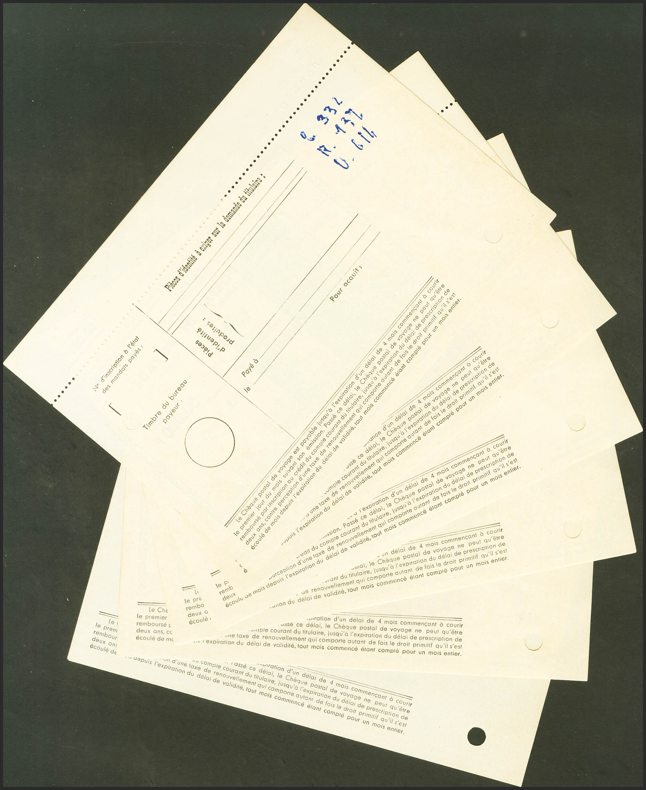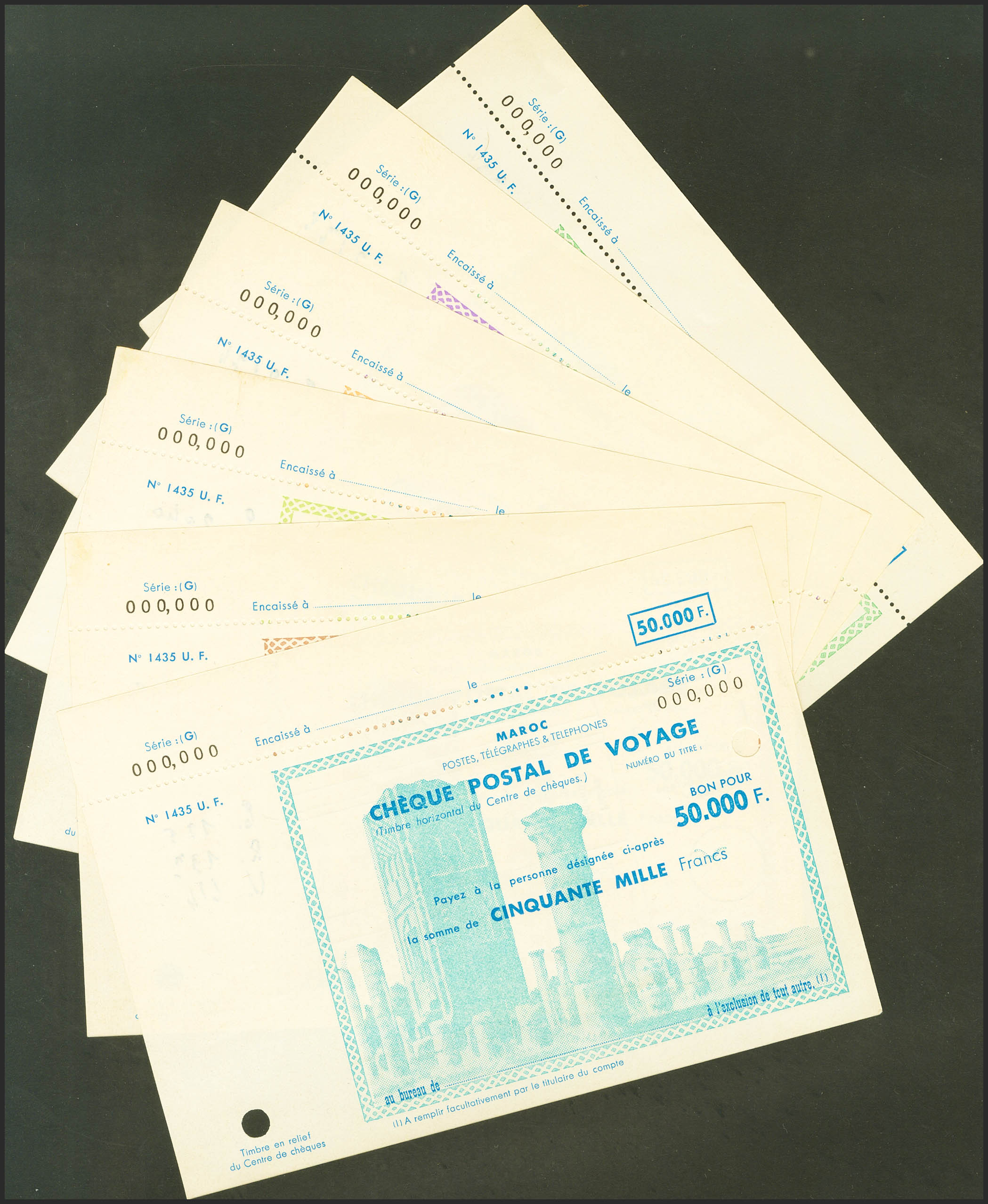 MORROCO. Set of 6 checkspostcards of 50000 Francs, serial G and numbering 000000, matrix and in different colors, all of them handwritten. Rare set, spots. Uncirculated.