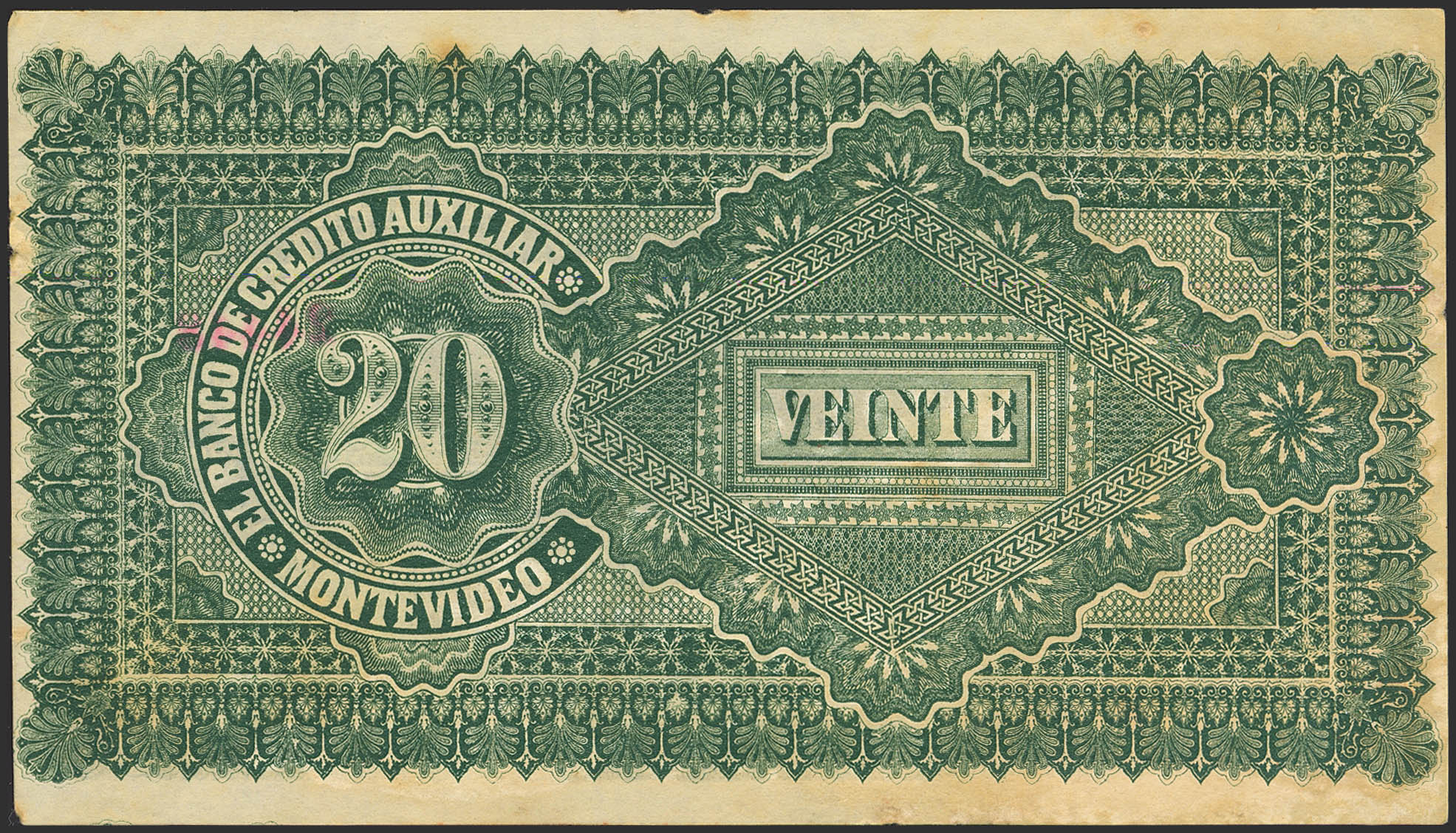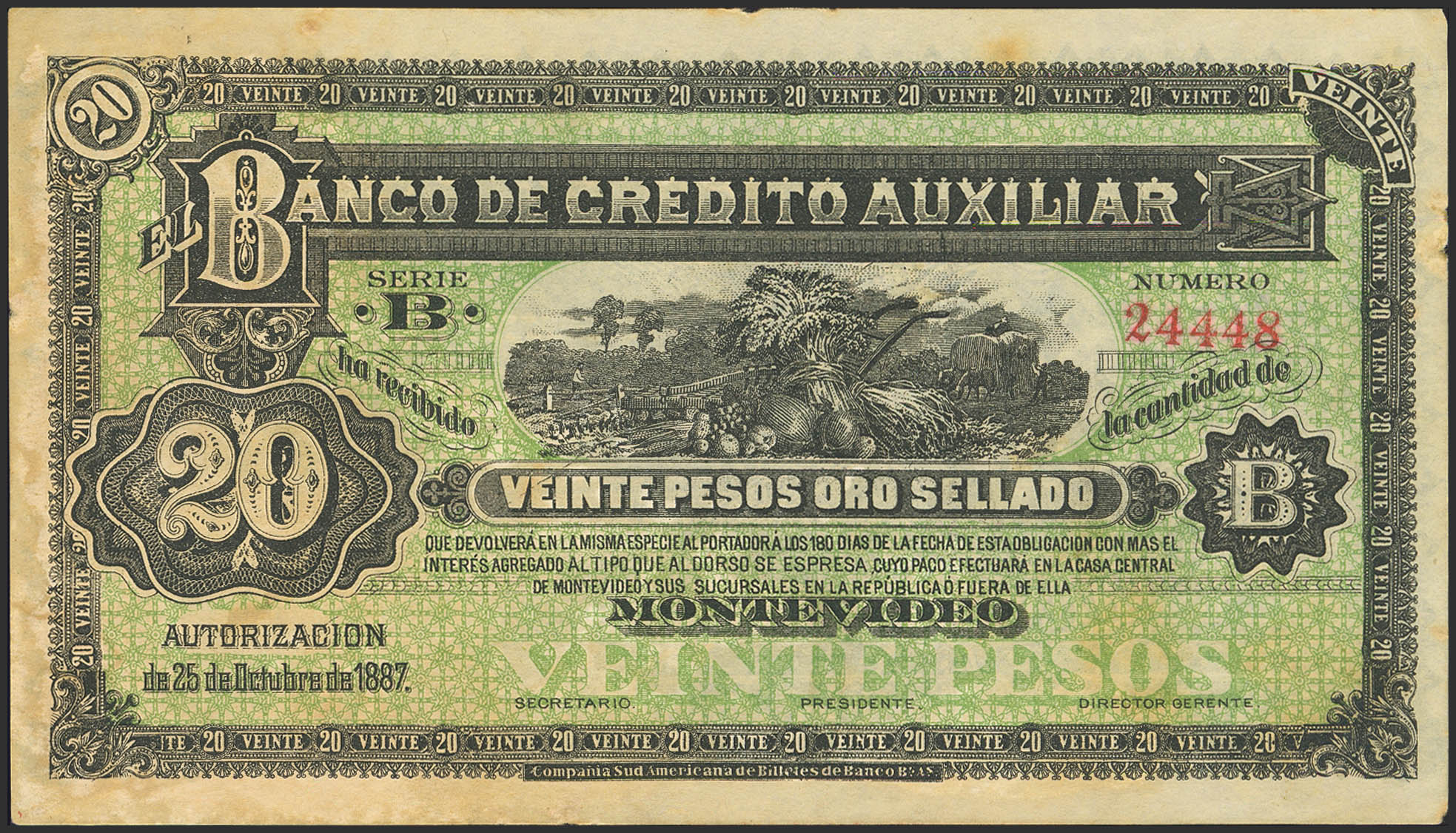 URUGUAY. 20 Pesos Oro Sellado. 25 October 1887. (Pick: 164r). Very Fine.