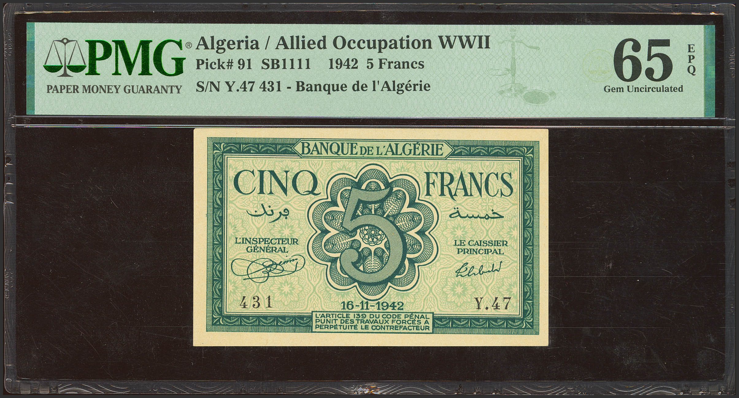 ALGERIA. 5 Francs. 16 November 1942. (Pick: 91). PMG65EPQ.