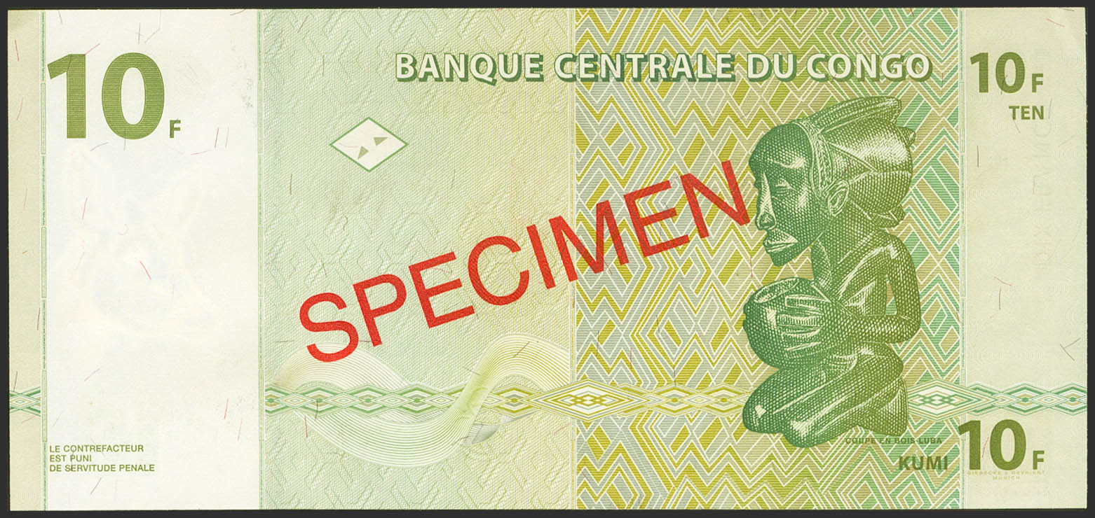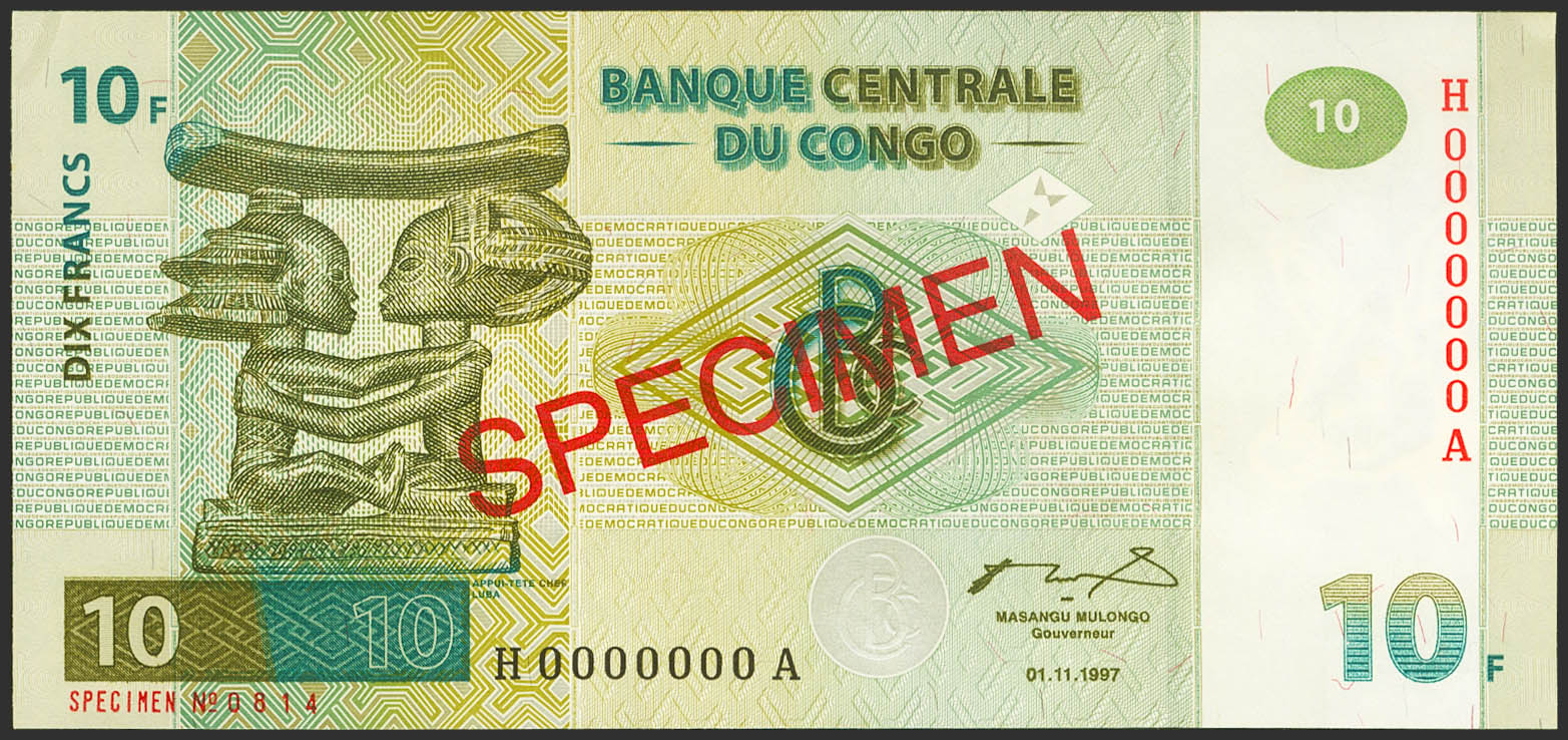CONGO DEMOCRATIC REPUBLIC. 10 Francs. 1 November 1997. SPECIMEN. (Pick: 87s). Less Uncirculated.
