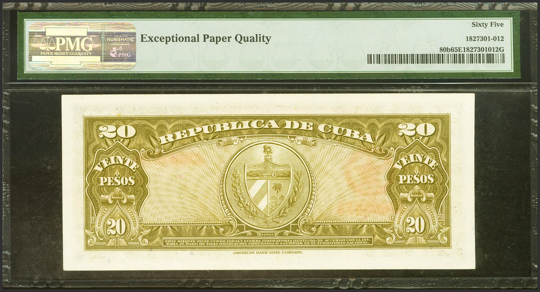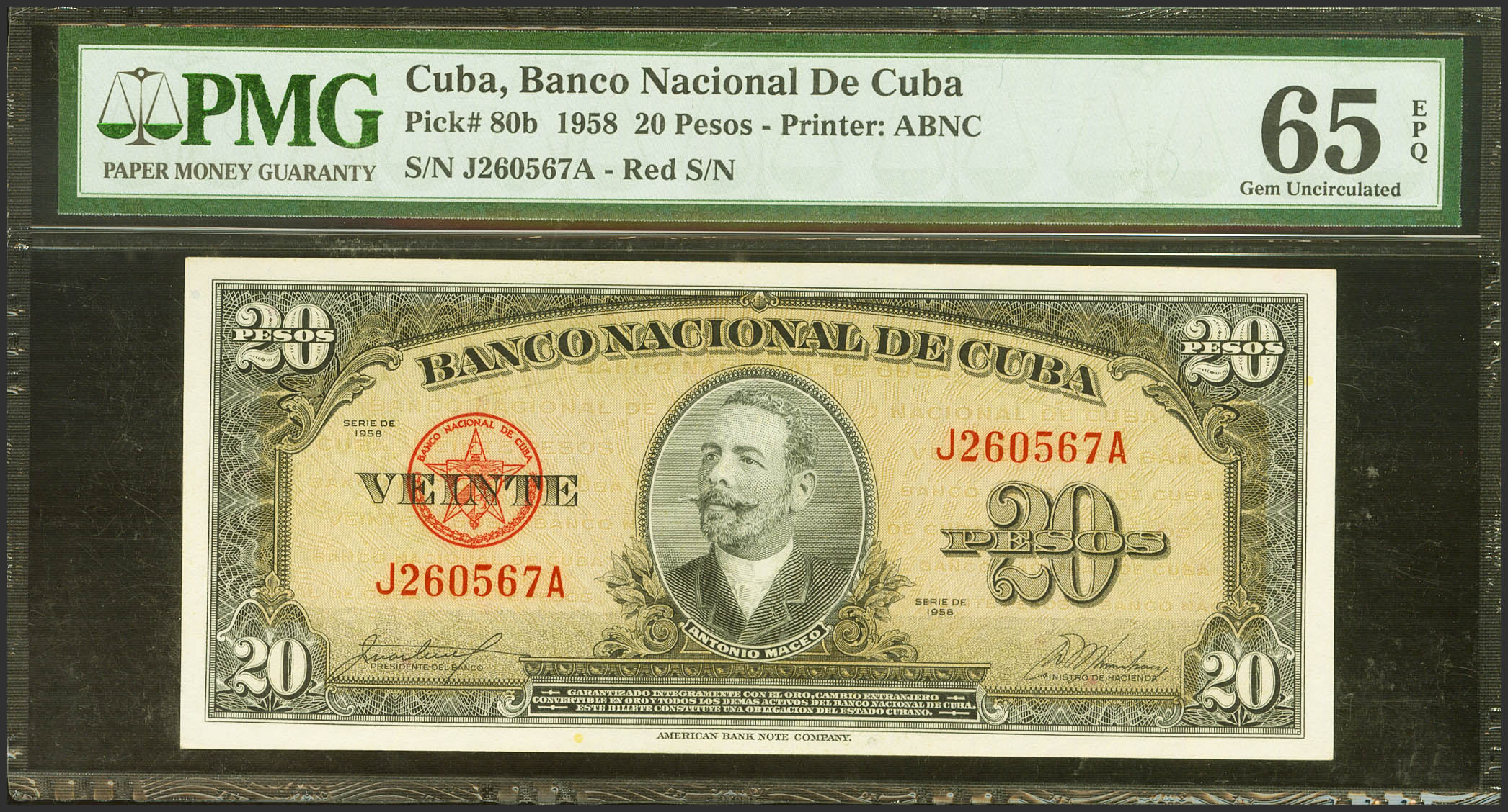 CUBA. 20 Pesos. 1958. (Pick 80b). PMG65EPQ.