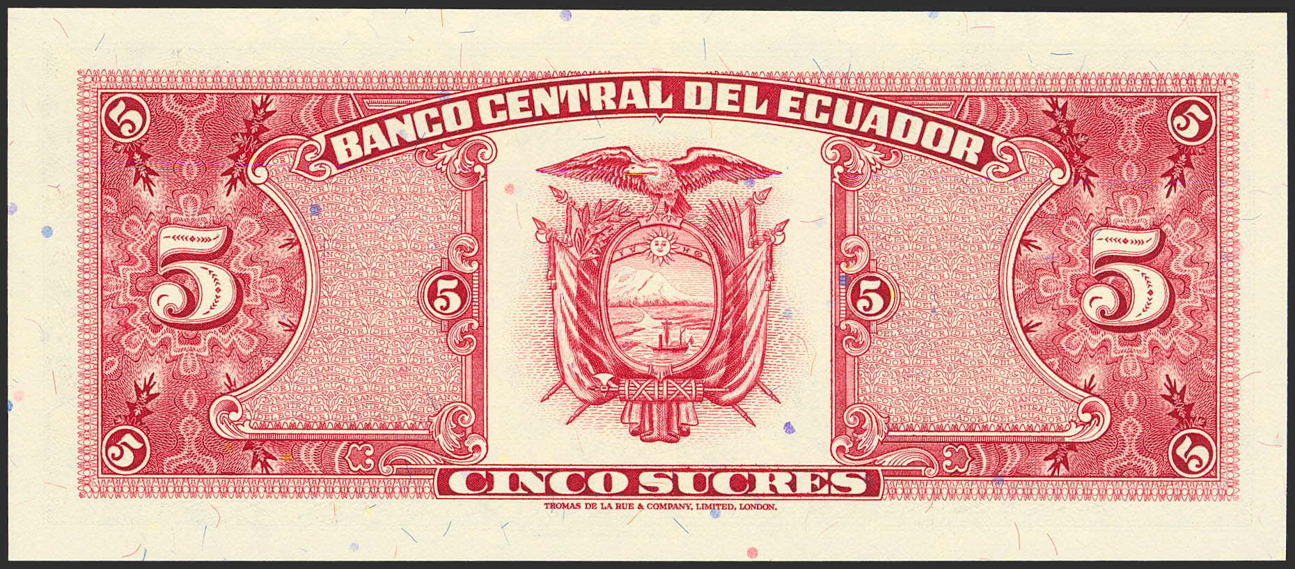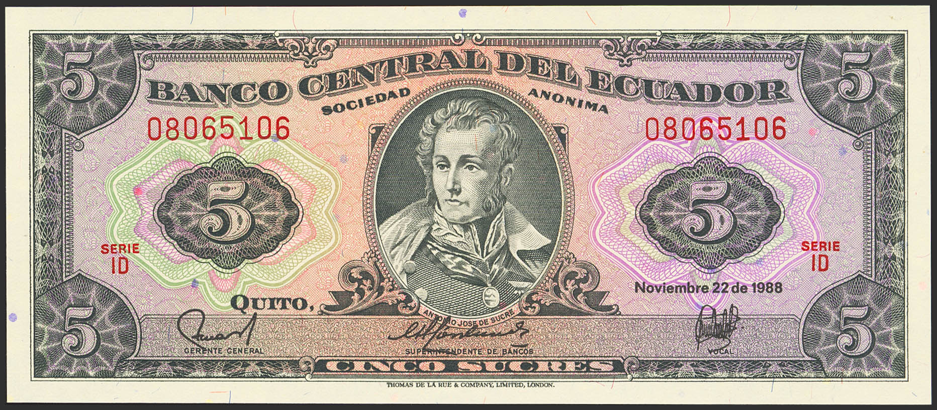 ECUADOR. 5 Sucres. 1988. Serial ID. (Pick: 113d). Uncirculated.
