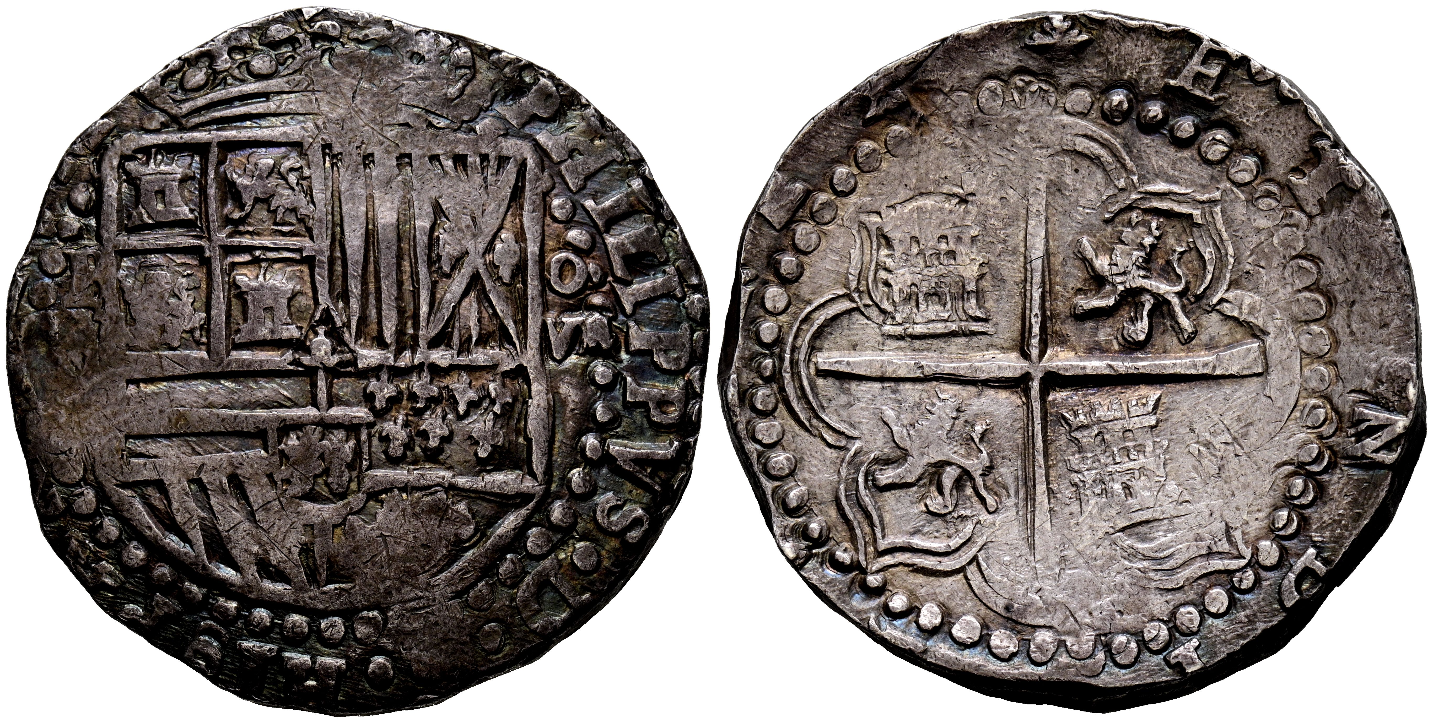 PHILIP II (1556-1598). 8 Reales (Ar. 27.73g/38mm). S/D. Potosi. (Cal-2019-Type 195). Good Very Fine. Beautiful bluish patina.