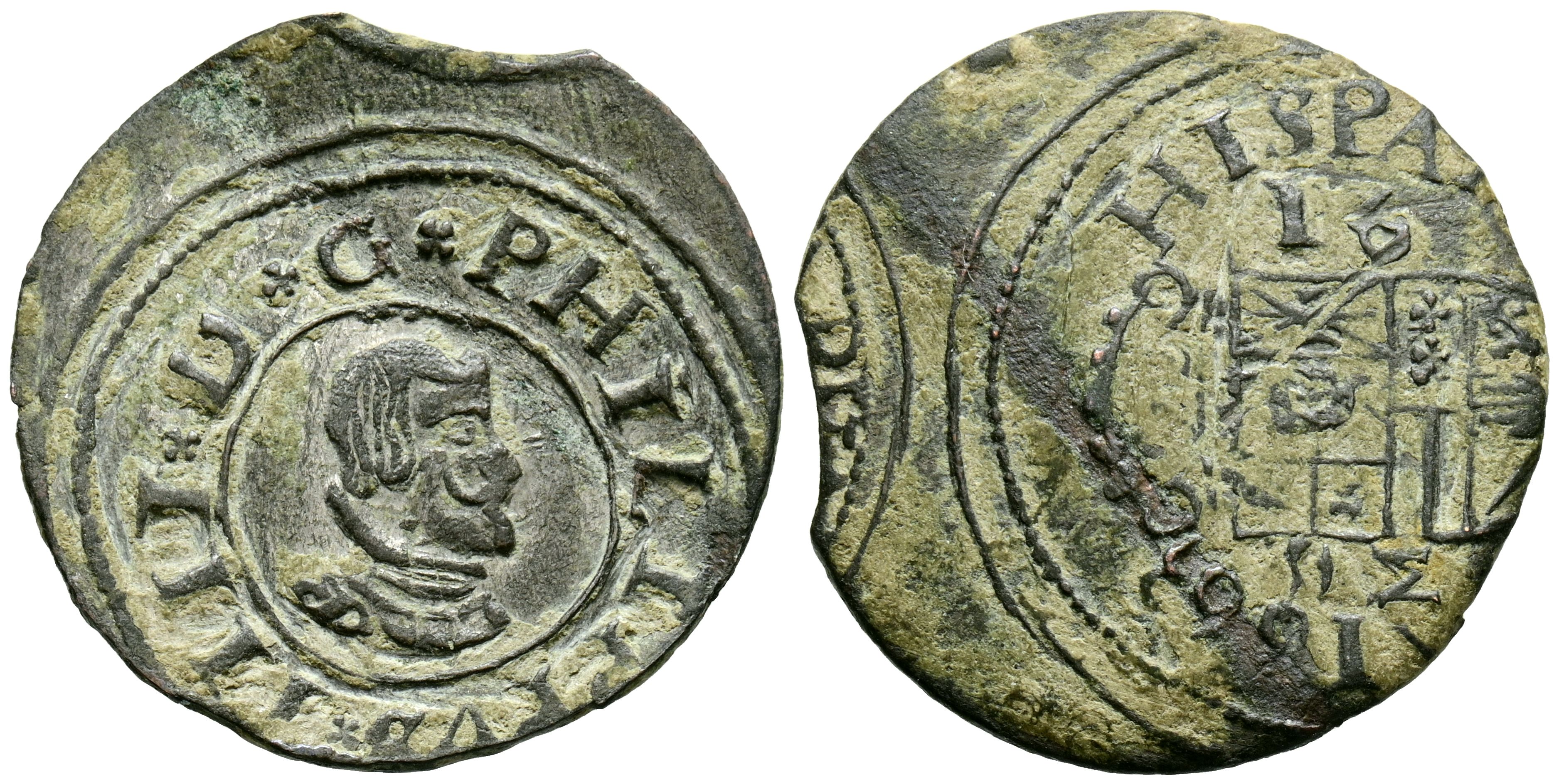PHILIP IV (1621-1665). 16 Maravedís (Ae. 4.65g/27mm). 1663. Valladolid M. (Cal-2019-510). Very displaced coinage. Start of the next visible rail coin. Good Very Fine.
