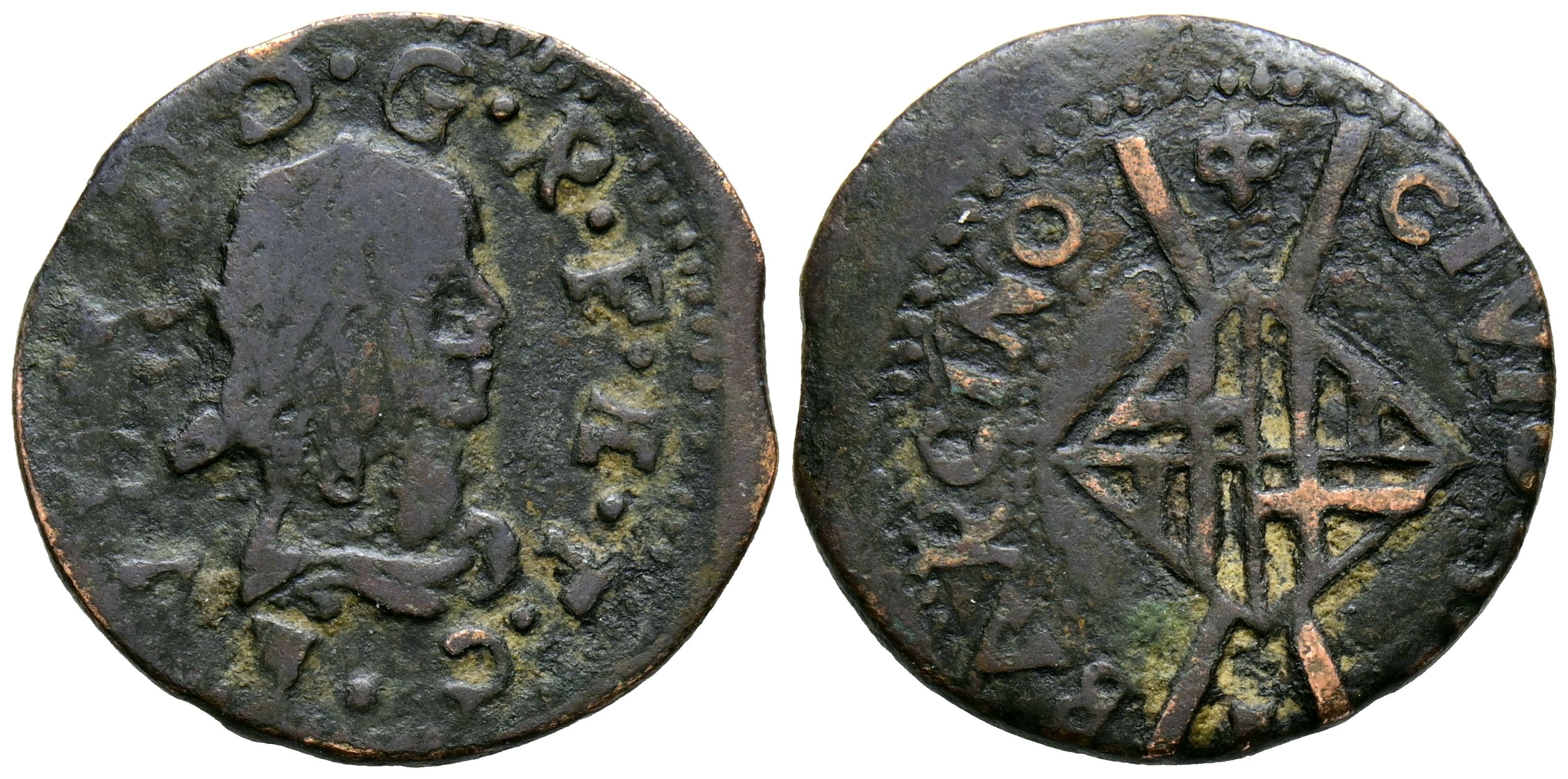English REAPERS WAR (1640-1652). Whether. (Ae. 3.75g/21mm). Date not visible, 1643 or 1644. Barcelona. (Cal-2019-Type 20). First bust of Louis XIV. Very Fine.