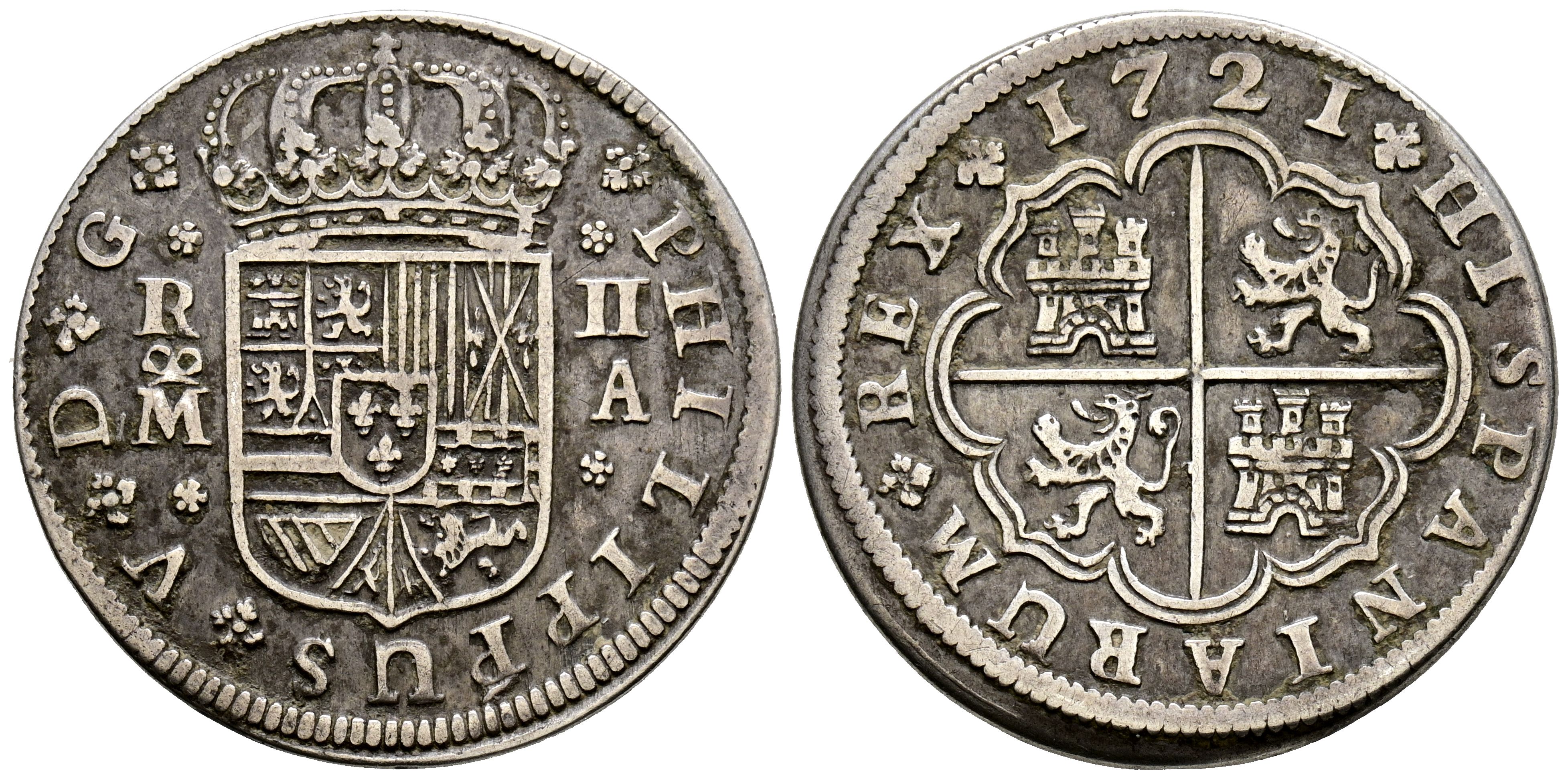 PHILIP V (1700-1746). 2 Reales. (Ar. 5.38g/27mm). 1721. Madrid A. (Cal-2019-774). Very Fine.