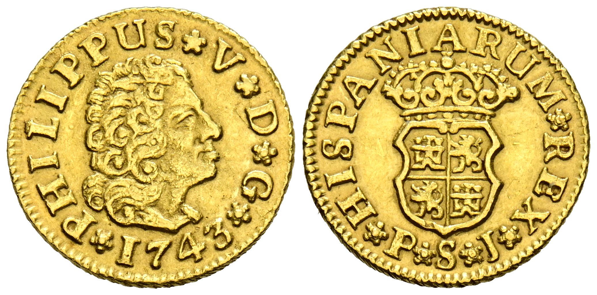 PHILIP V (1700-1746). 1/2 Escudo. (Au. 1.76g/15mm). 1743. Sevilla PJ. (Cal-2019-1646). Extremely Fine. Scarce like that.