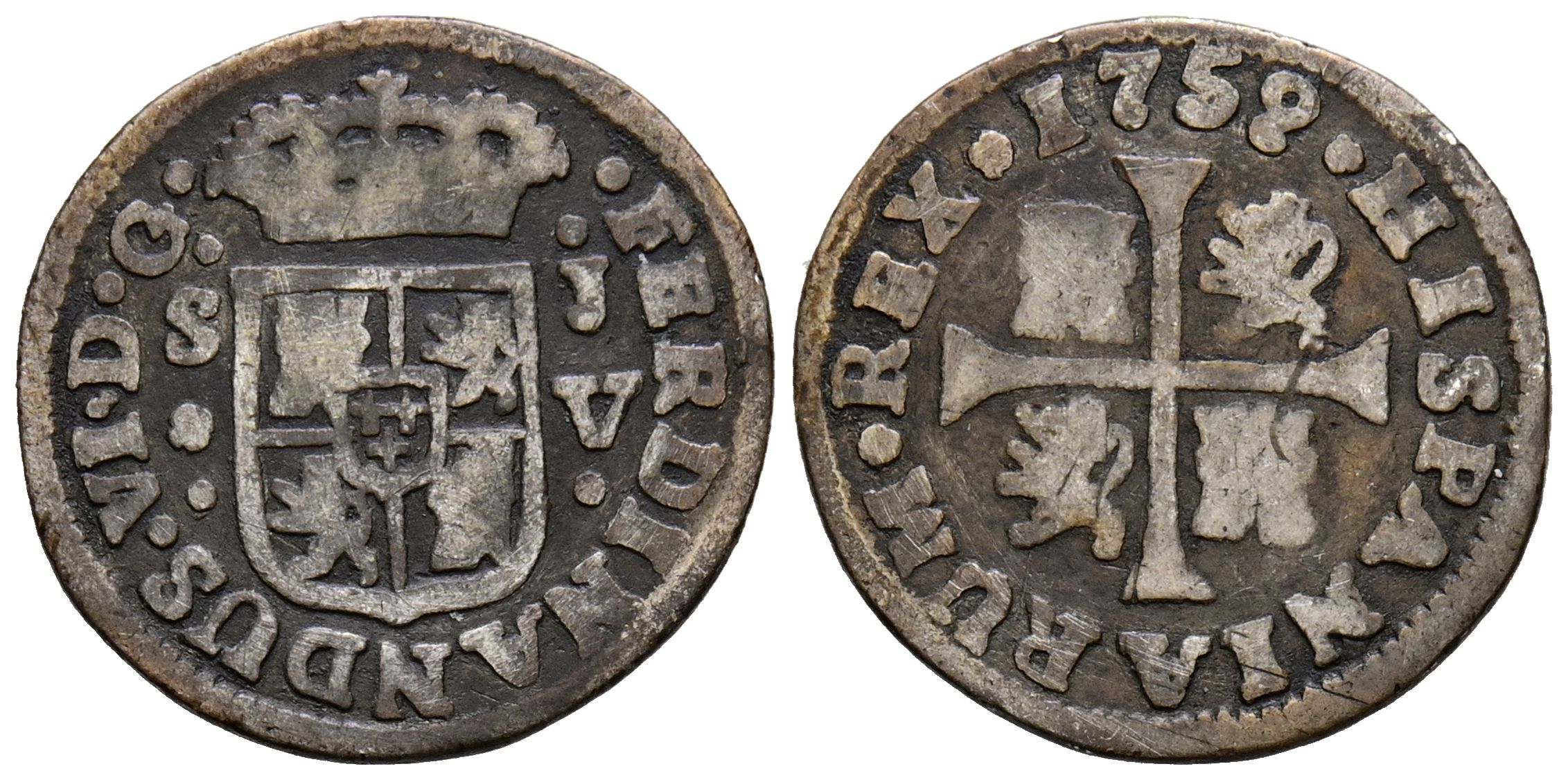 FERDINAND VI (1746-1759). 1/2 Real. (Ar. 1.22g/16mm). 1759. Sevilla JV. (Cal-2019-124). Almost Very Fine.