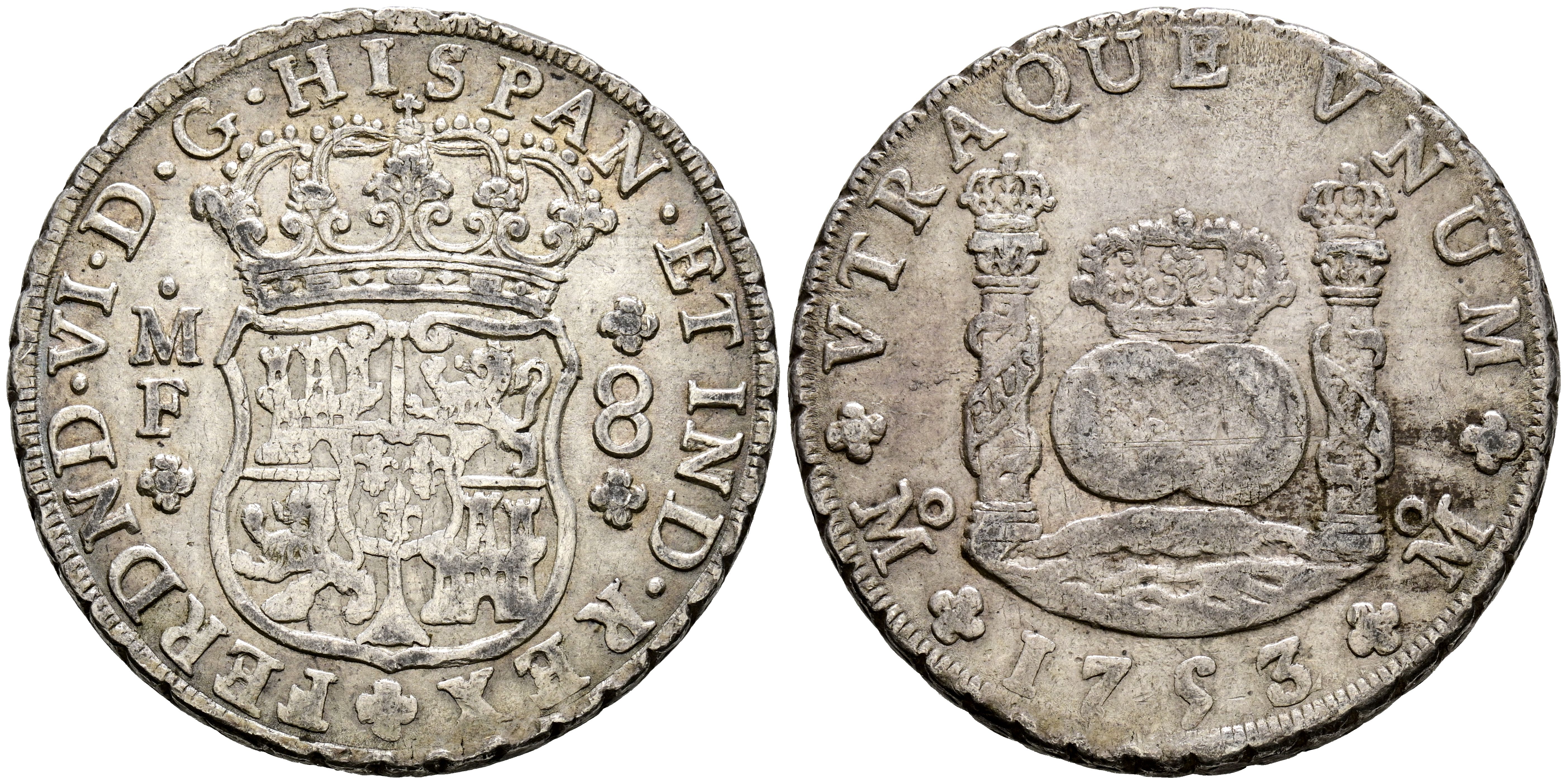 English FERDINAND VI (1746-1759). 8 Reales. (Ar. 26.93g/38mm). 1753/2. Mexico MF. (Cal-2019-478.) Overdate. Very Fine. Limited.
