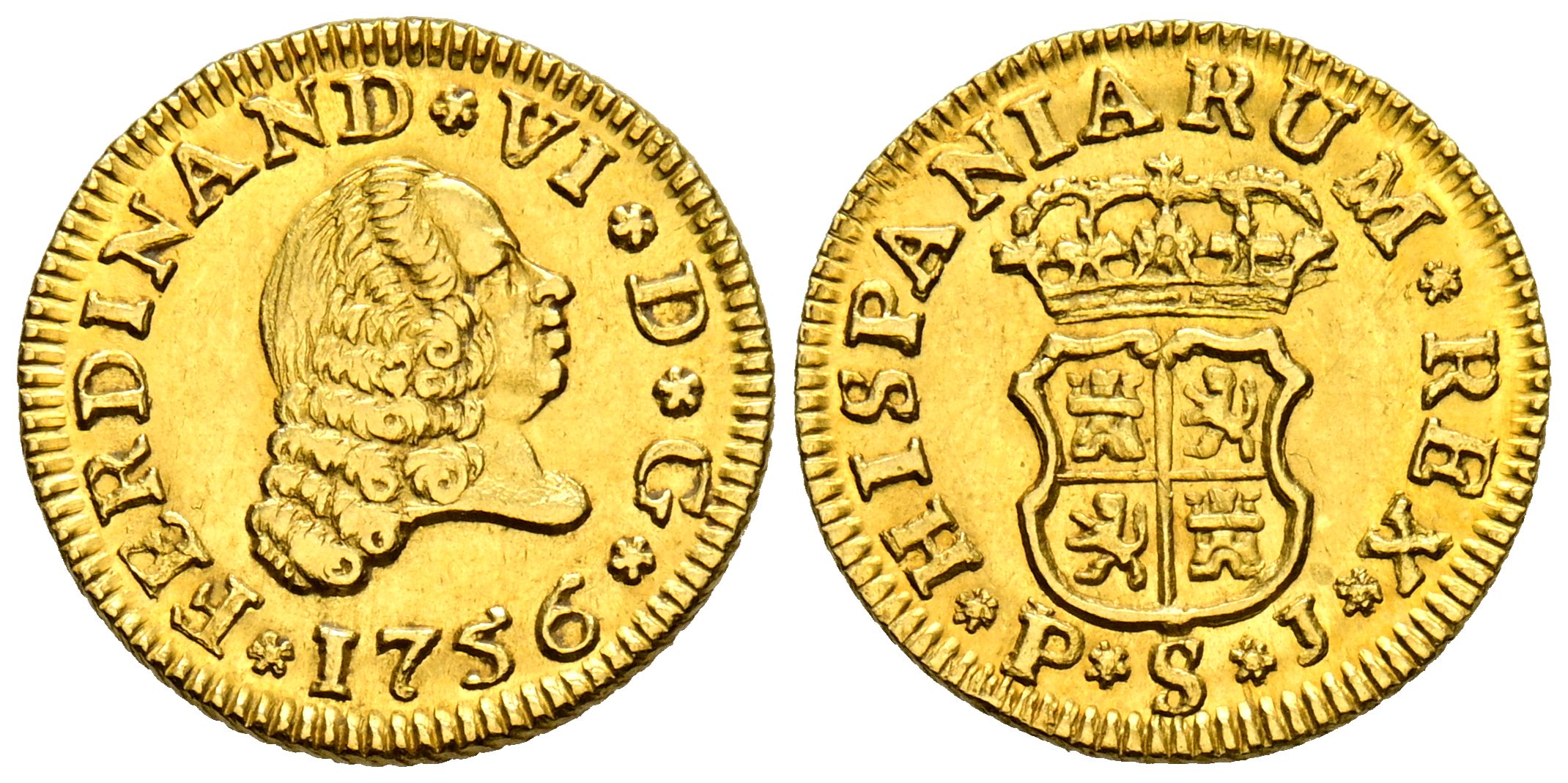 FERDINAND VI (1746-1759). 1/2 Escudo. (Au. 1.79g/15mm). 1756. Sevilla PJ. (Cal-2019-580). Good Extremely Fine. Excellent specimen.