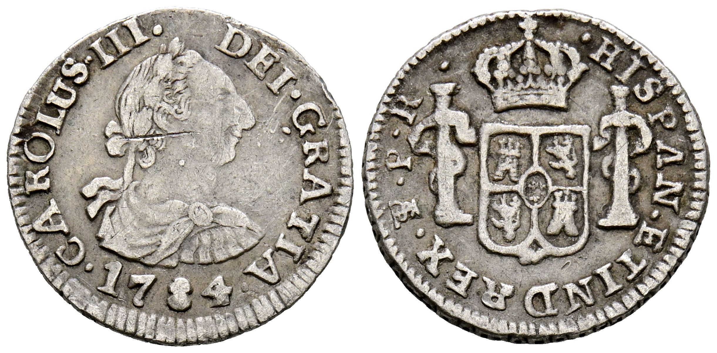 English CARLOS III (1759-1788). 1/2 Real (Ar. 1.68g/17mm). 1784. Potosí PR. (Cal-2019-261). Almost Very Fine. Limited.