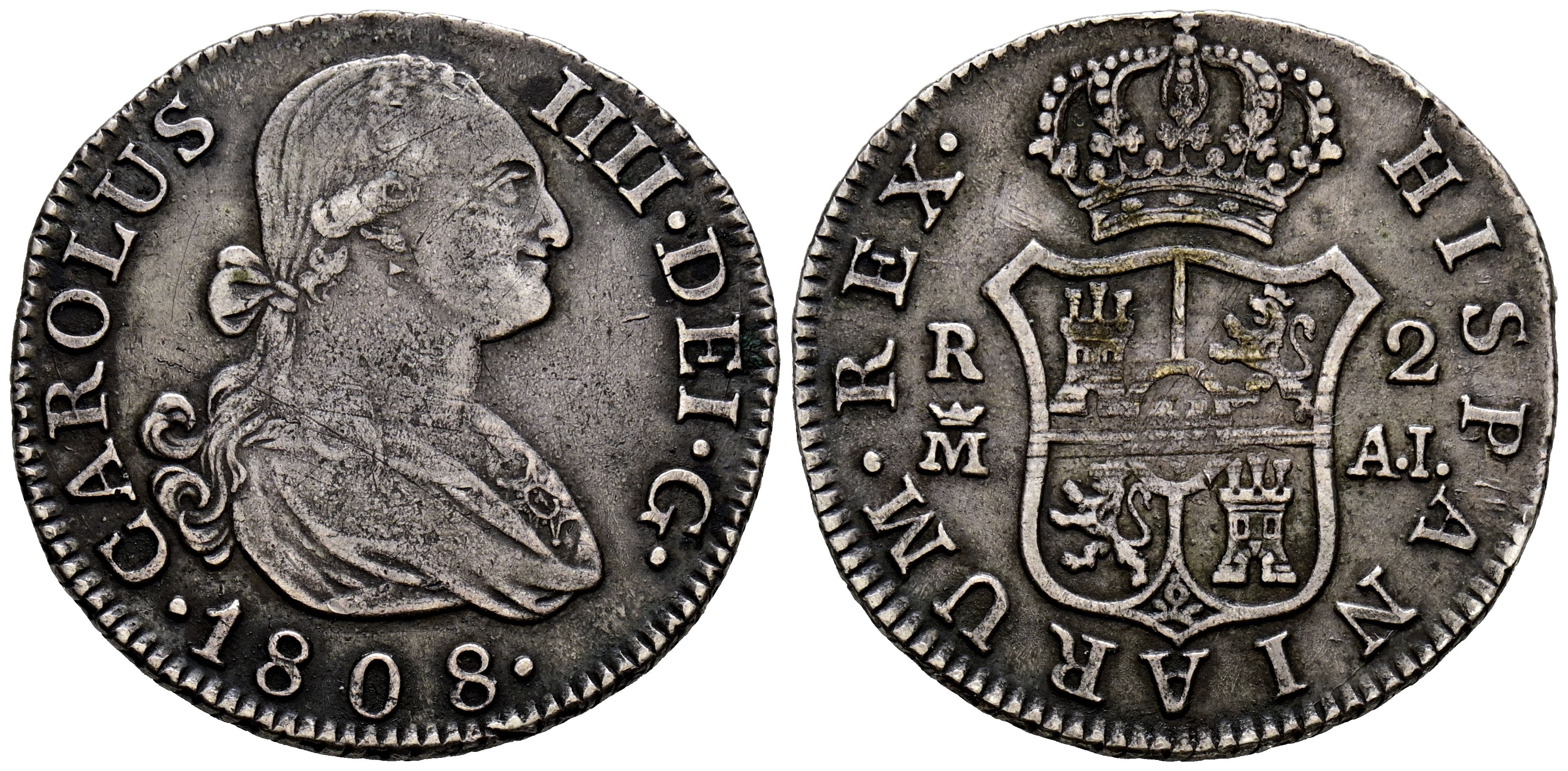 CARLOS IV (1788-1808). 2 Reales. (Ar. 5.70g/26mm). 1808. Madrid AI. (Cal-2019-619). Very Fine. Dark patina.