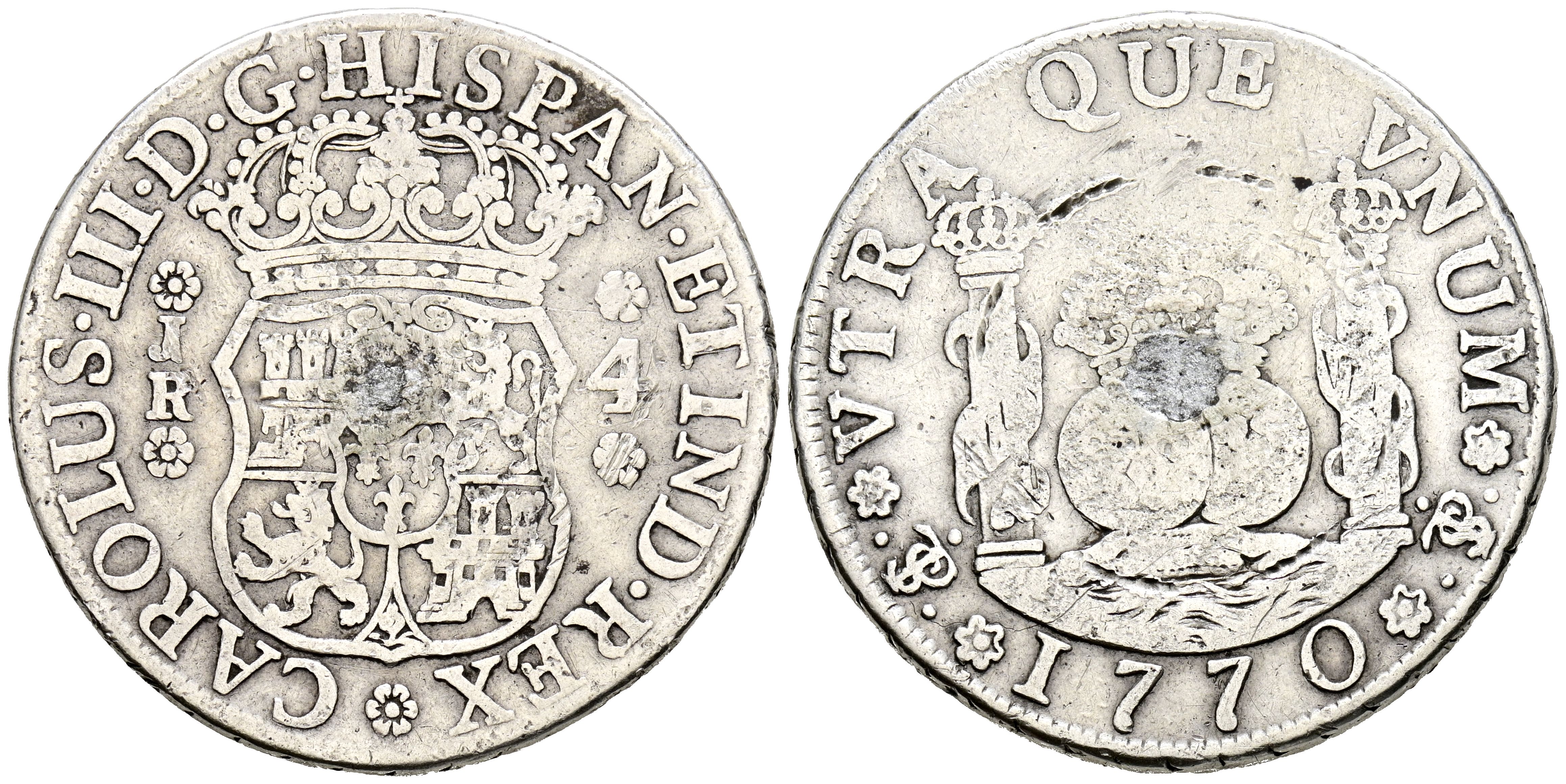 CARLOS III (1759-1788). 4 Reales. (Ar. 12.88g/32mm). 1770. Potosí JR. (Cal-2019-928). Good Fine. Covered central hole.