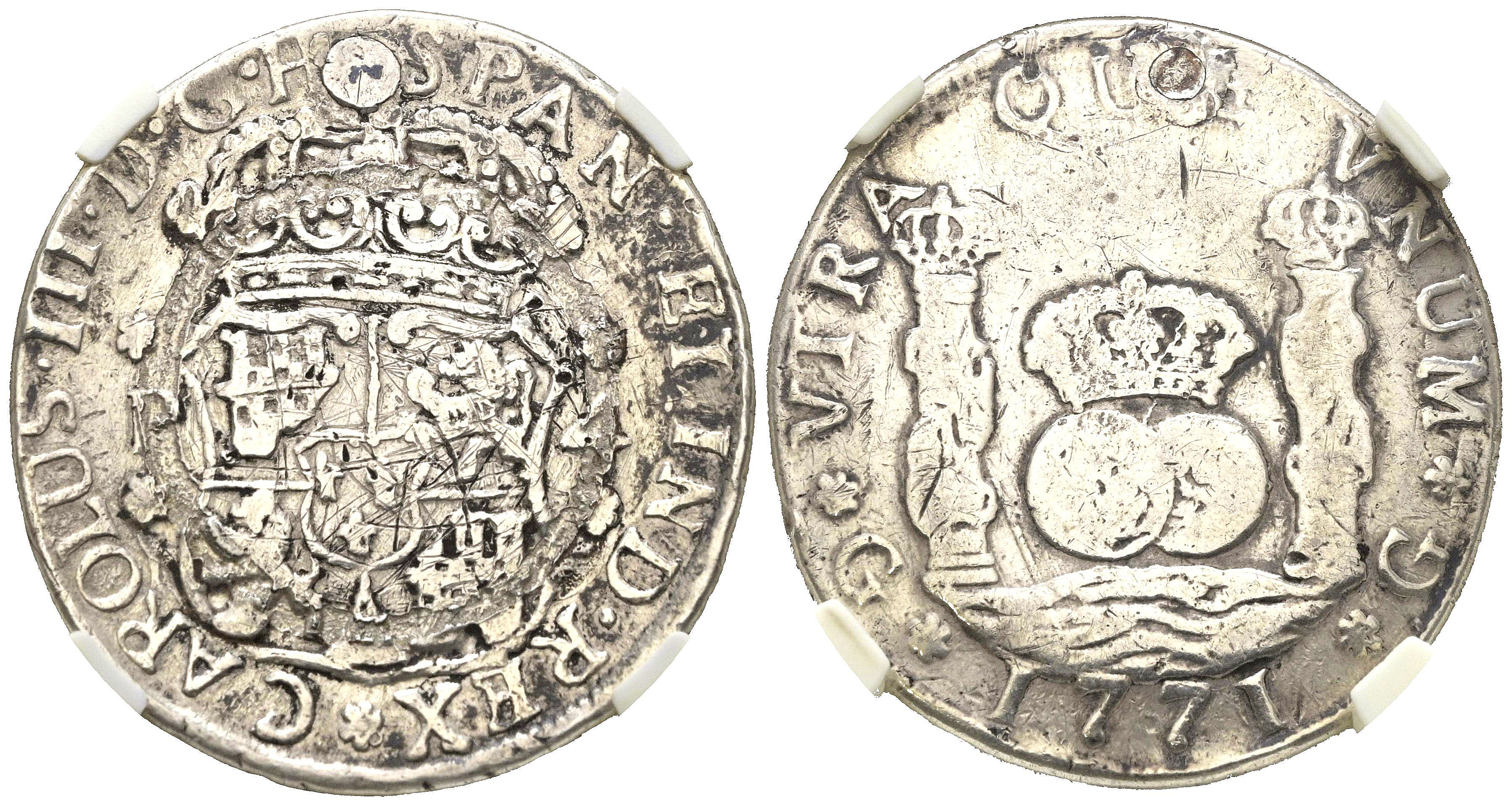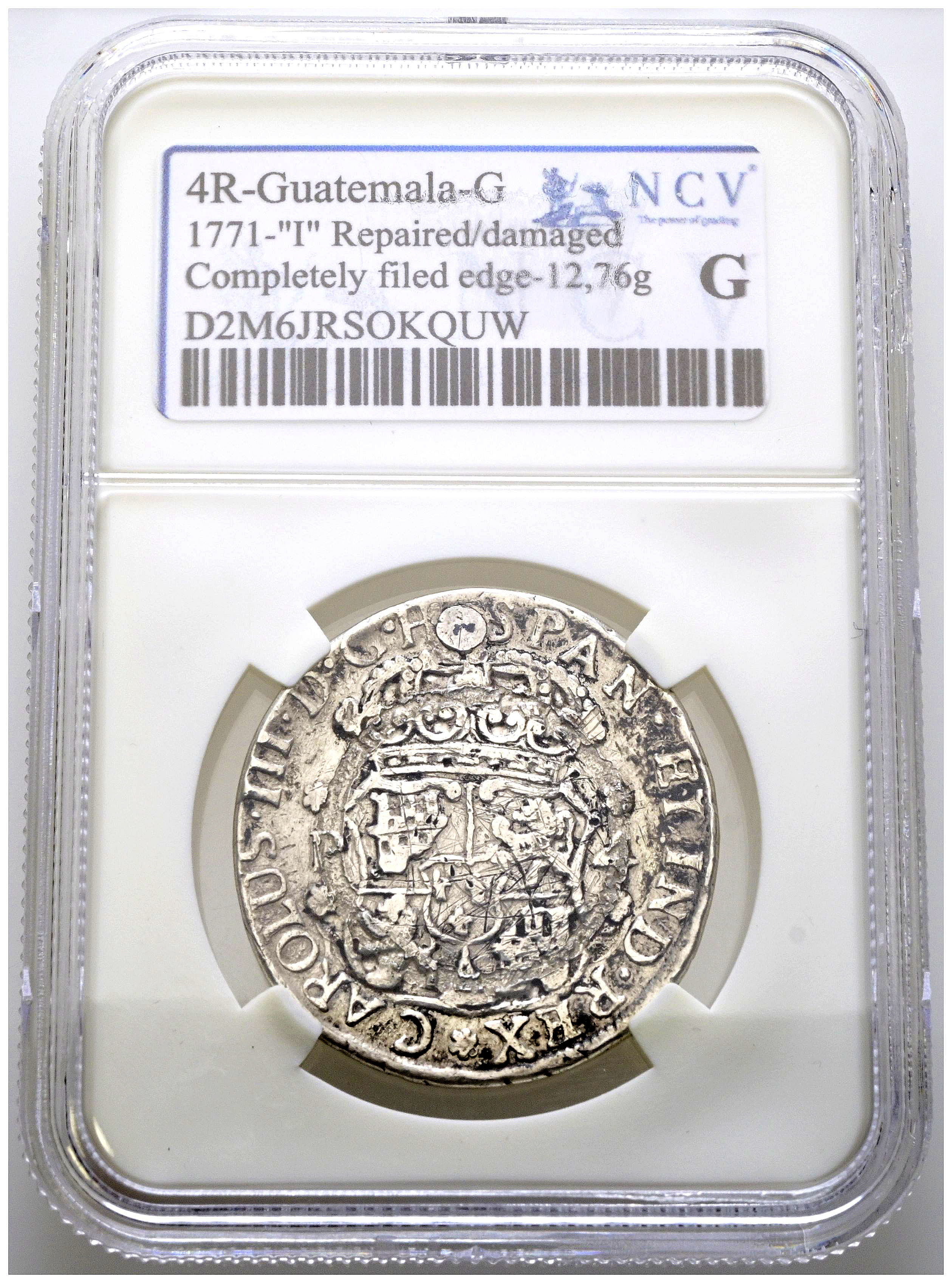 English CARLOS III (1759-1788). 4 Reales. (Ar. 12.76g/32mm). 1771. Guatemala P. (Cal-2019-802). Encapsulated by NCV G, Hole plugged and edge completely filed.