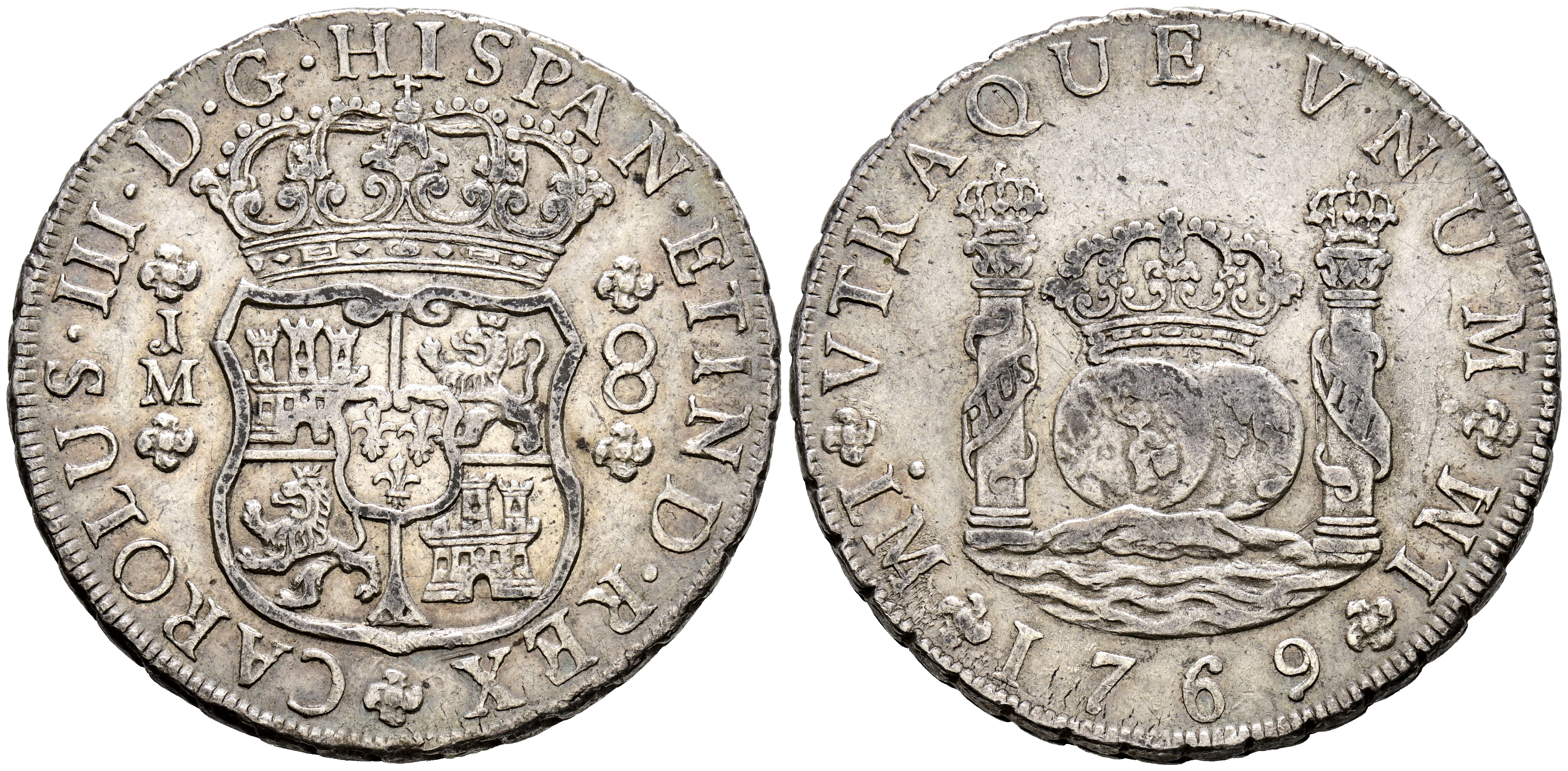 English CARLOS III (1759-1788). 8 Reales. (Ar. 26.85g/39mm). 1769. Lima JM. (Cal-2019-1029). Two reales crowns on columns. Good Very Fine/ Very Fine. Limited.
