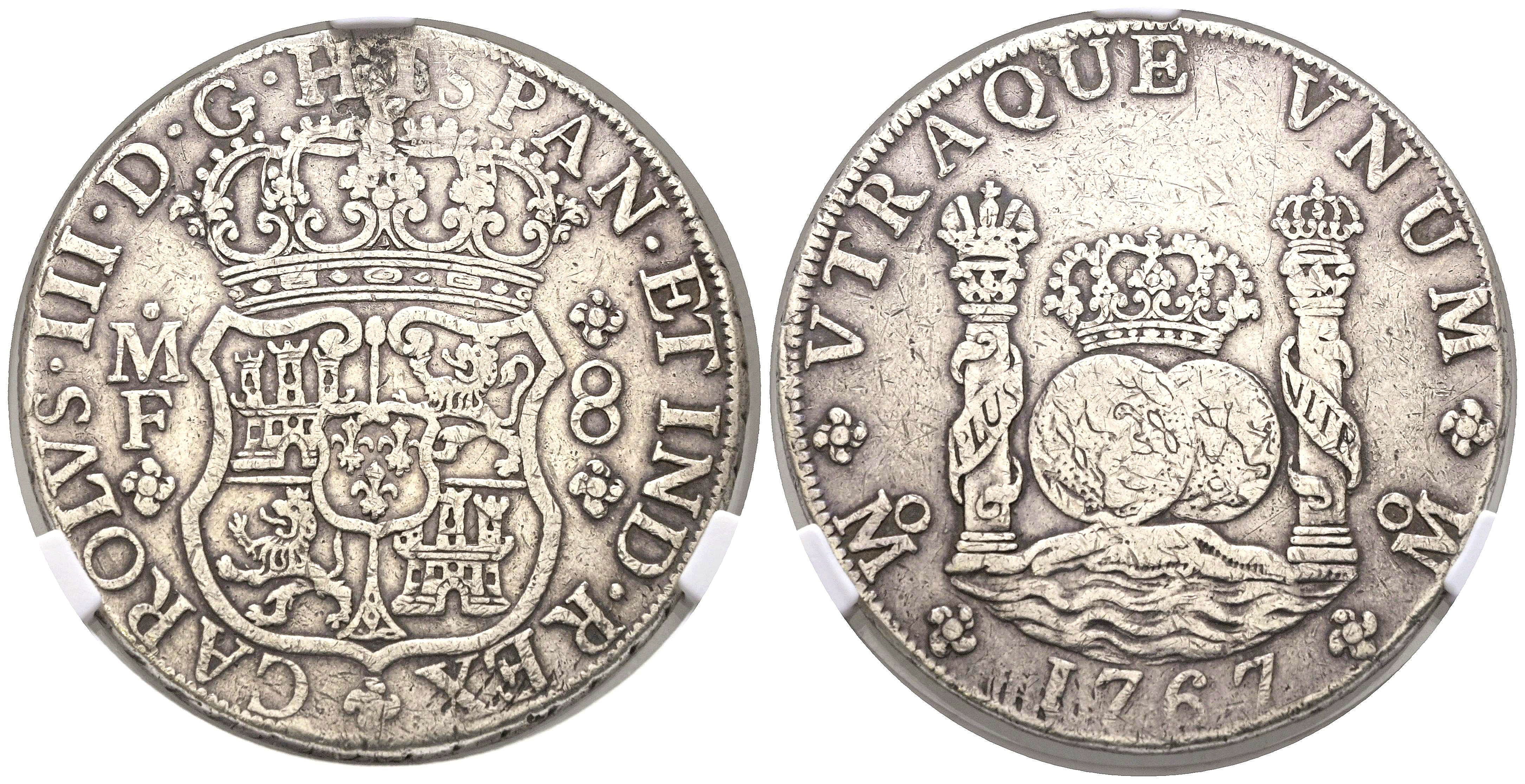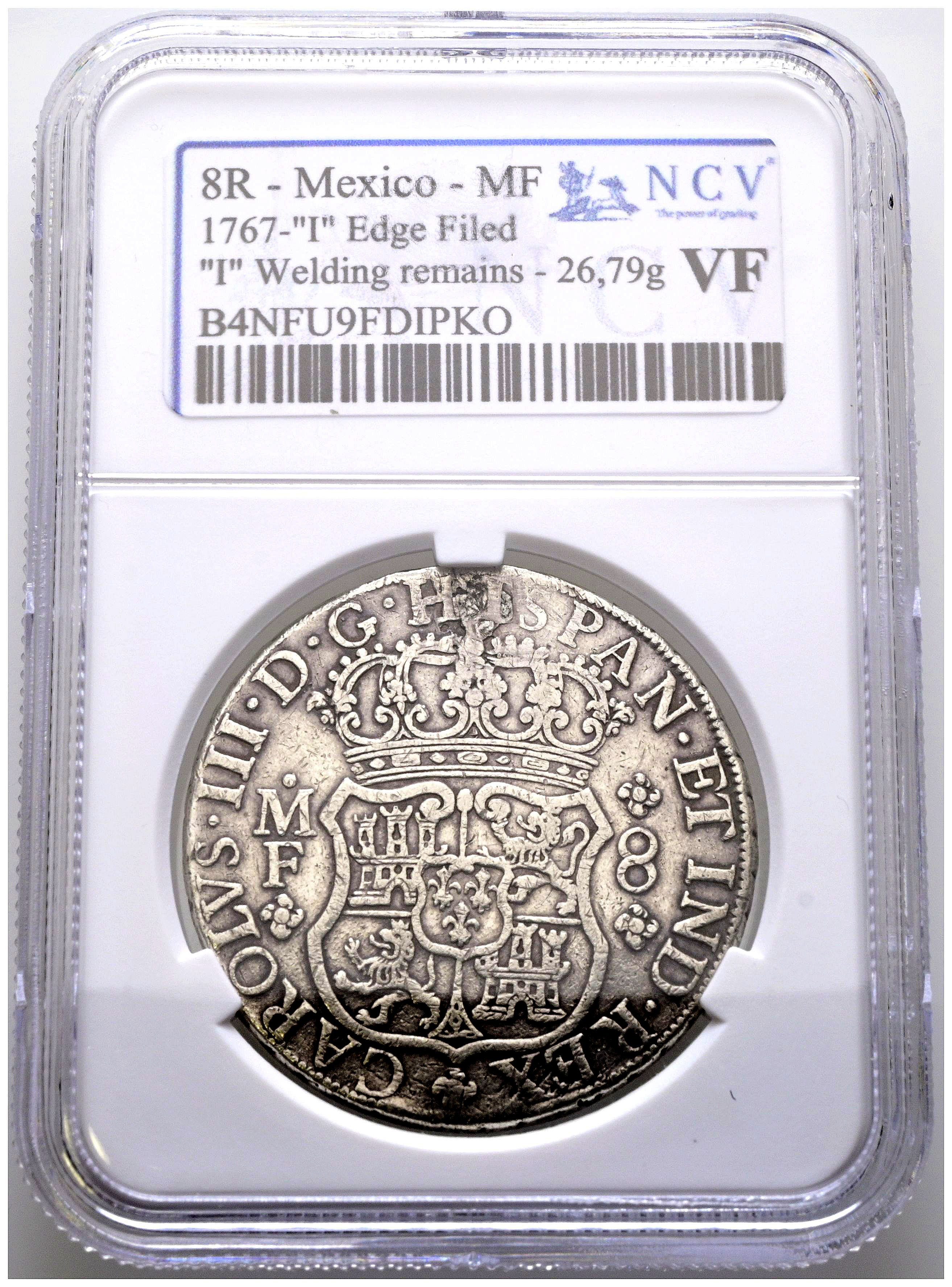 CARLOS III (1759-1788). 8 Reales. (Ar. 26.79g/39mm). 1767. Mexico MF. (Cal-2019-1092). Encapsulated by NCV VF, filed edge and welding remains.